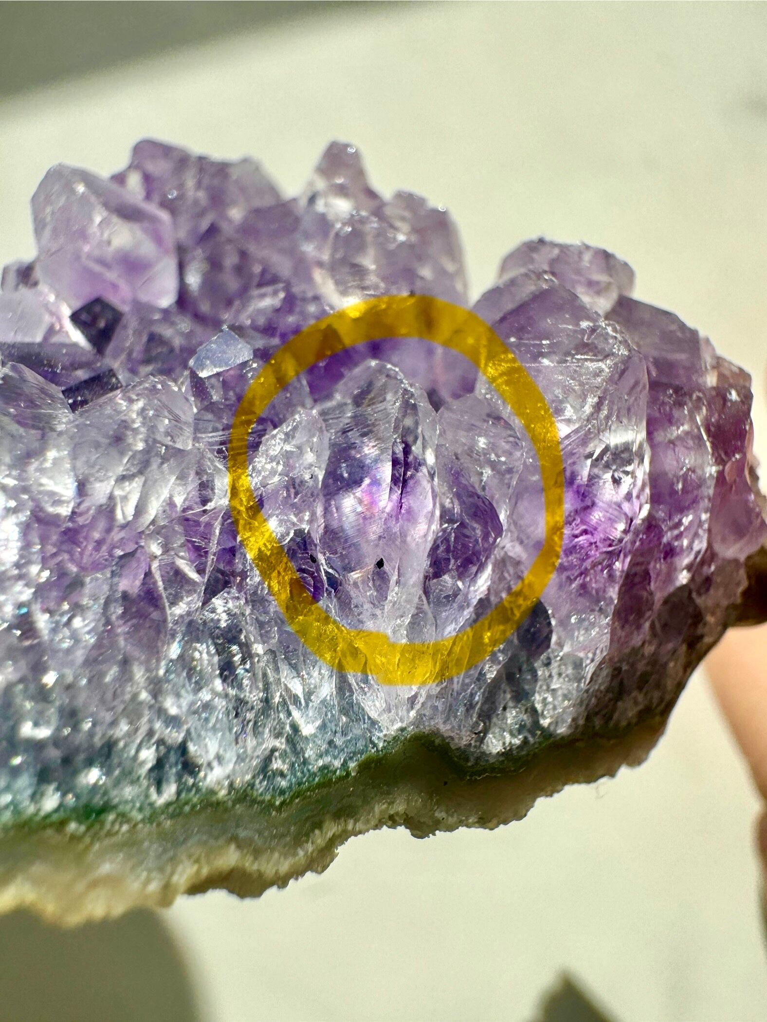 粒がしっかりしていてラベンダー紫が優しい、ブラジル産アメジストクラスターです。まるで宝石をお菓子にしたようなフォルムにも癒されます。また、所々に虹も見られとても綺麗です。