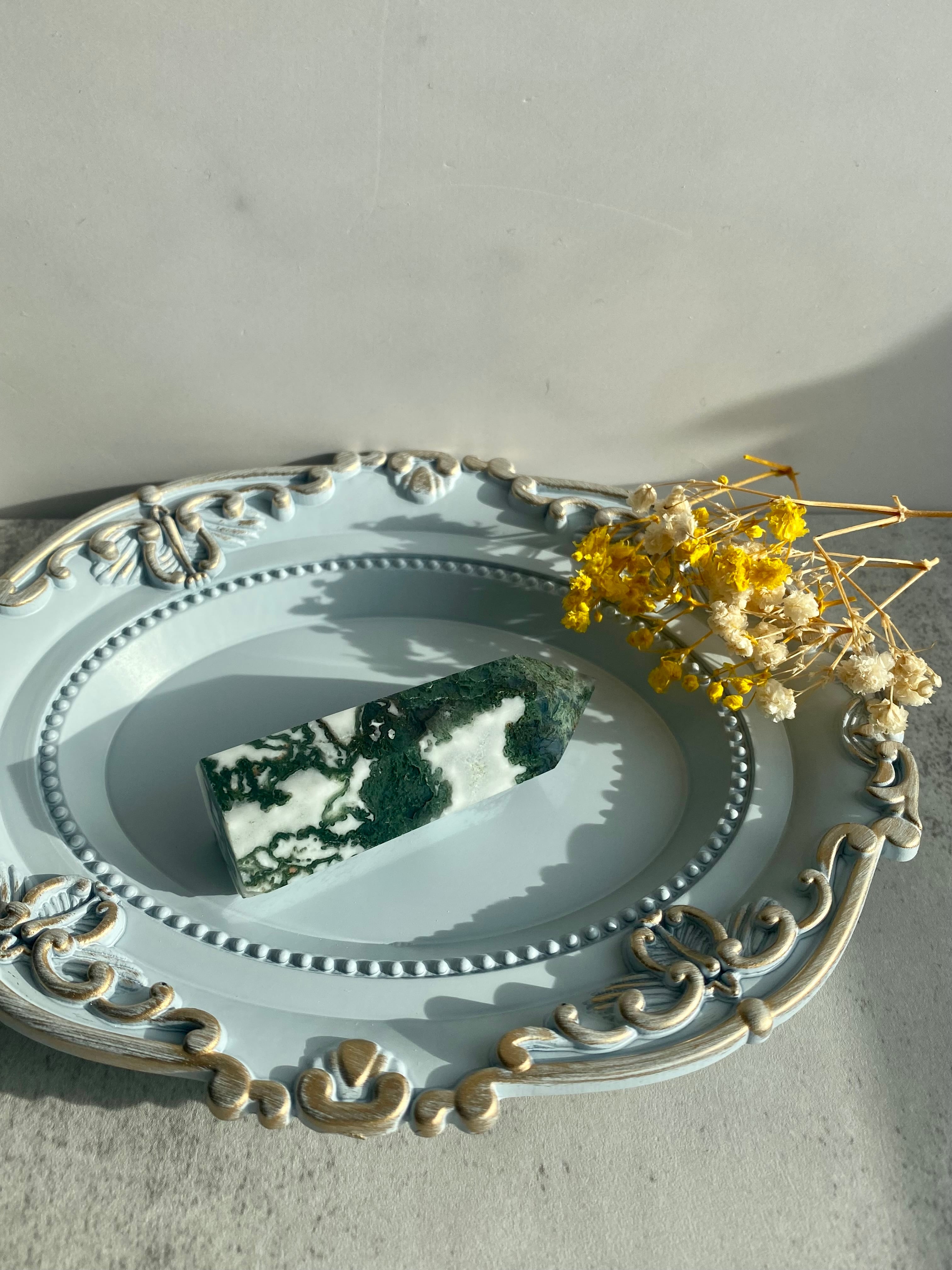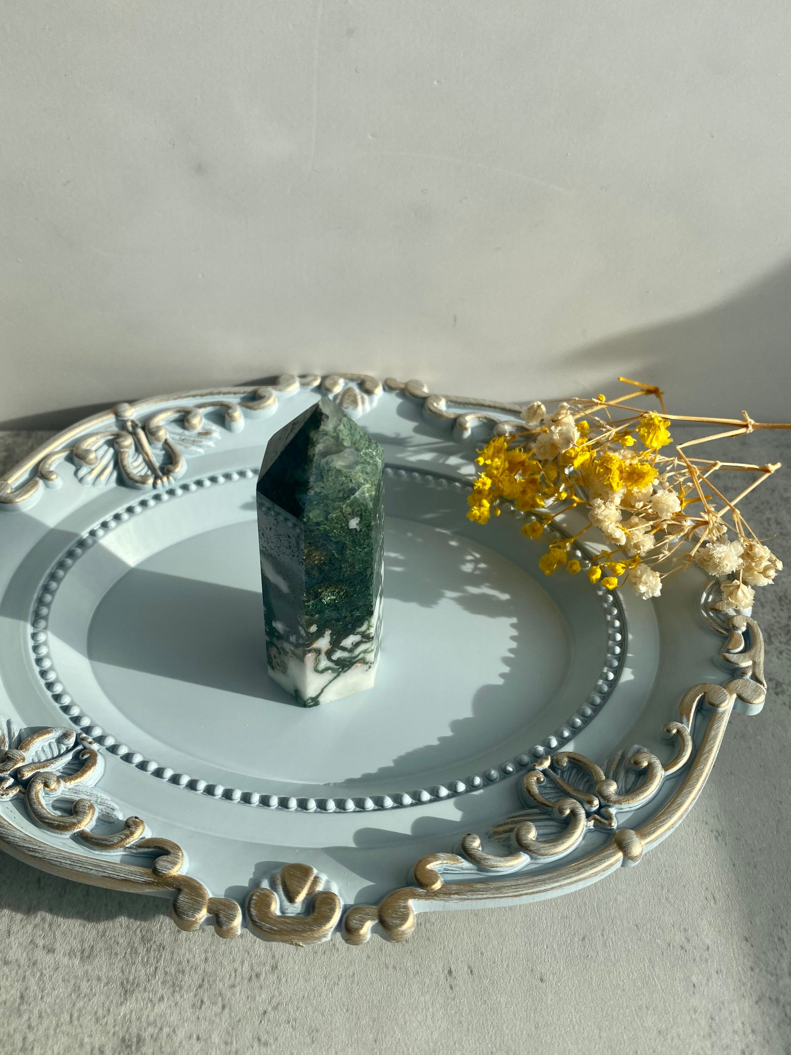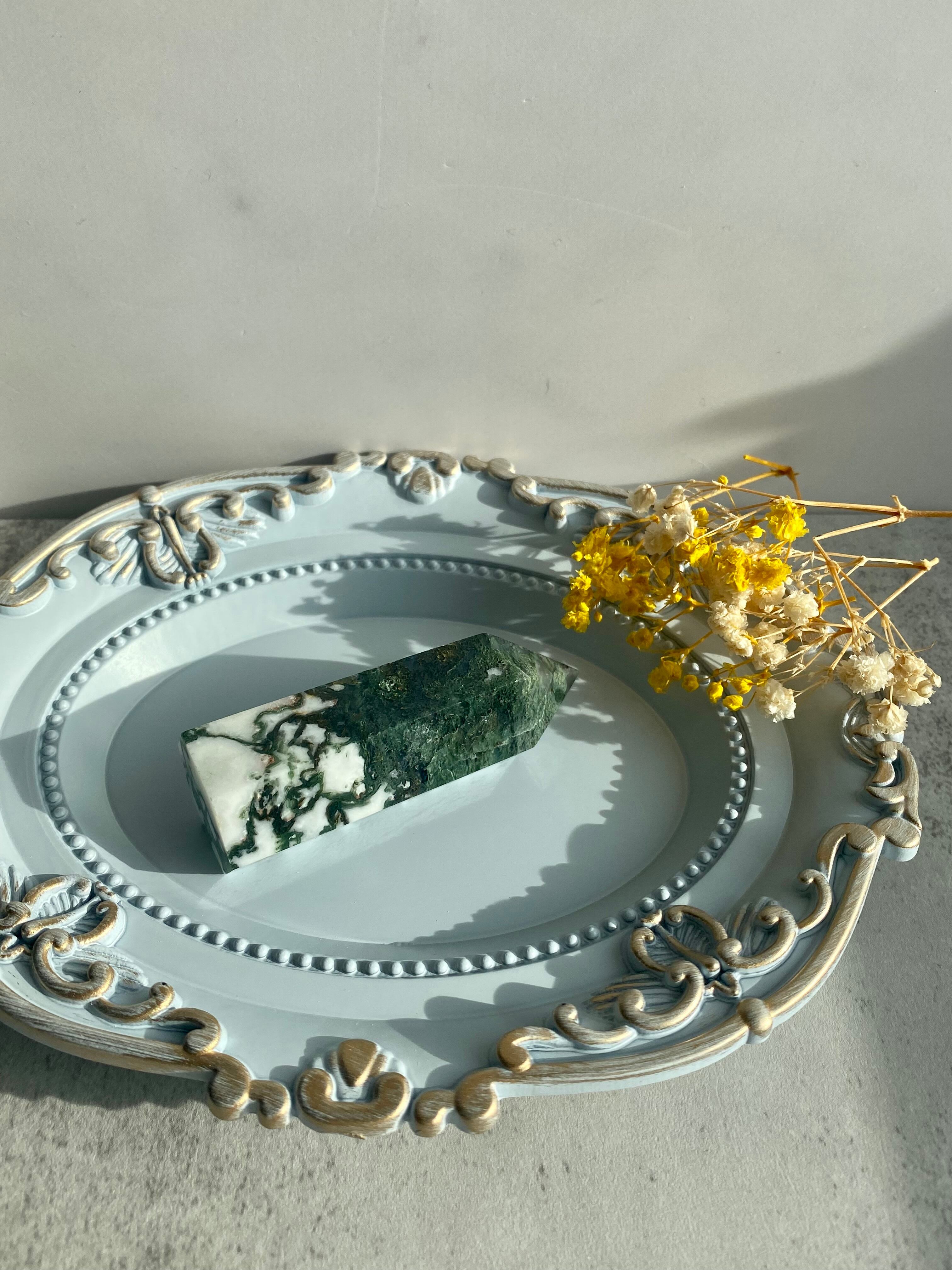 まっさらな白と綺麗なグリーンが美しいモスアゲートのタワーです。