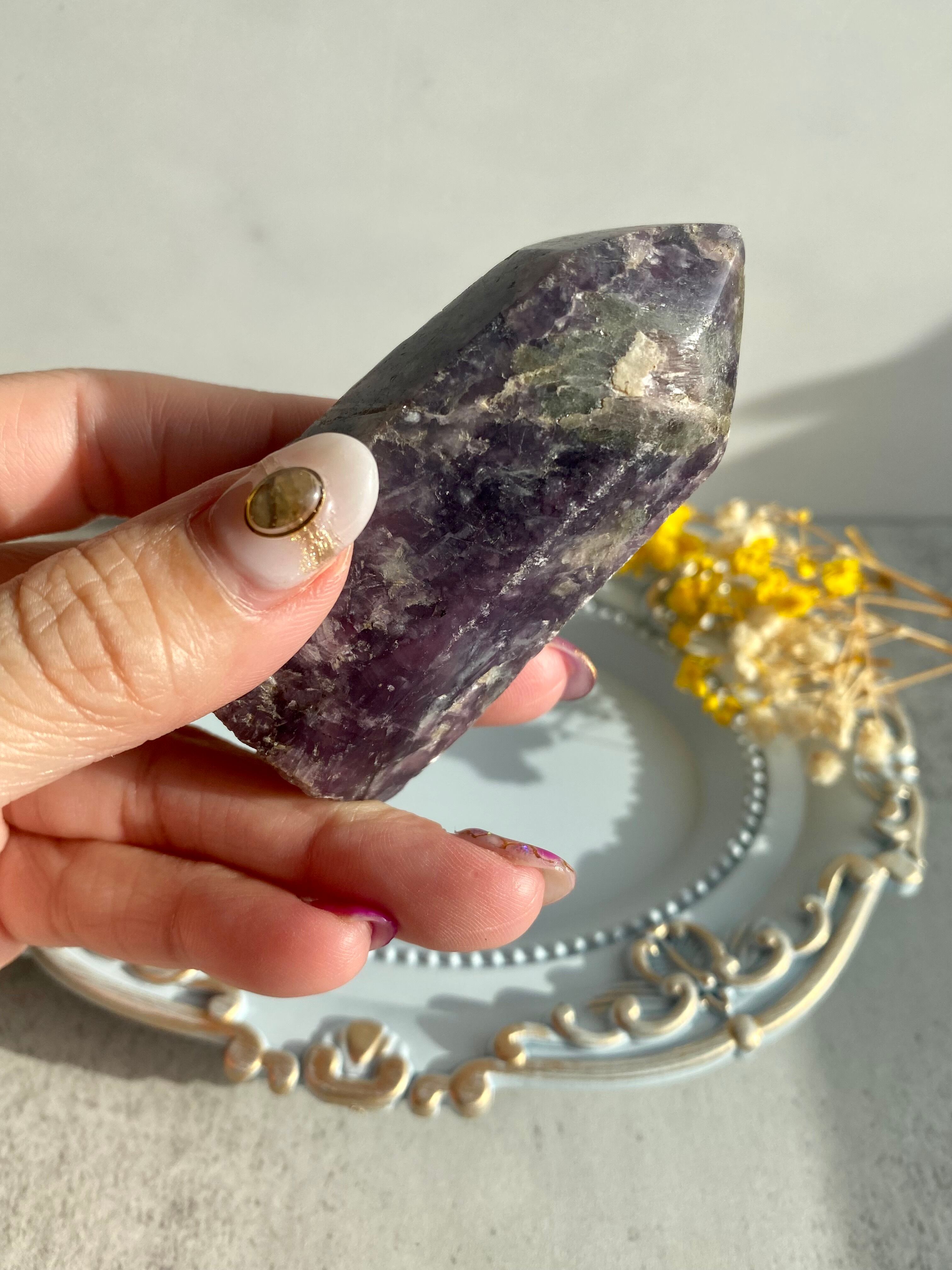 最近マダガスカルで採掘され始めた比較的新しい石です。レピドライト、ピンク トルマリン、スモーキークォーツが複合されている、とても希少な石です。複雑でありながら優しく調和しており深みのあるビジュアルが印象的です。