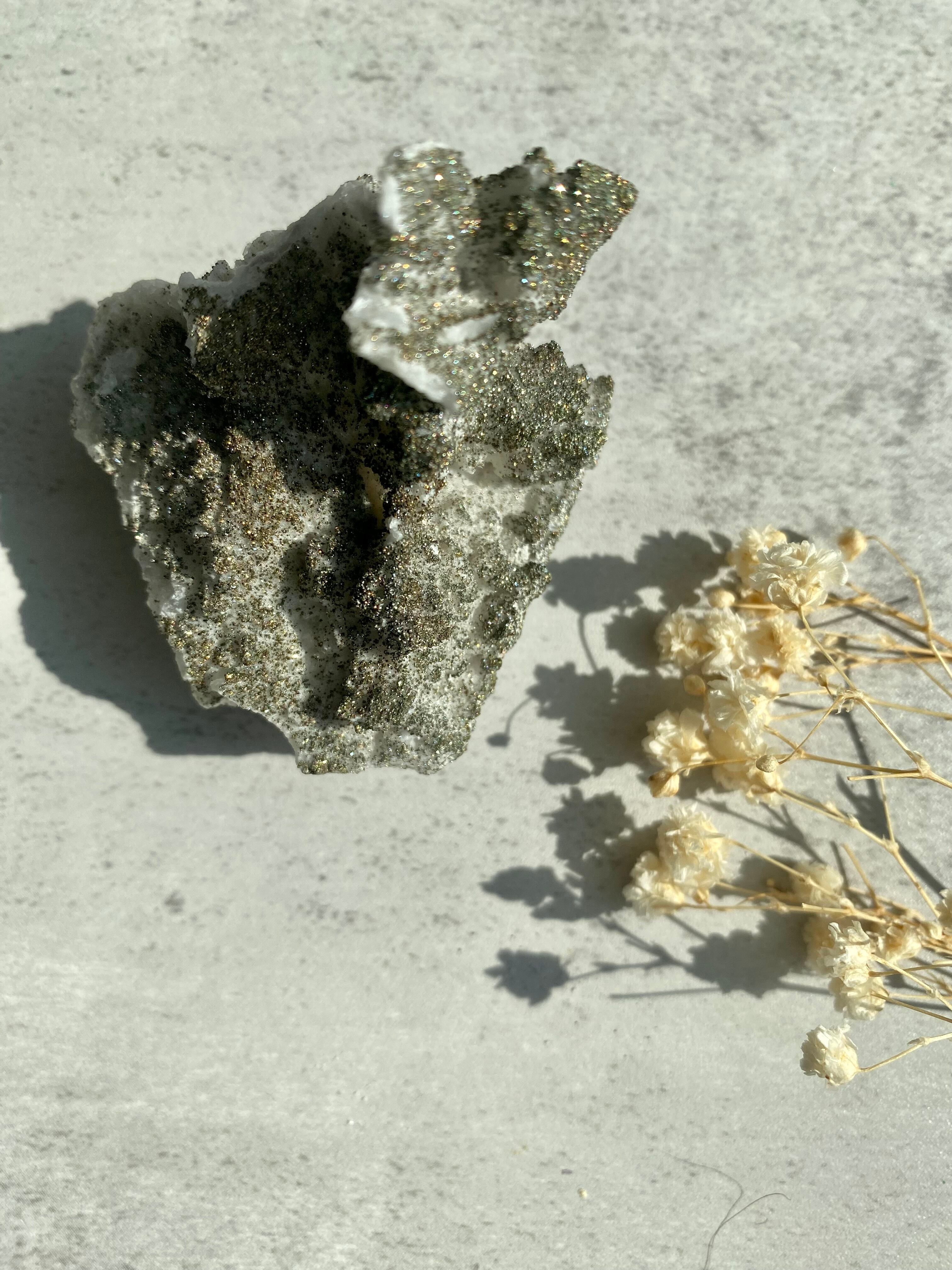 パイライトは、火山活動によって生成されたことから、大地のエネルギーを吸収し、上昇のエネルギーを持つパワフルな石です。持ち主に安定したパワーを与え、意思を強くし、行動力を高めるパワーがあります。チャンスを運び、ポジティブな方向に物事を進めます。