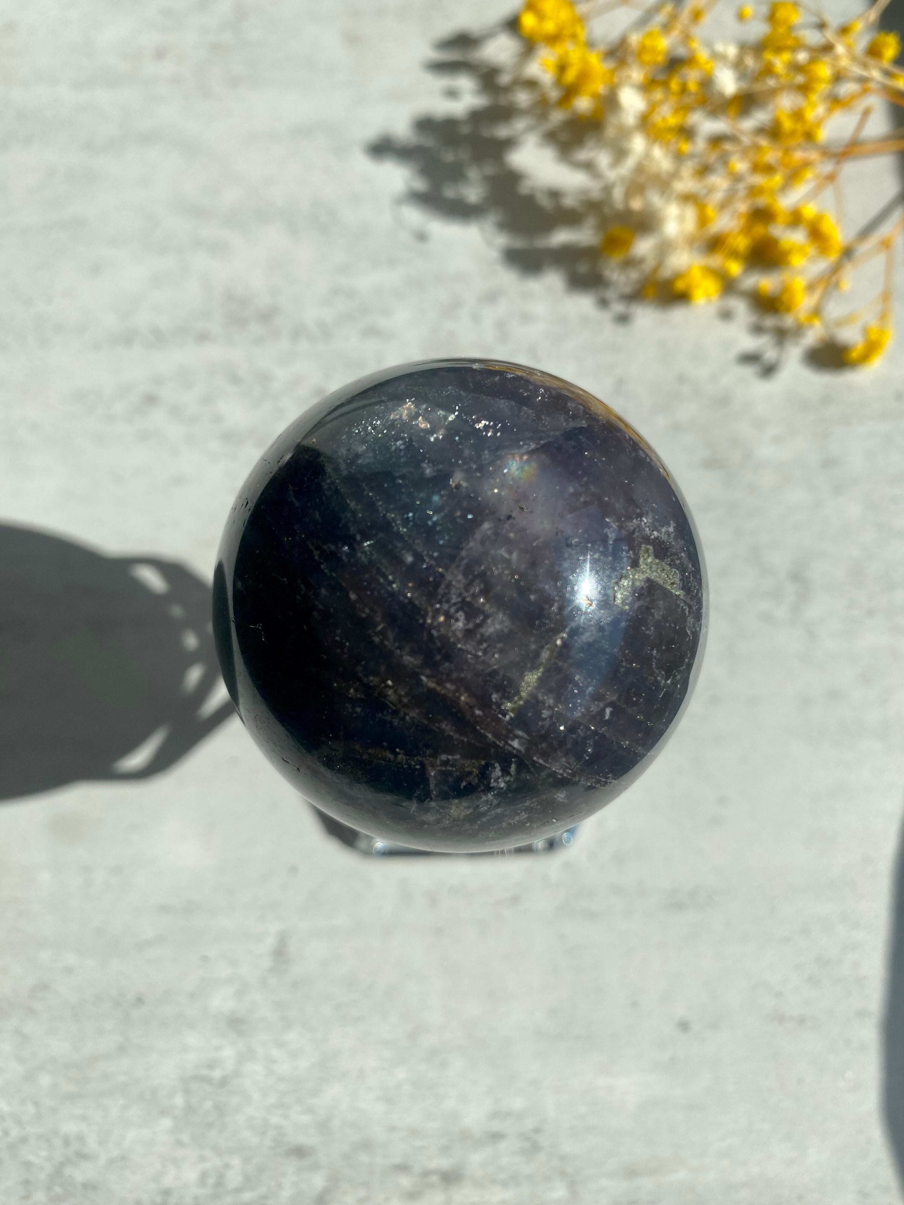遠目には黒に見えるほど濃く深いパープルのフローライトに、たっぷりのパイライトの粒子が煌めいて銀河を眺めているかのように幻想的で美しいスフィアです。