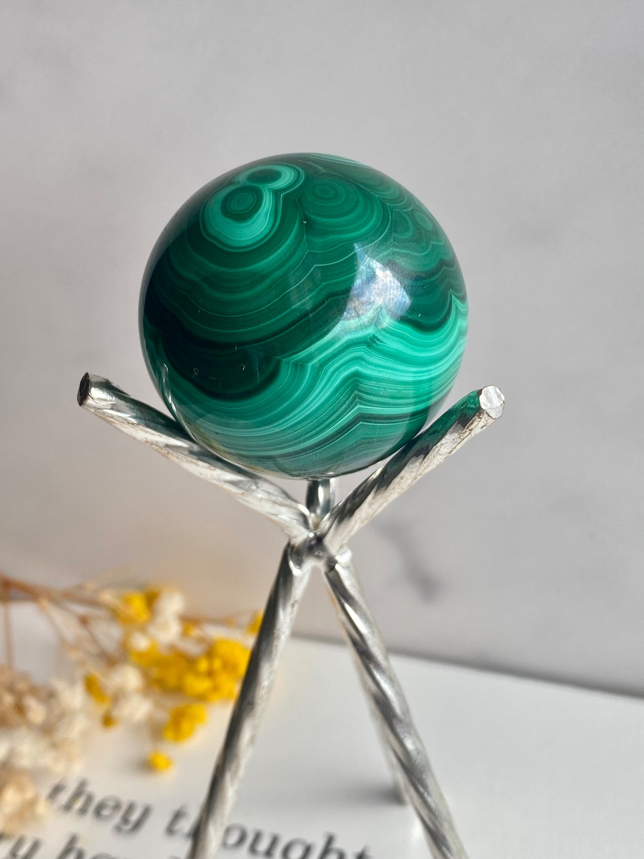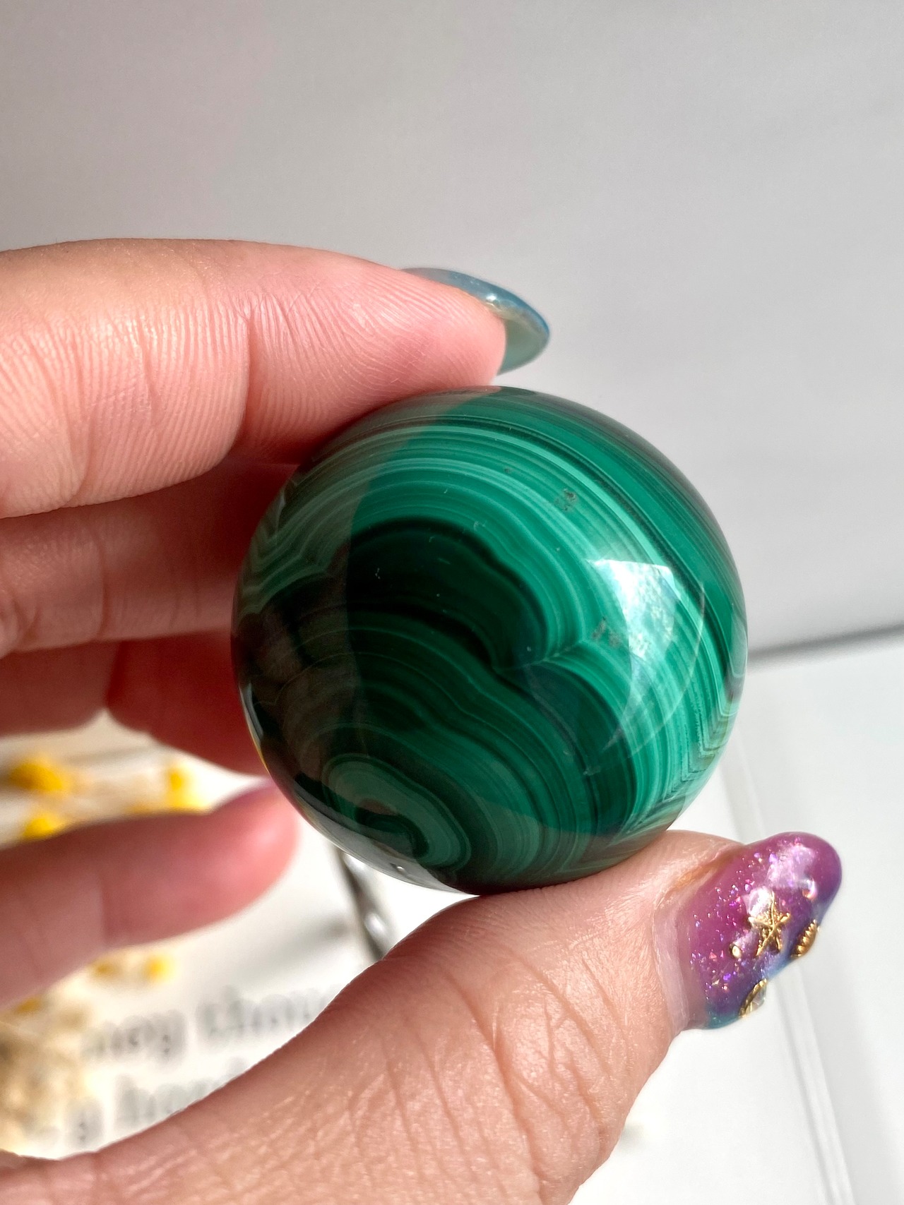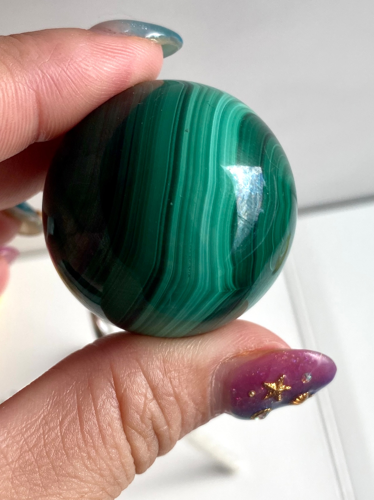 綺麗な模様のマラカイトスフィアです。深い緑に幾層にも織りなす模様がとても綺麗で目を奪われます。