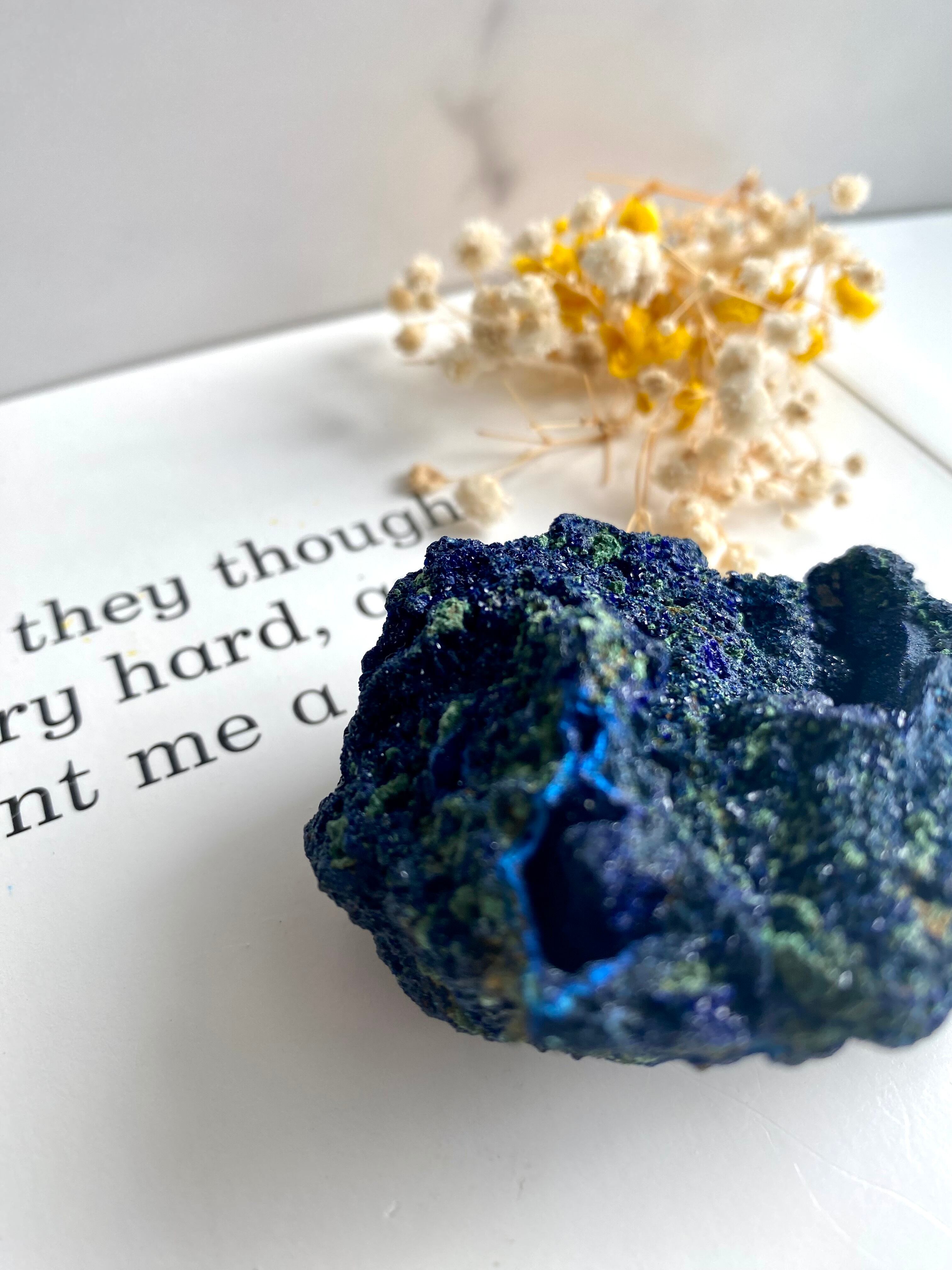 アズライトは明晰性を高めて重大な判断を助けると言われ、「事業においての決断」や「人生の分岐点」をサポートしてくれるそうです。スピリチュアルな石でもあり、直感力を高めてより高次元と繋がりやすくなるとも言われています。