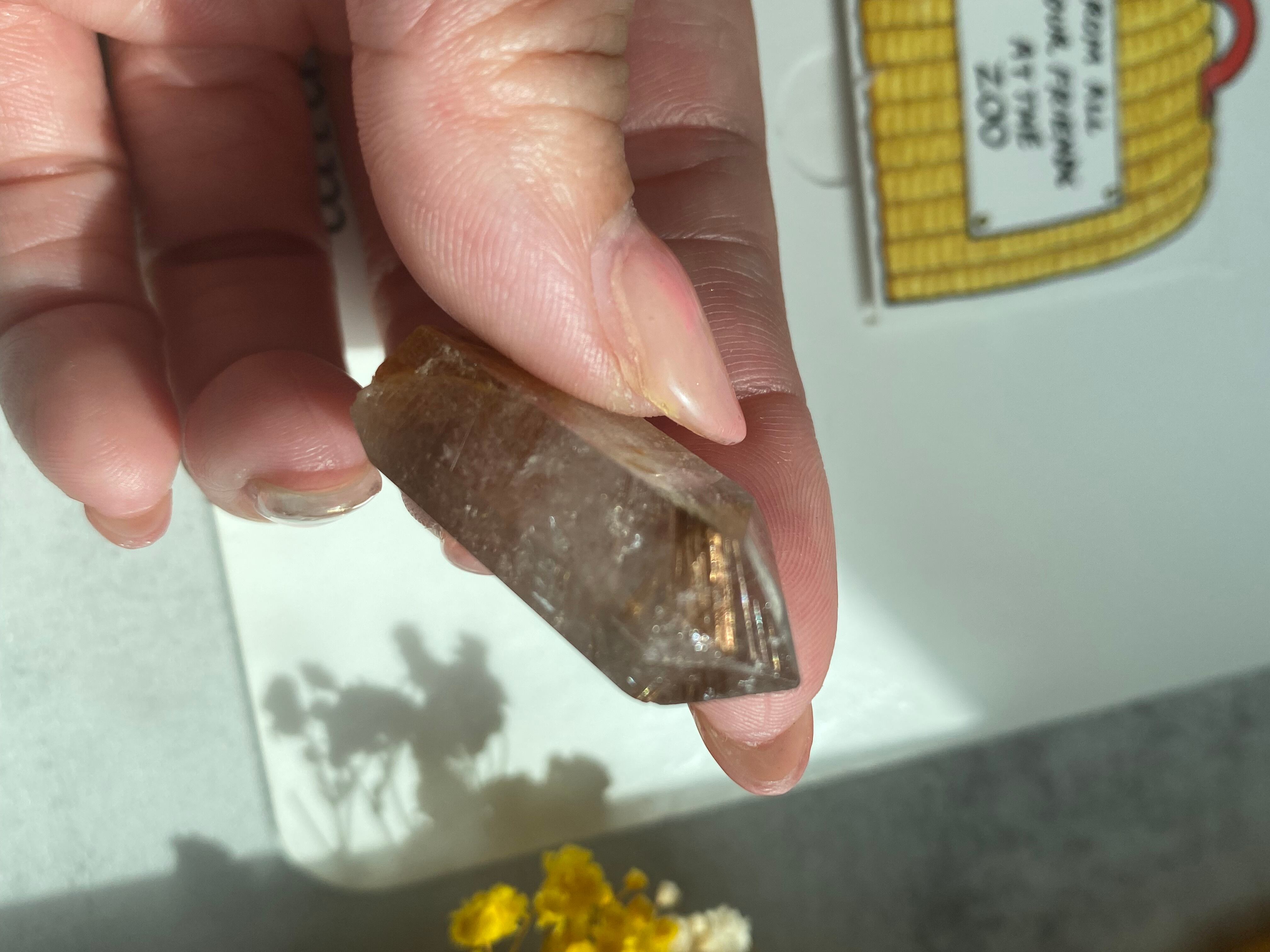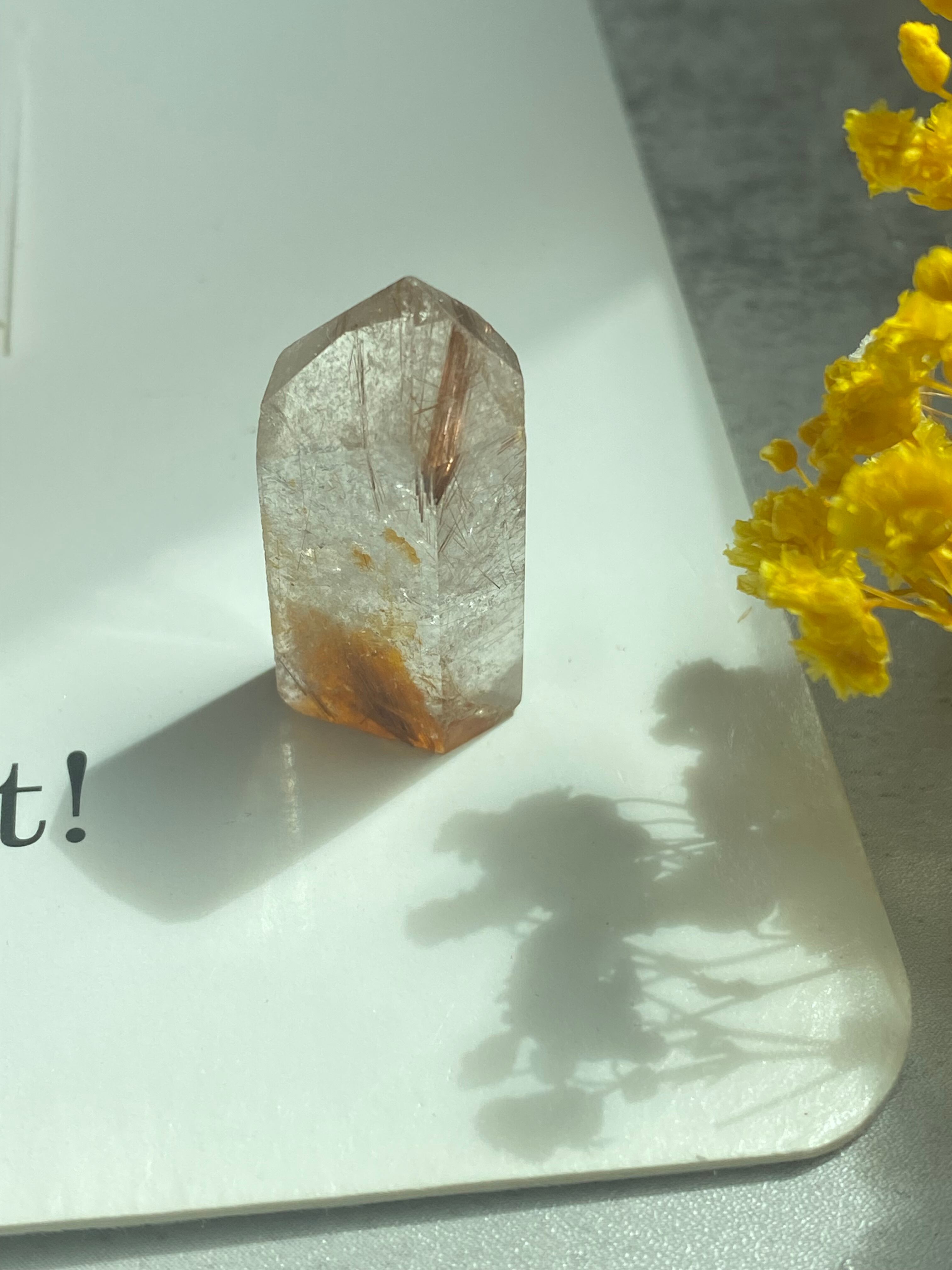 クォーツの中にゴールデンルチルとルチルの根と言われているカルサイトが入っているルチルタワーです。