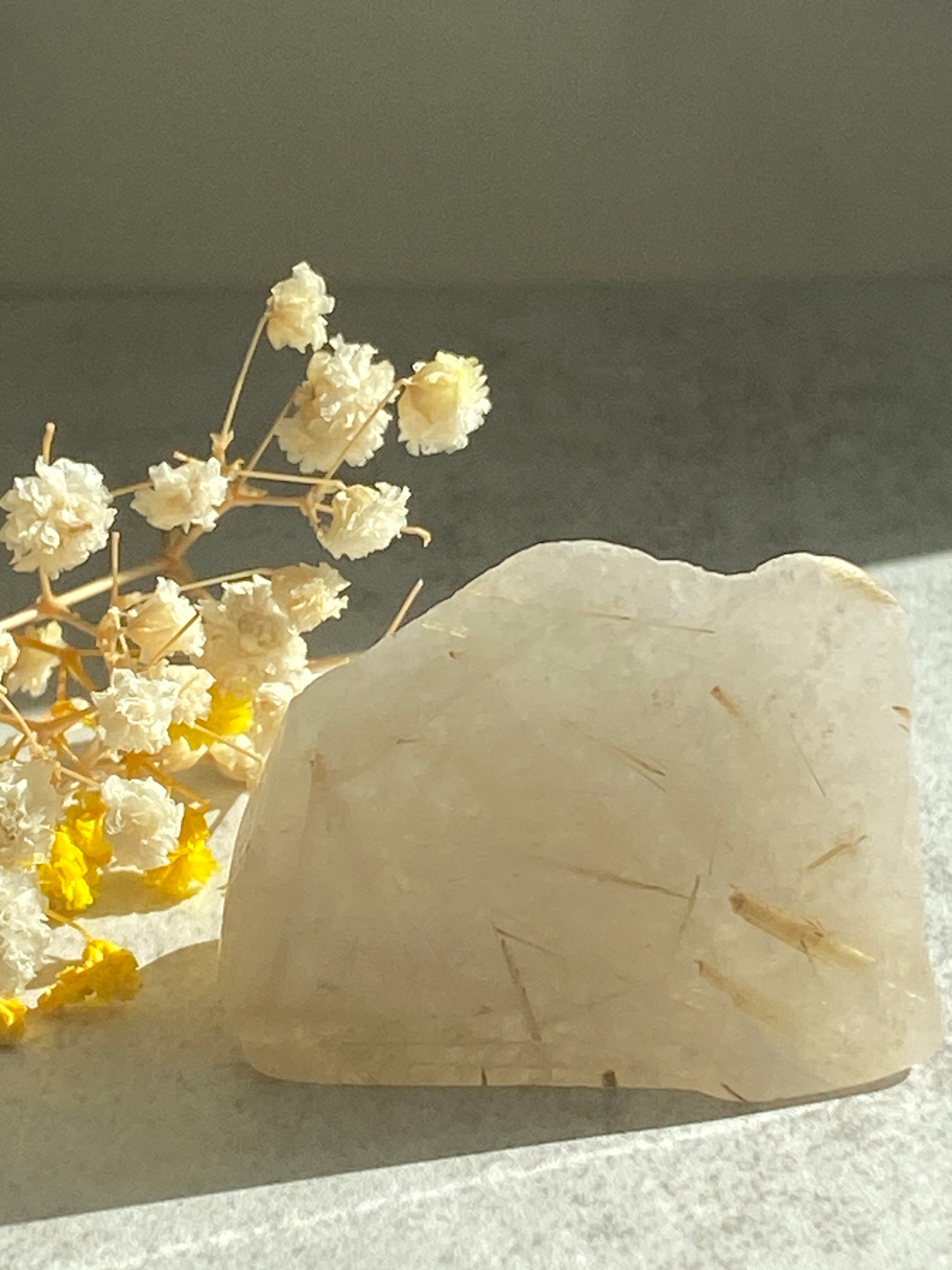 優しい色合いの中でキラキラ光るルチルが印象的なタンブルです。
