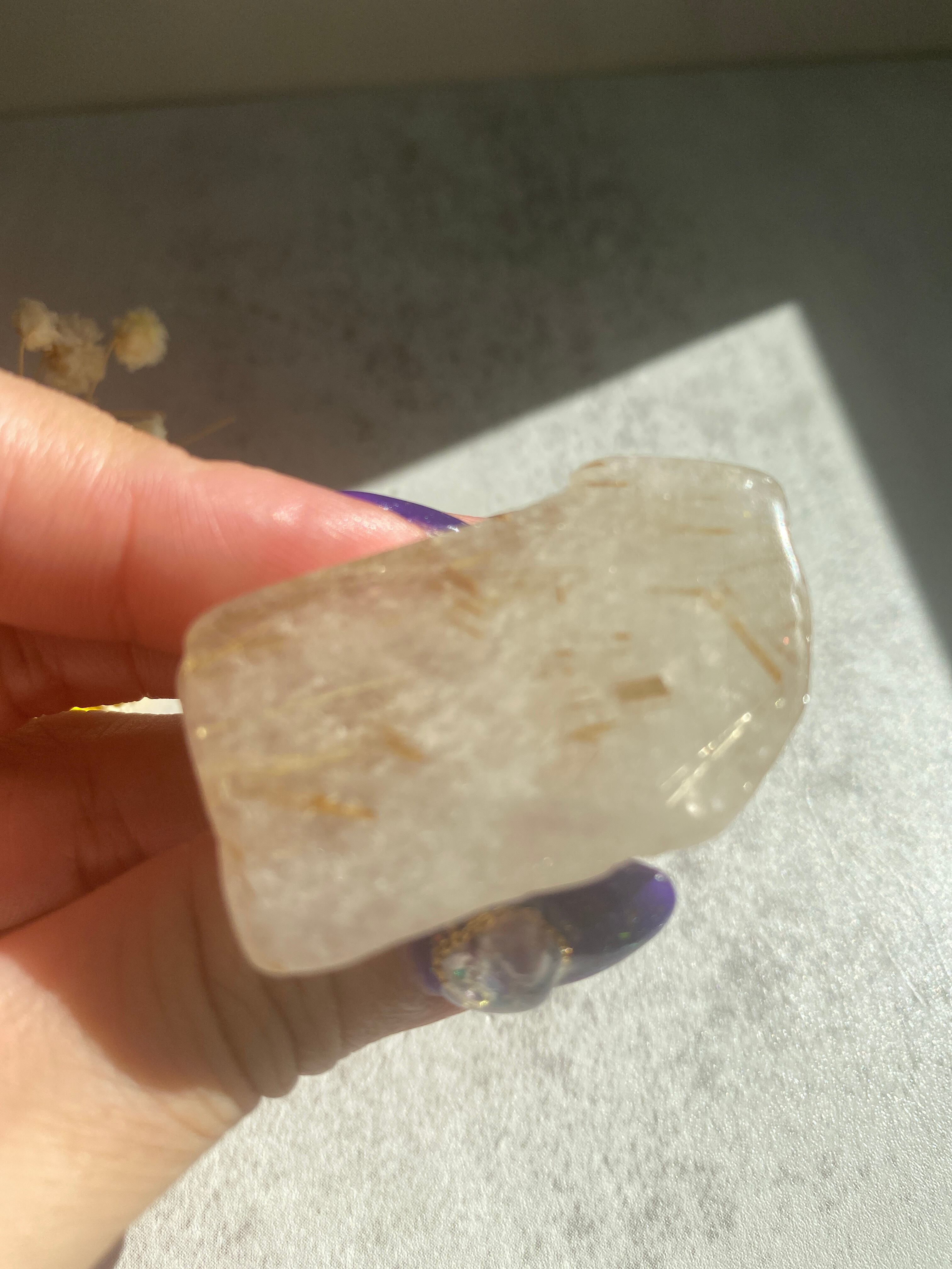クォーツの中にゴールデンルチルが入っていて可愛らしい形のルチルタンブルです。