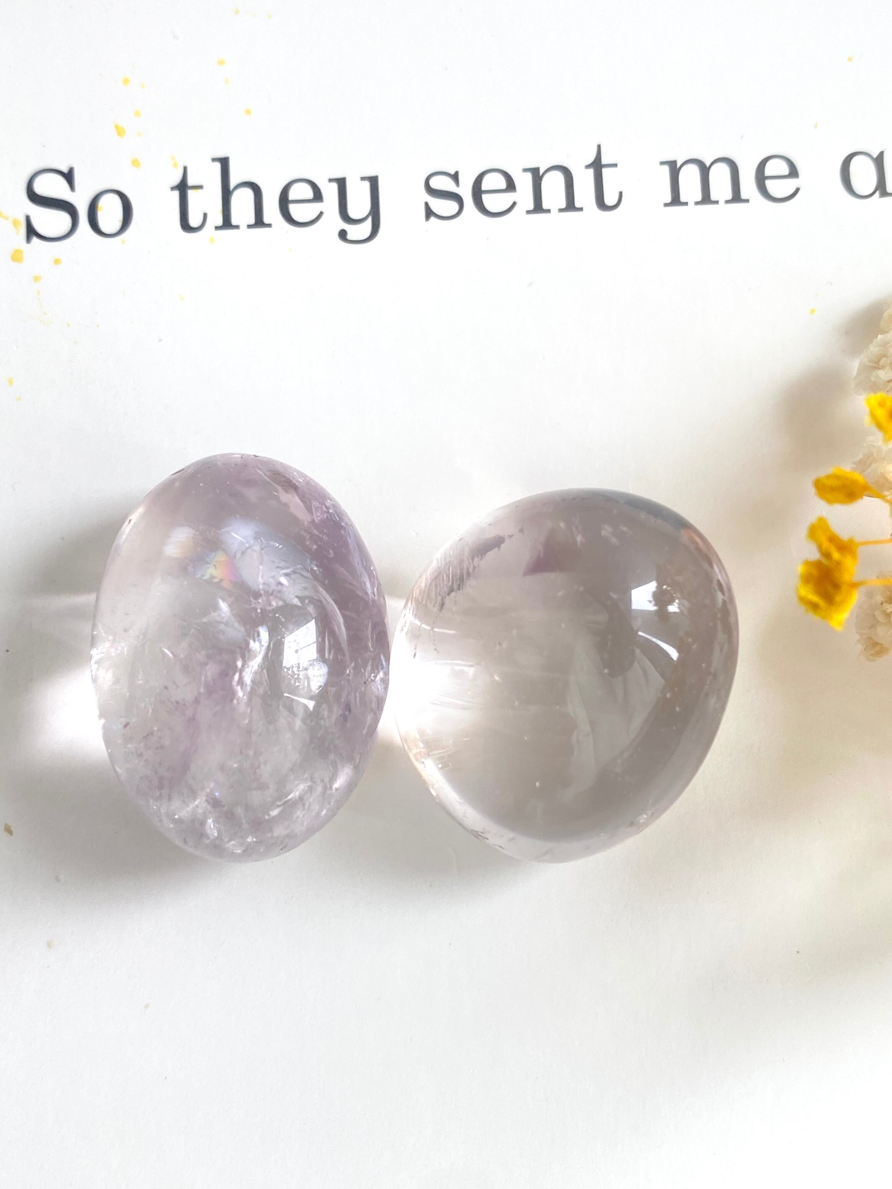 アメジストとクリアクォーツのタンブルです。アメジストは数か所のレインボーが優しく光ります。