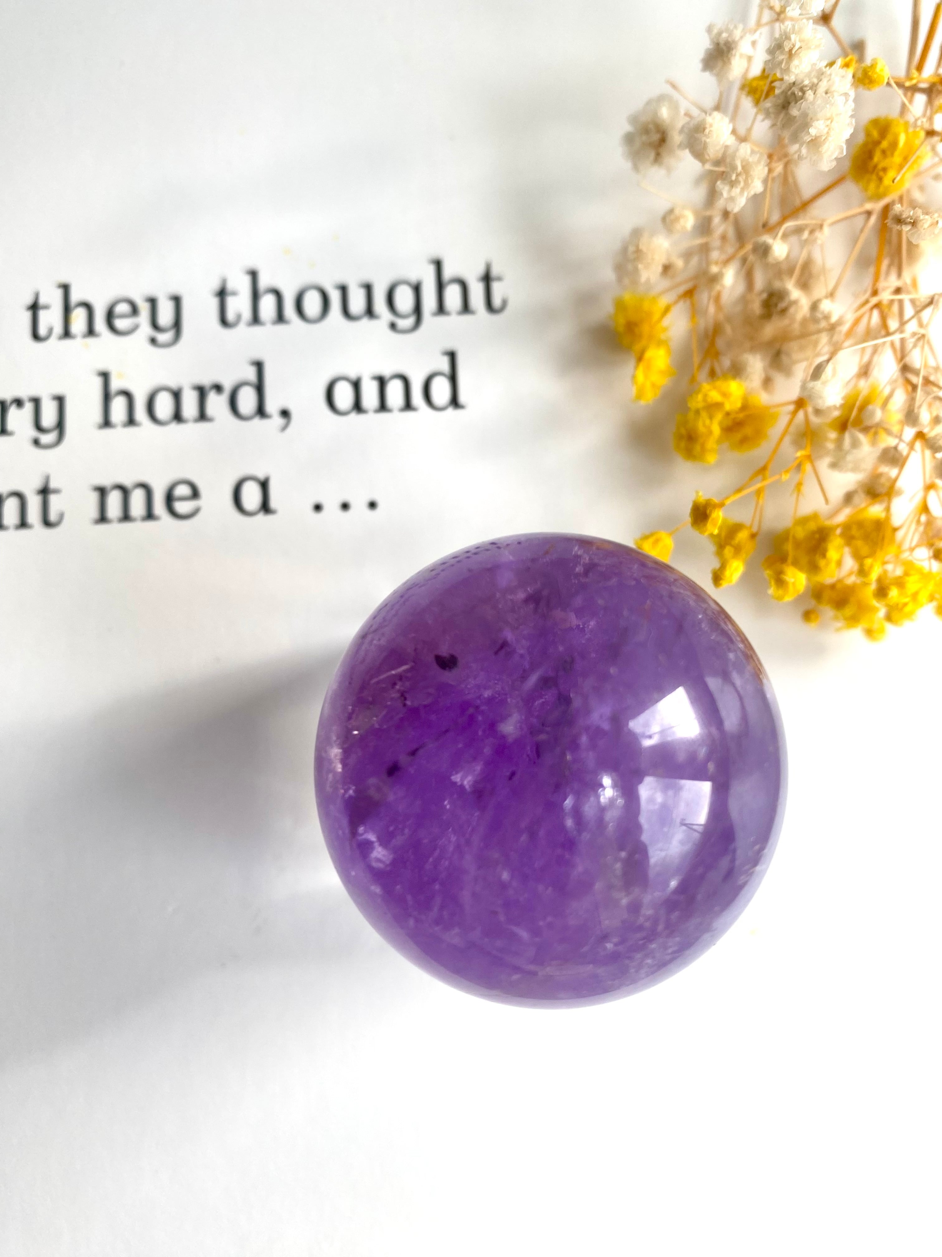 アメジストのスフィアです。透明度のあるアメジストにレインボーが優しく光ります。