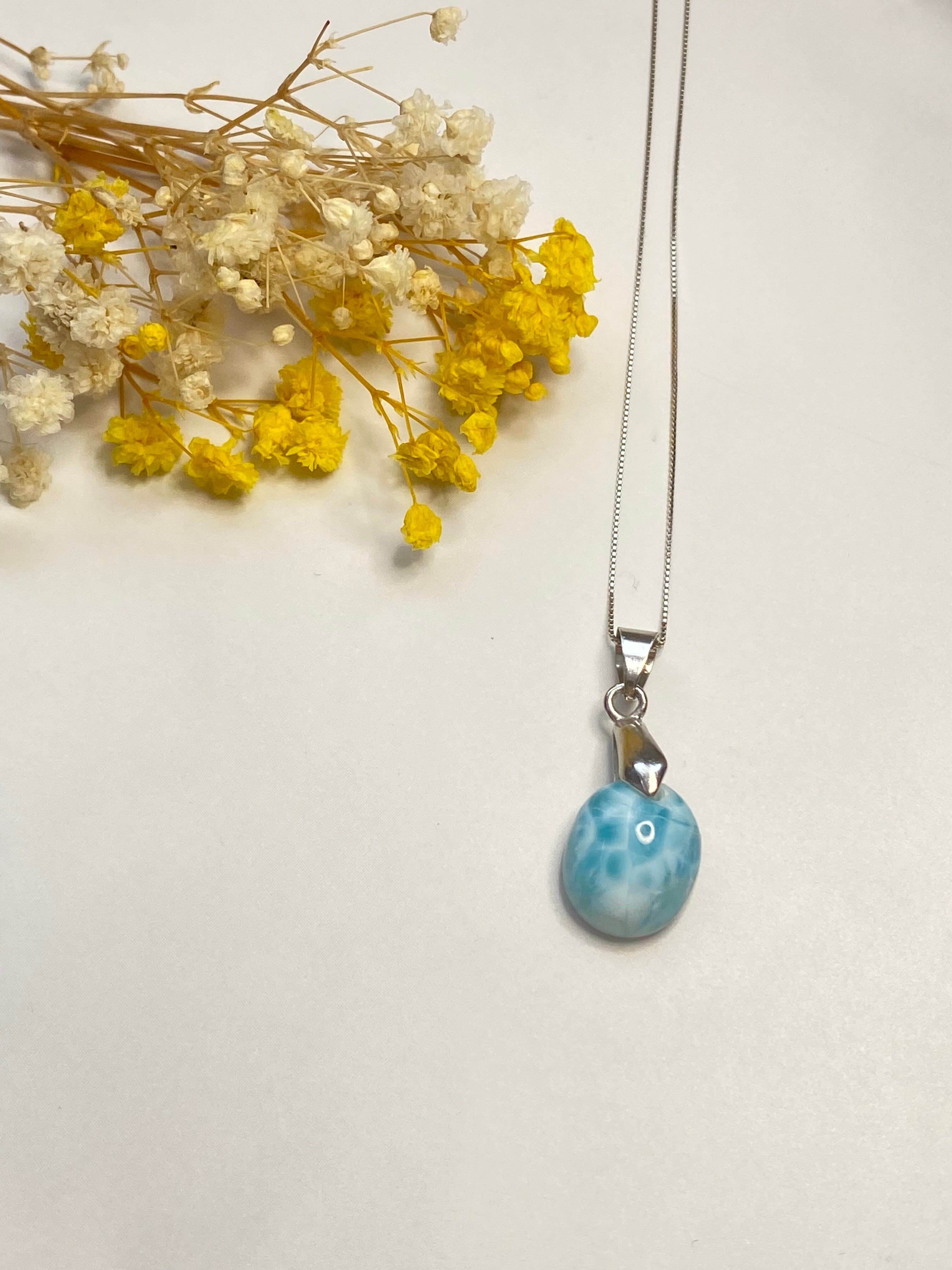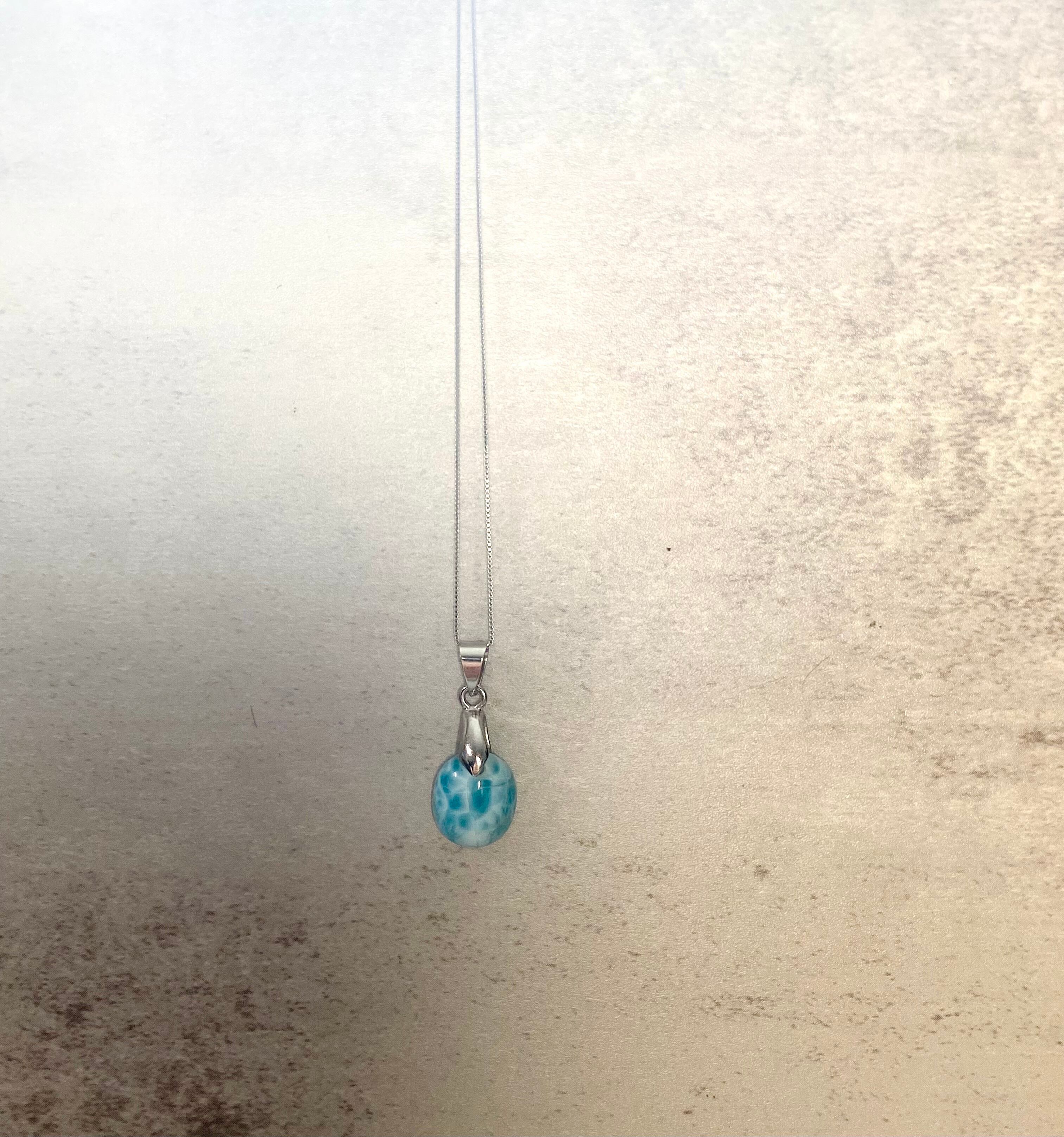 青と白のカラーがきれいな目を奪われるラリマーのネックレスです。