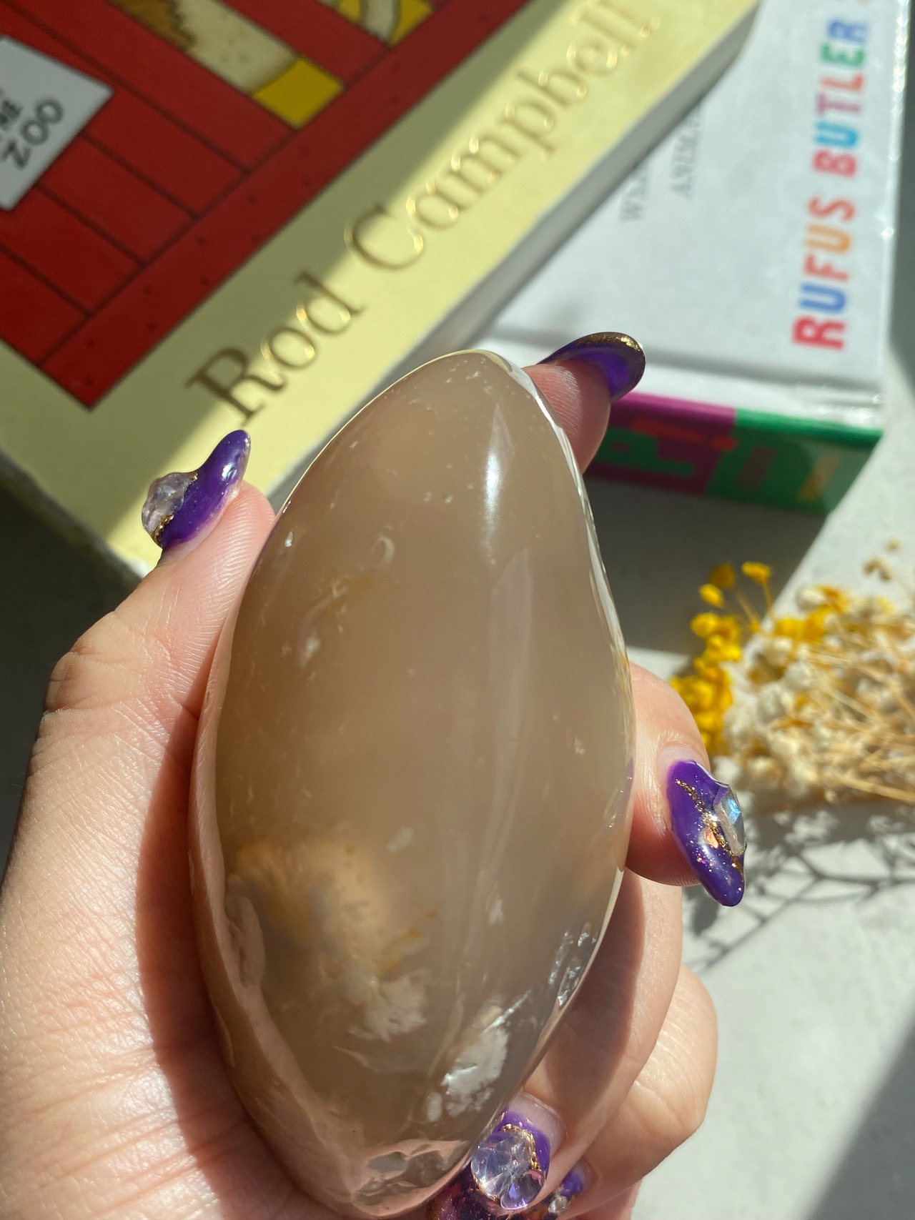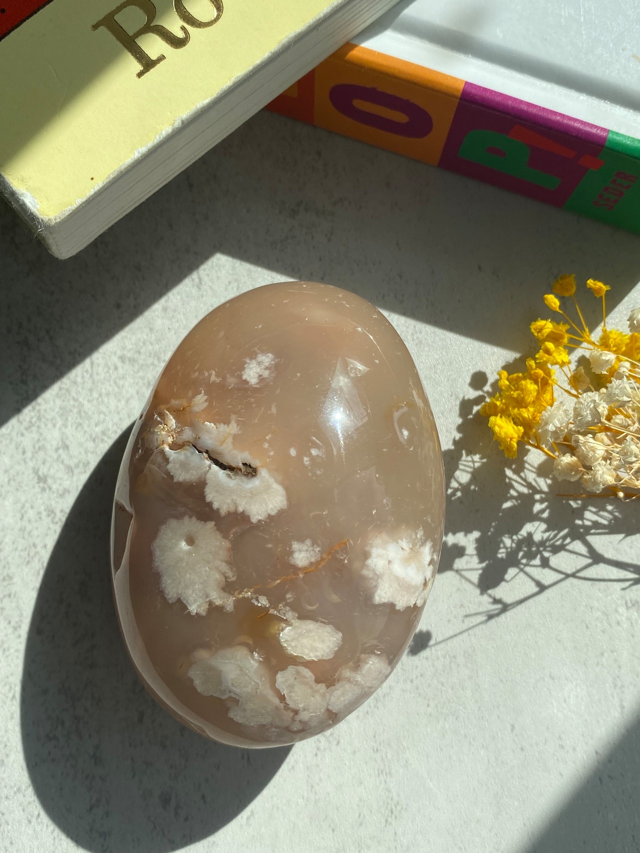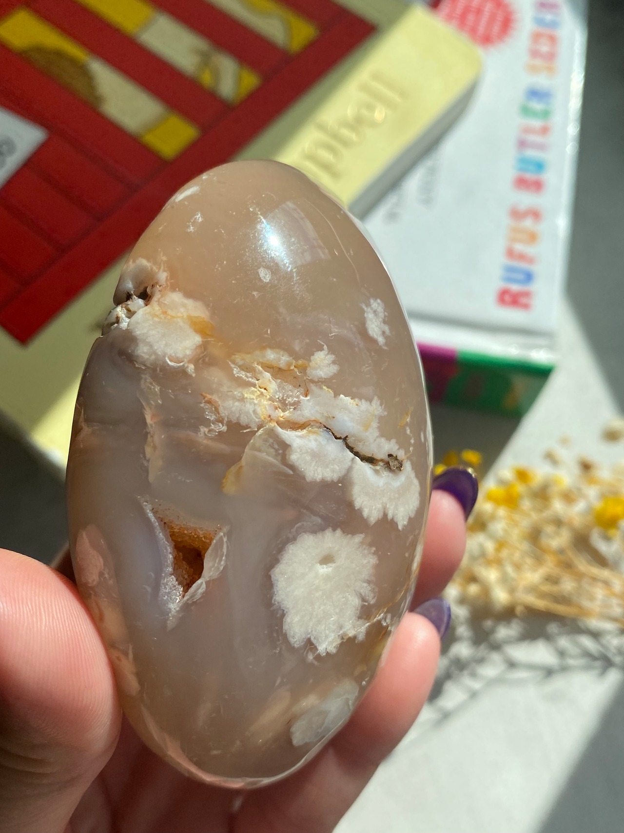 ピンクの石に白いお花が咲いているとっても可愛らしいピンクフラワーアゲートのタンブルです。握り石や、お気に入りのアロマオイルをほんの少し馴染ませたり瞑想時に使用すると心が落ち着き、癒しを得ることができます。
