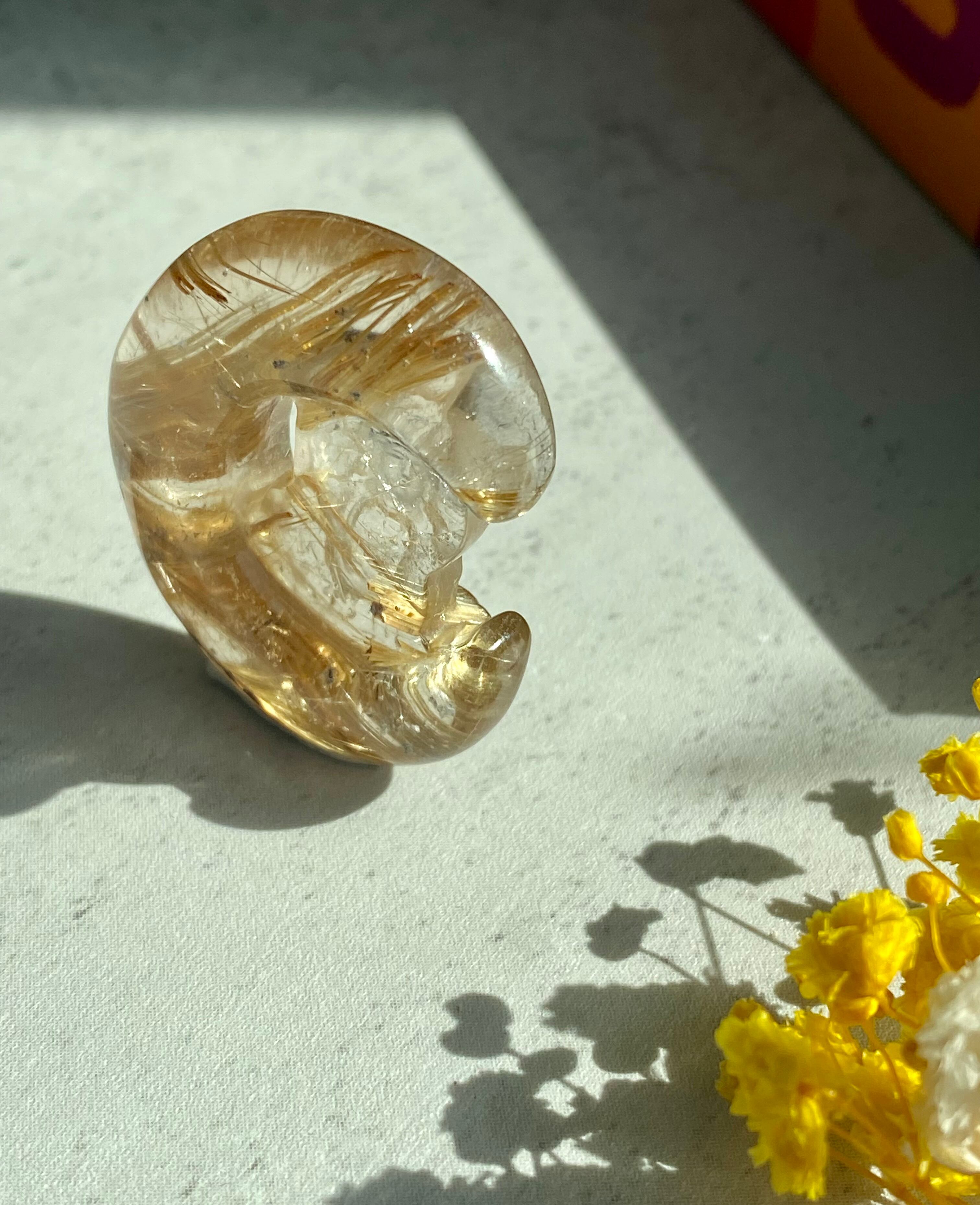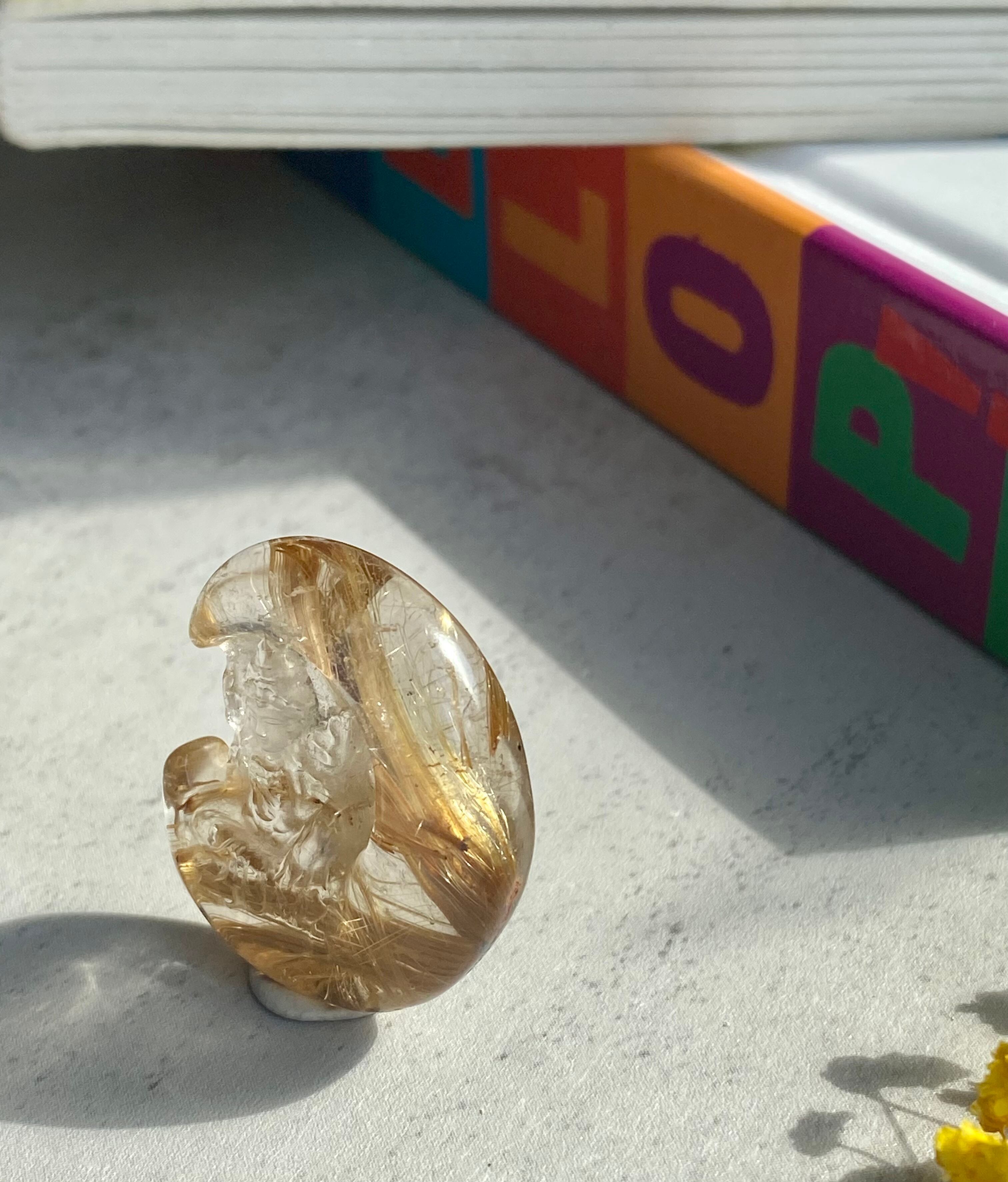 クォーツの中にゴールデンルチルが入っていて穏やかな仏陀が三日月の中で手を合わせている素敵な彫り物です。