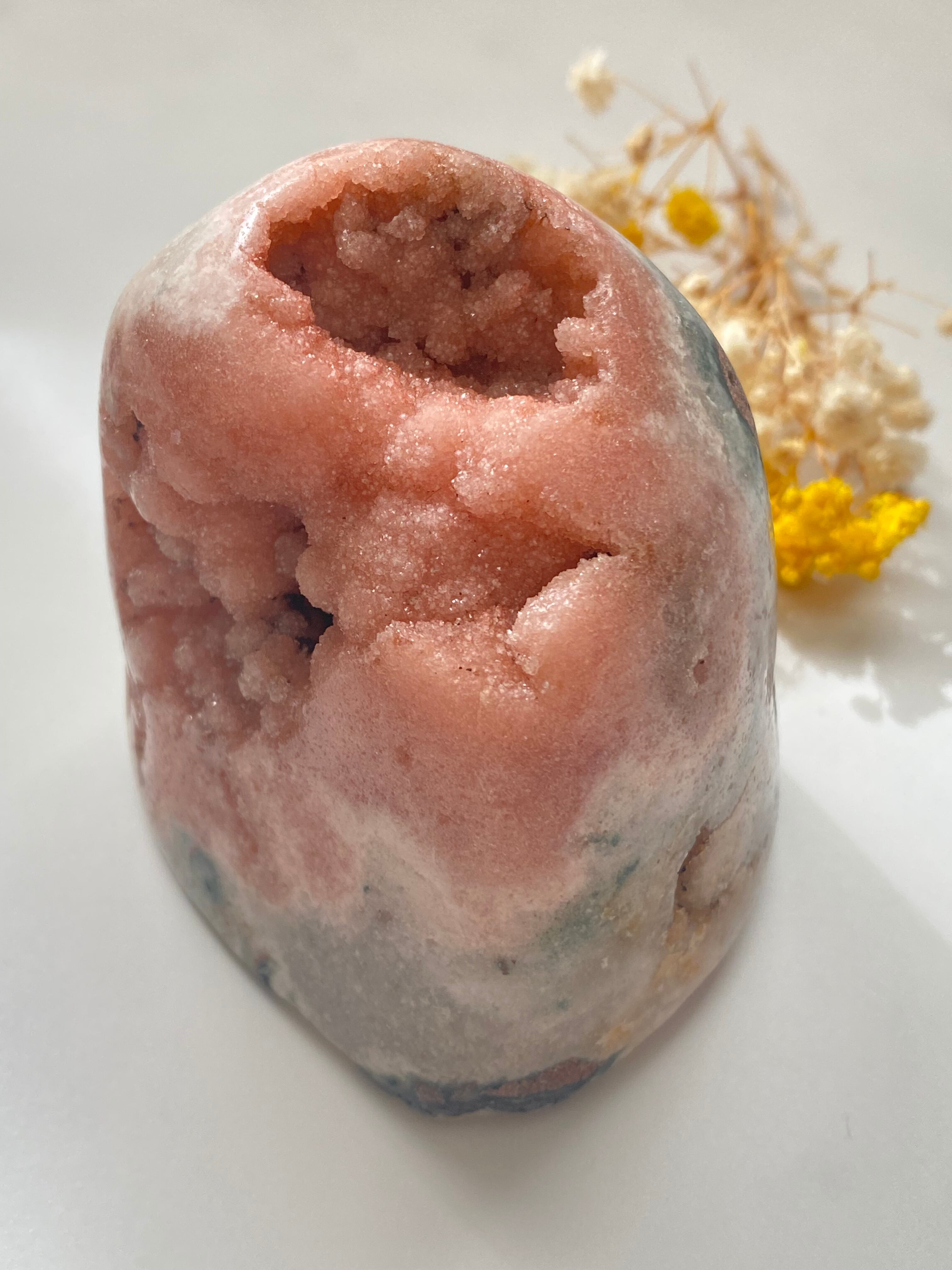 ピンクとグリーンが可愛らしいピンクアメジストです。正面のキラキラしているピンクがパステルピンクで見てるだけでなんだかワクワクします。また、先端が小さな結晶の塊でキラキラです。ところどころにあるグリーンもピンクを引き立ててくれます。