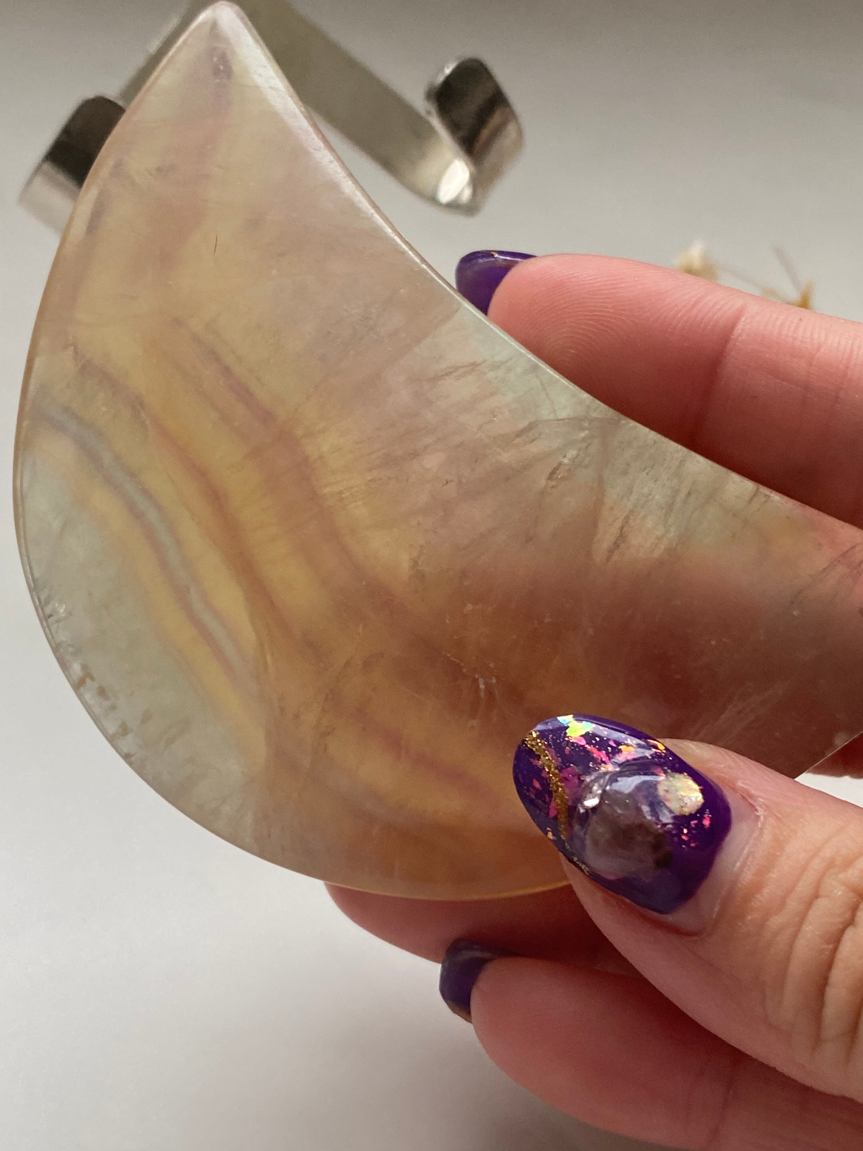 淡い色がかわいいフローライトのムーンとスタンドのセットです。飾っても良し握っても良しなムーンです。小さな傷が付いているので通常よりお安く出品しております。写真でのご確認をお願いいたします。