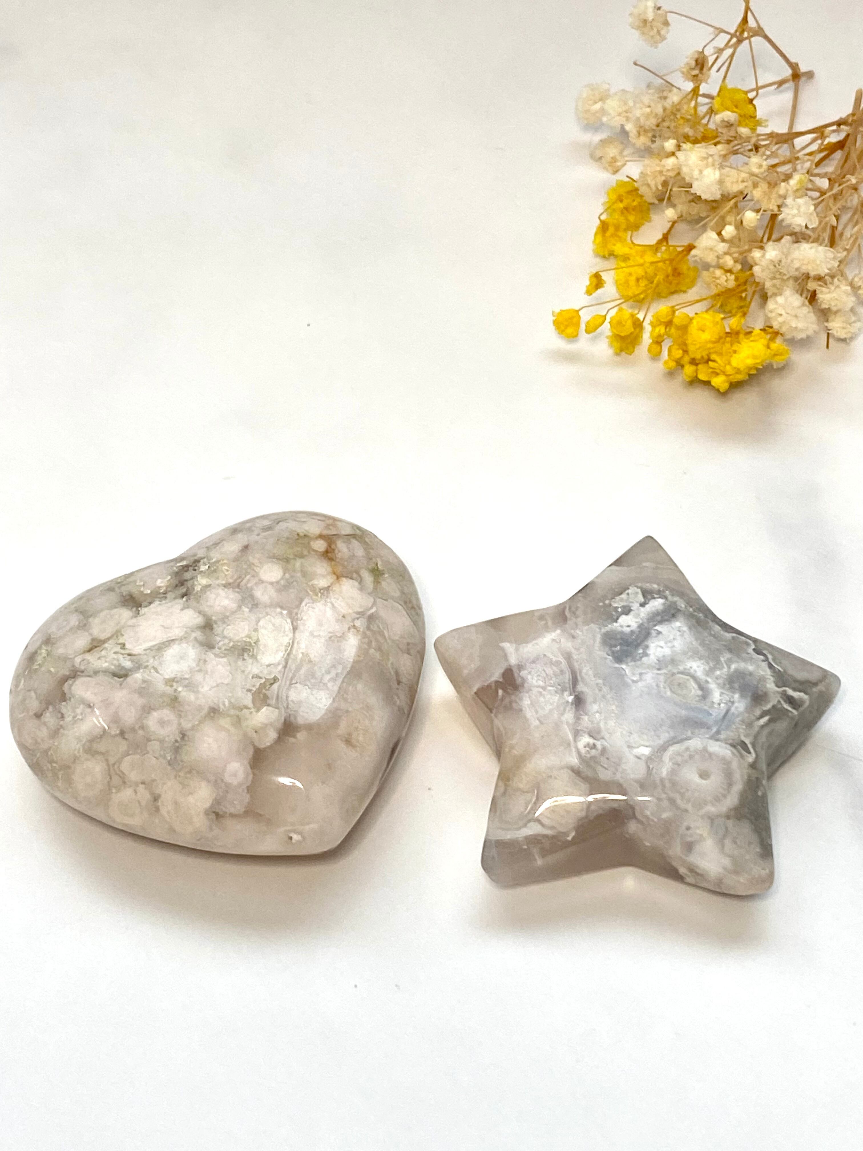 半透明な石に白いお花が咲いている可愛らしいフラワーアゲートのスターとハートです。どちらも個性的な模様が素敵です。