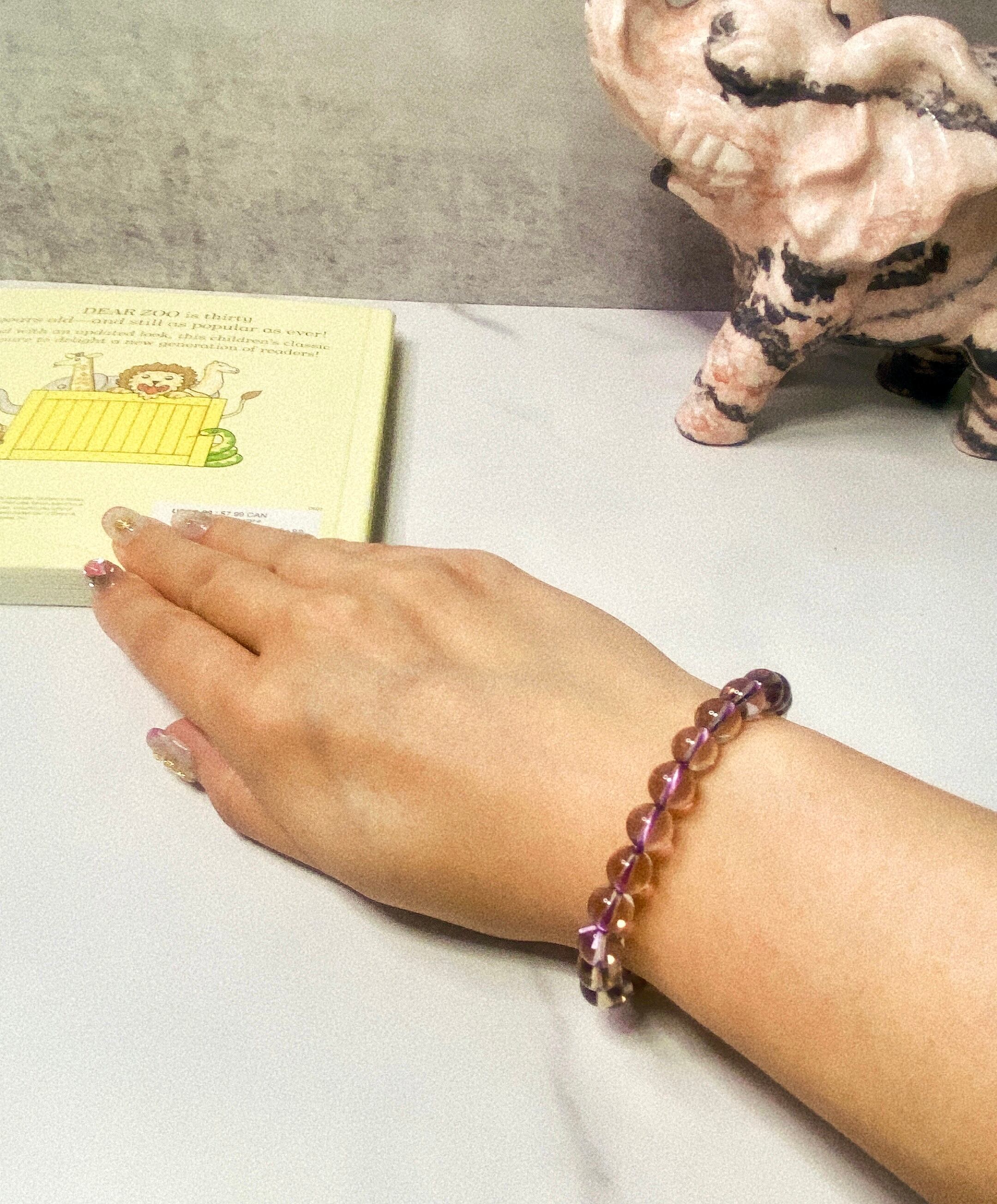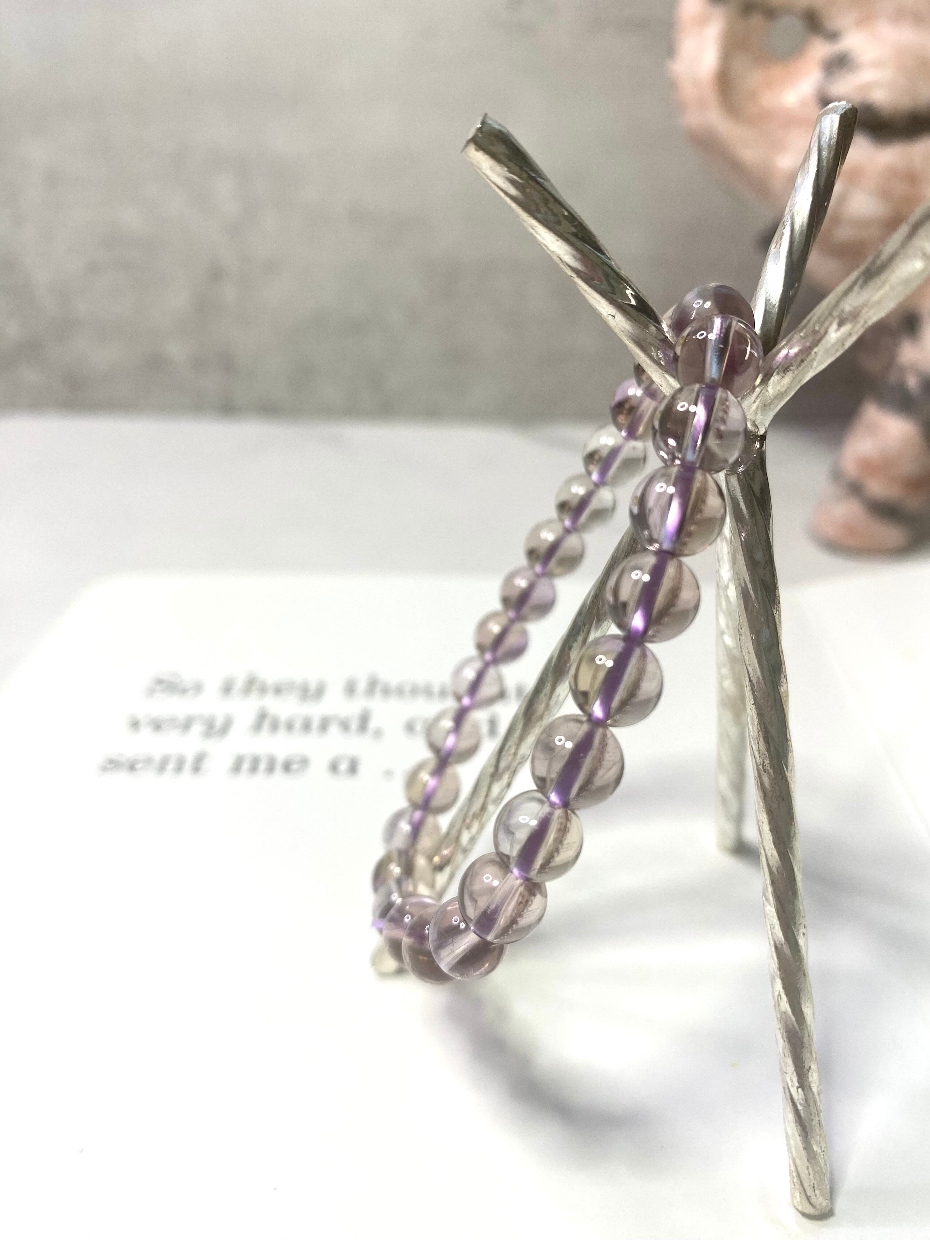 とても透明度の高い1粒1粒のブレスレットです。その中にパープルとイエローが見えとても綺麗です。