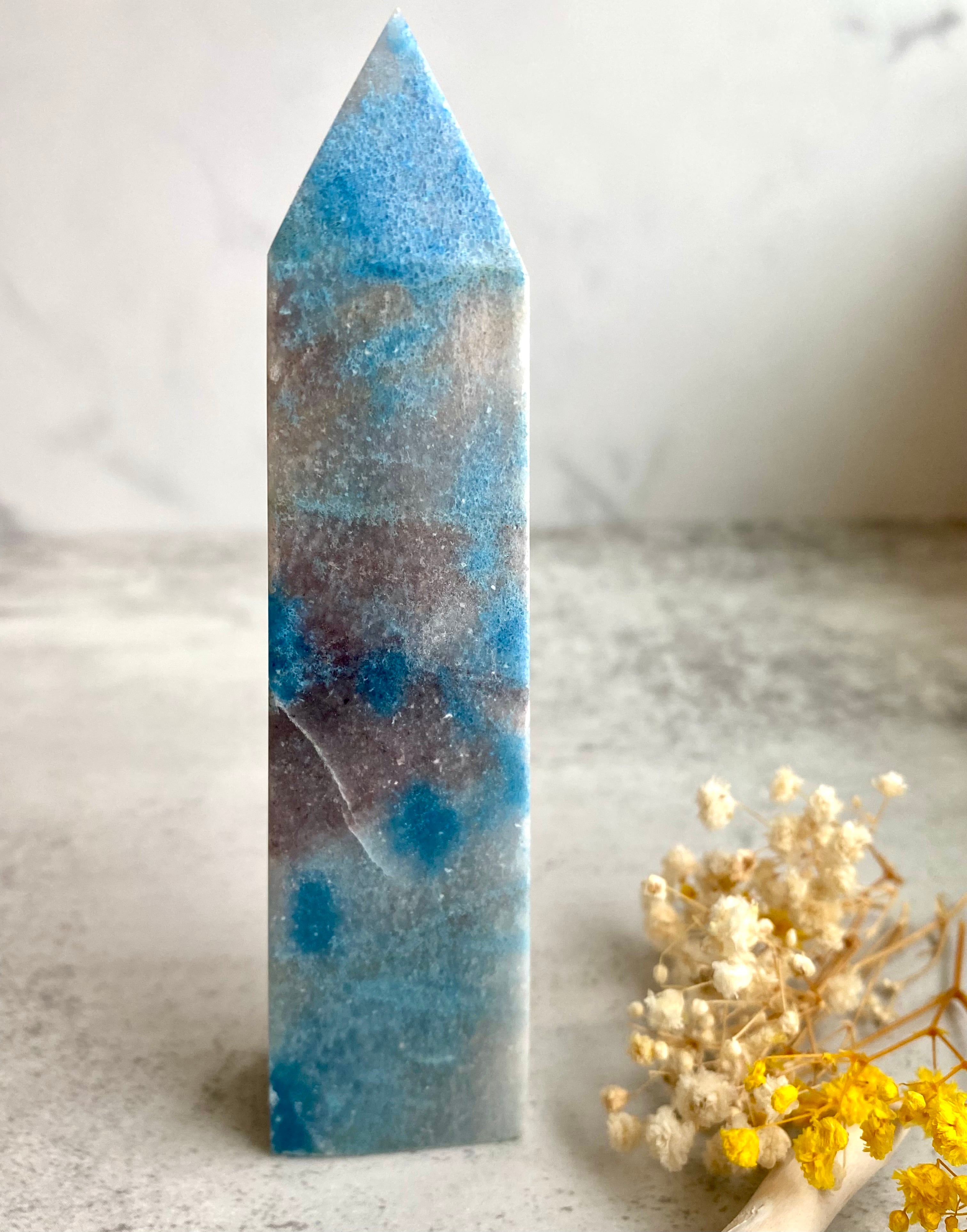 ブルー、グレー、ホワイトが混ざり合った美しい色合いと、艶テリよく丁寧に磨き上げられた石肌の滑らかな感触が魅力的です。