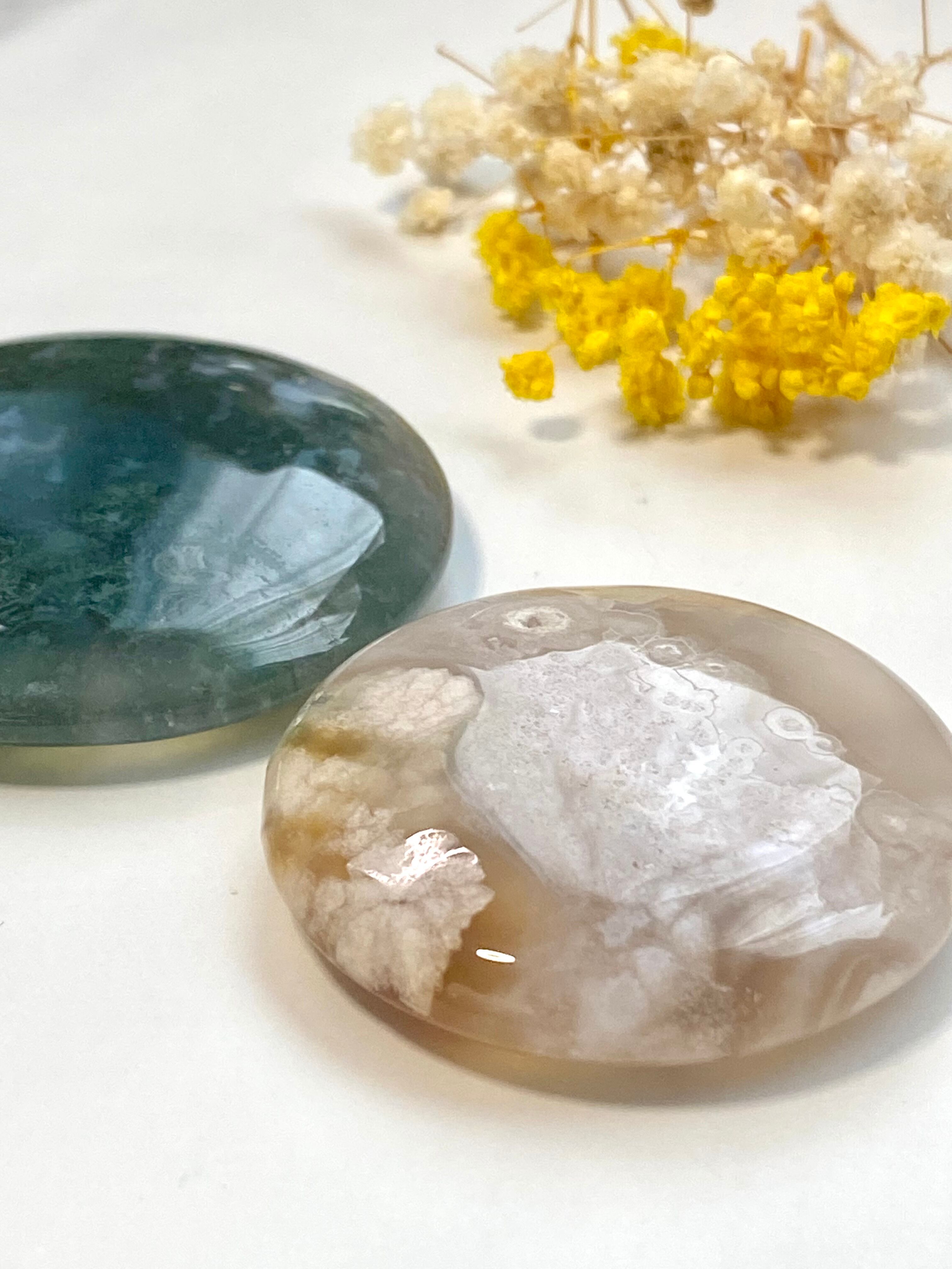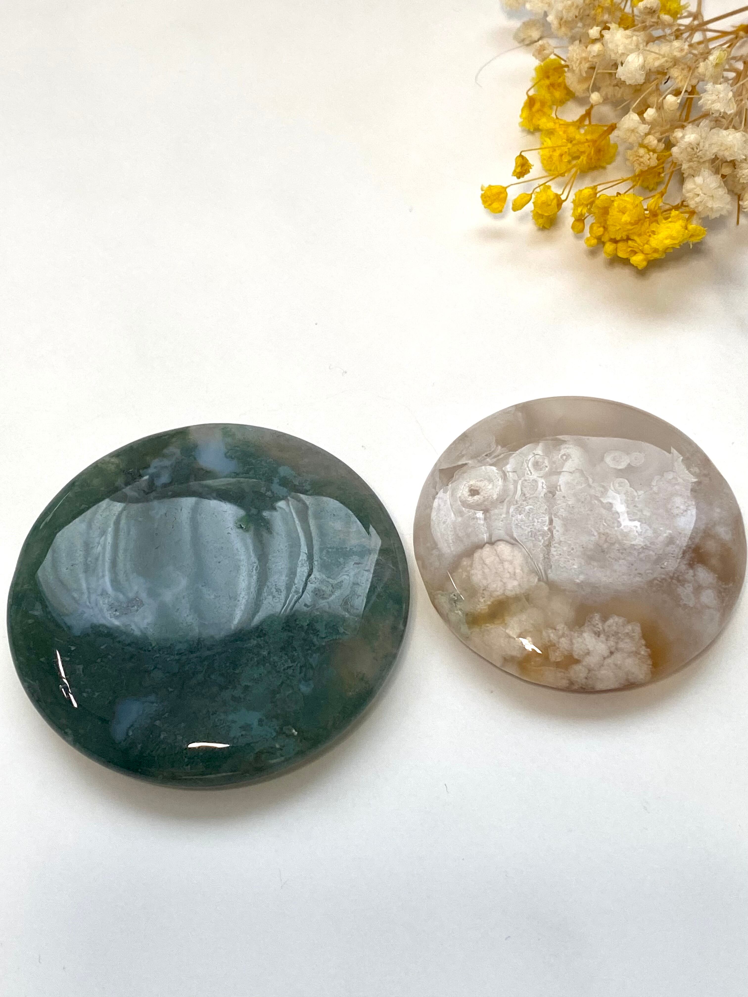 半透明な石に白いお花が咲いている可愛らしいフラワーアゲートと深い緑のモスアゲートのセットです。どちらも個性的な模様が素敵です。