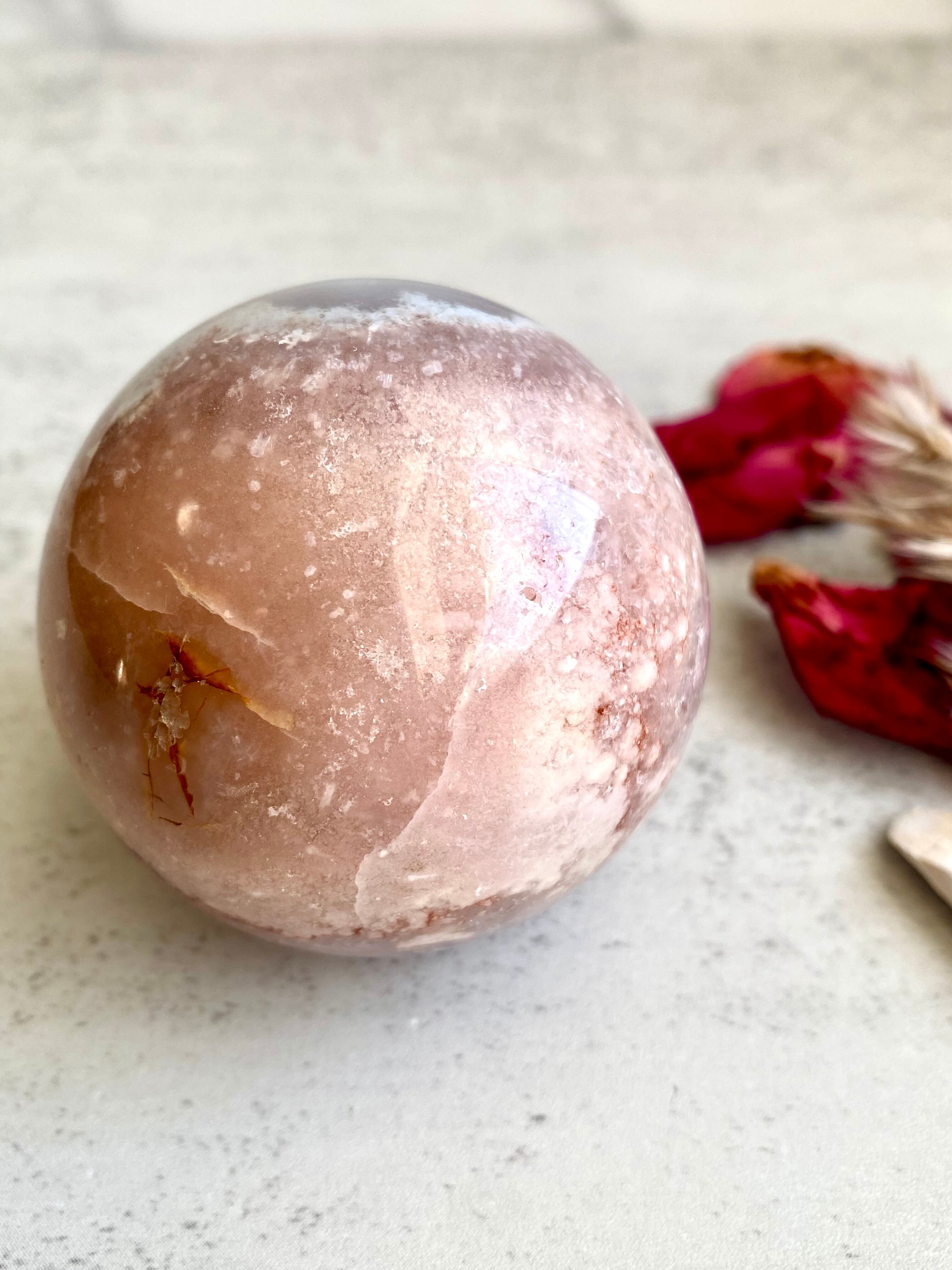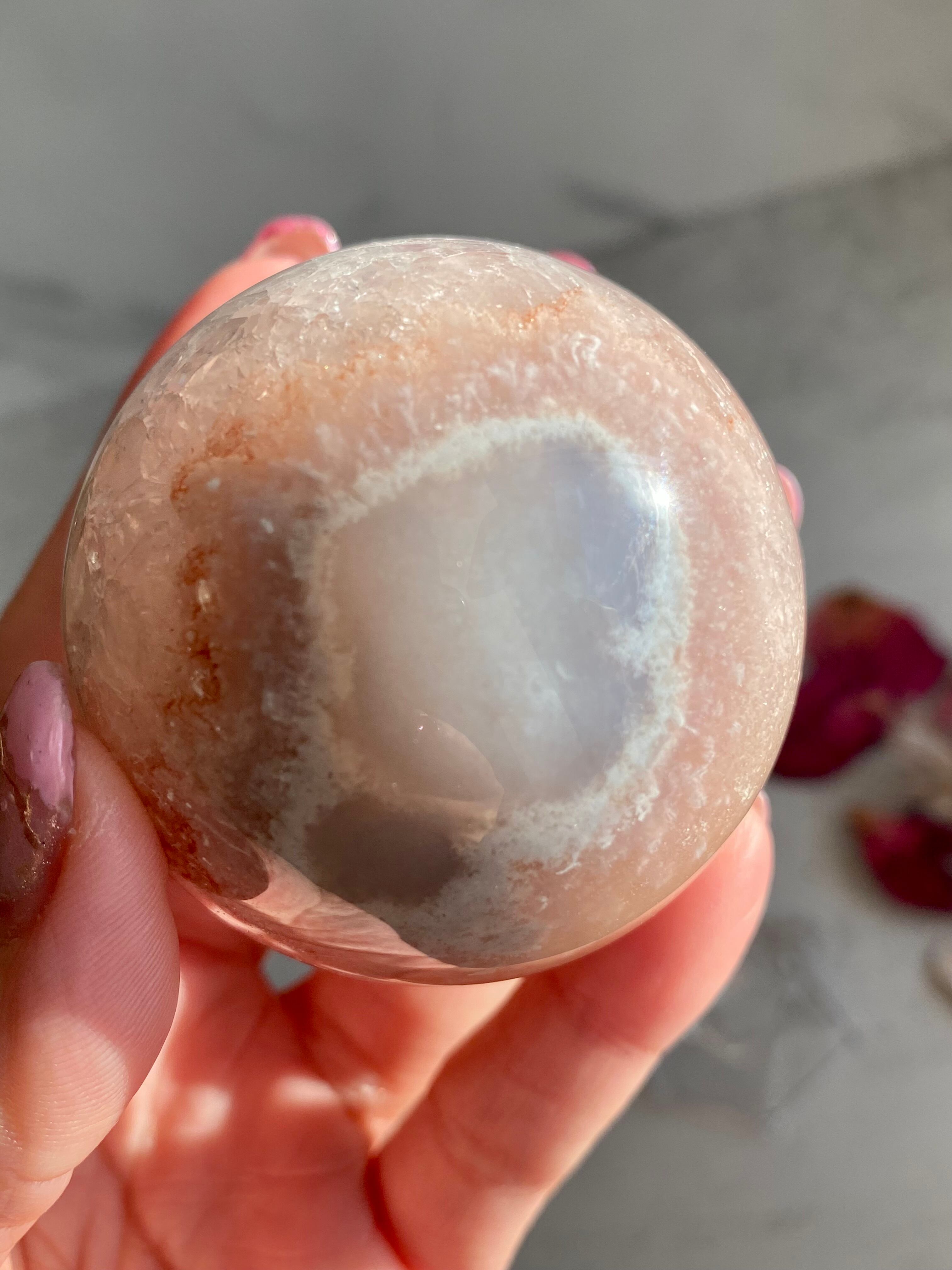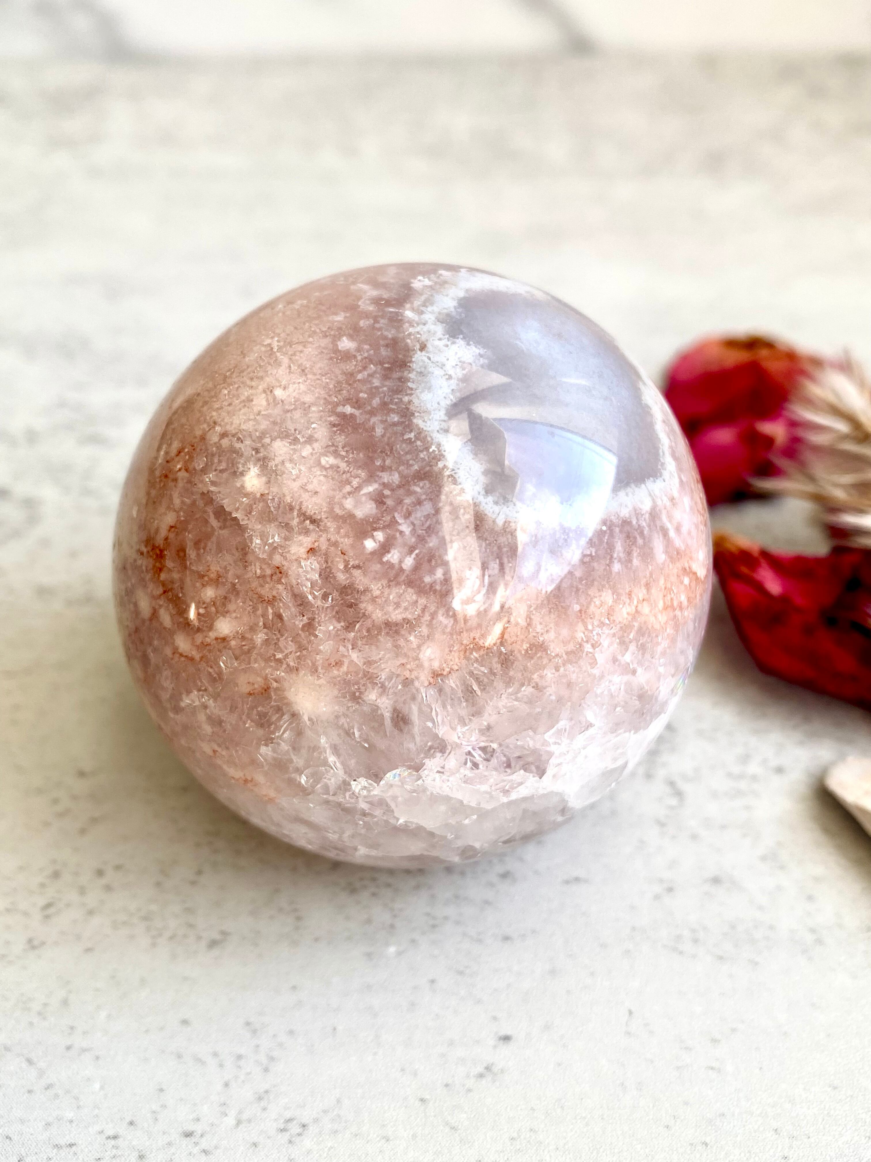 淡いピンクとパープルそして細かな虹やクォーツのラメ感が可愛らしいピンクアメジストのスフィアです。