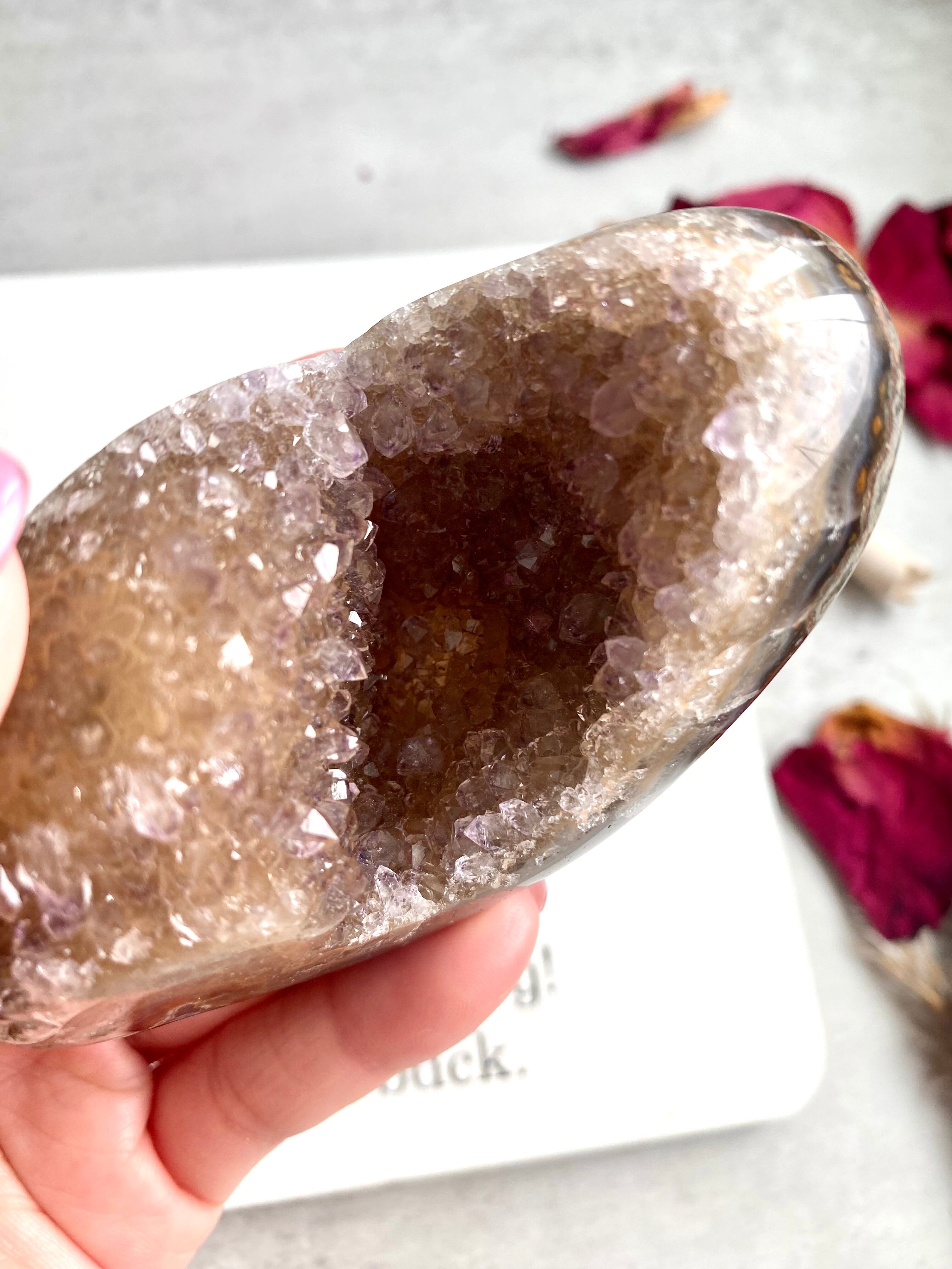 原石の丸みをおびた形状に、内側には美しい晶洞の透かし模様が浮かび上がり、個性豊かな表情を見せてくれます。女性や赤ちゃん、子供を守る守護の力があり、安産や子供の成長を願うお守りとして人気があります。
