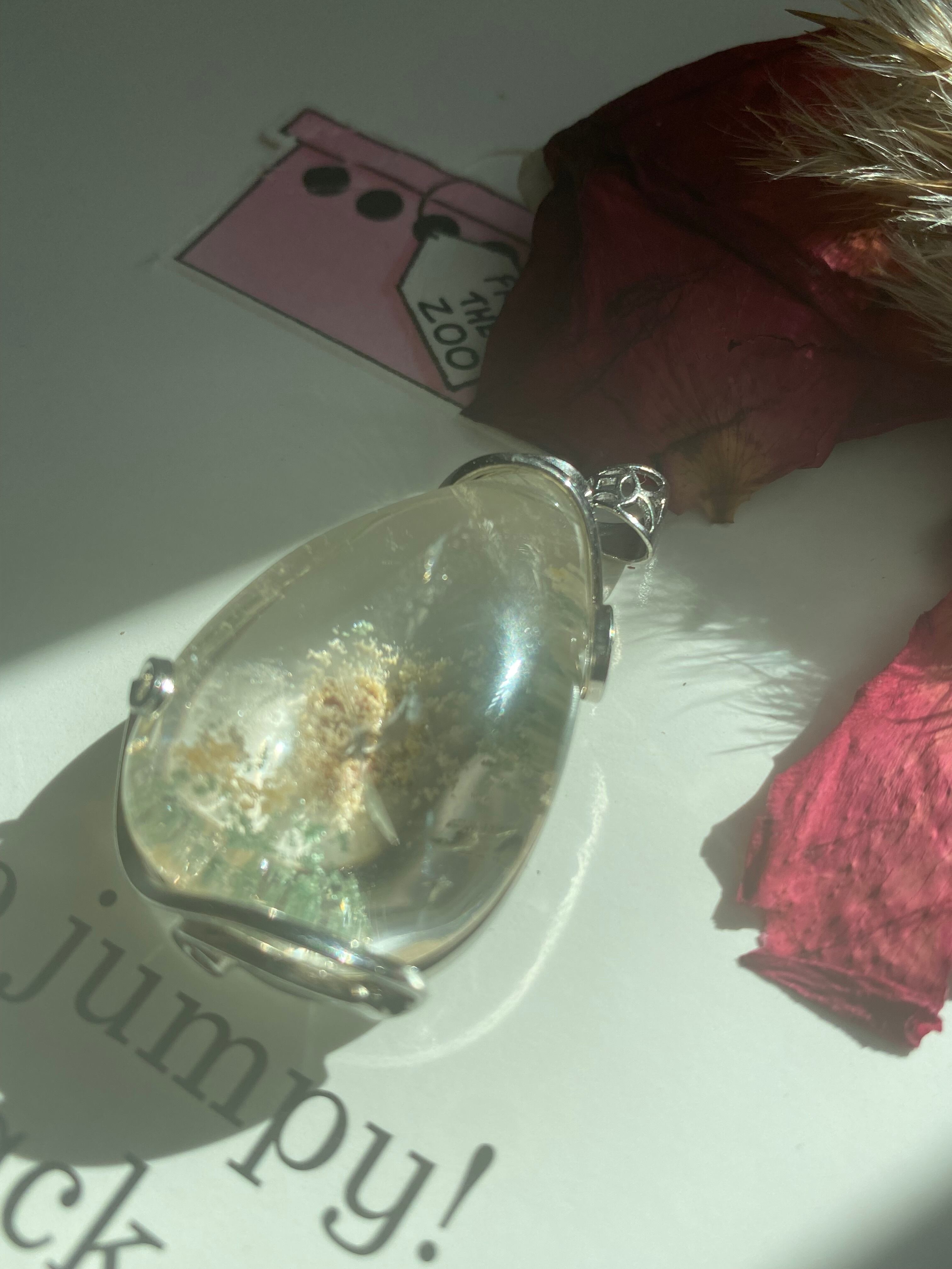 ガーデンクォーツは水晶が形成される過程で、緑や茶色の鉱物を巻き込みながら結晶した水晶です。水晶の中に自然の風景を閉じ込めらたように見えるため、「庭園水晶」や「苔入り水晶」とも呼ばれます。石の中に見える風景は実に様々で、内包物の状態や色によって、山や川、野原や森林などを連想させてくれます。