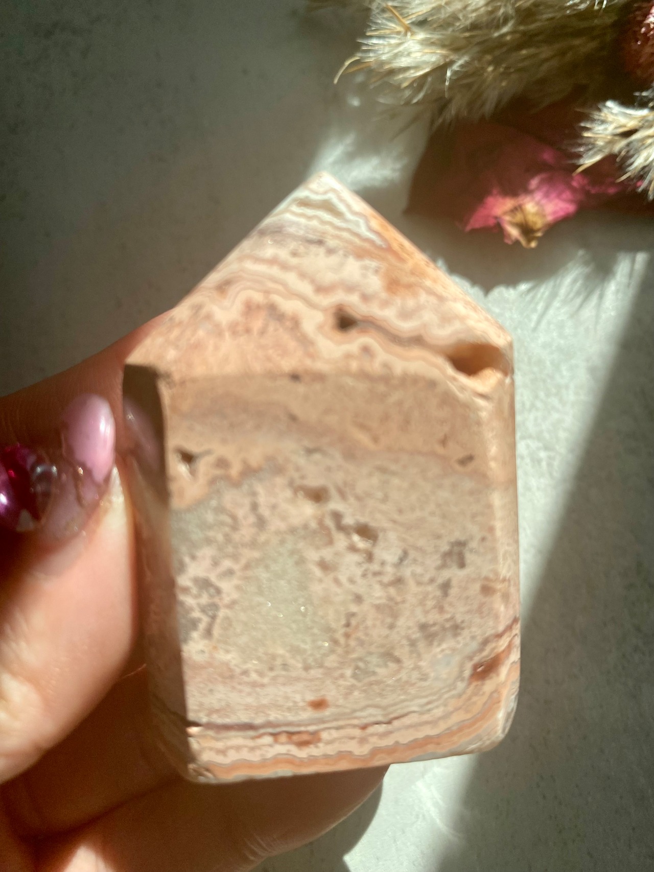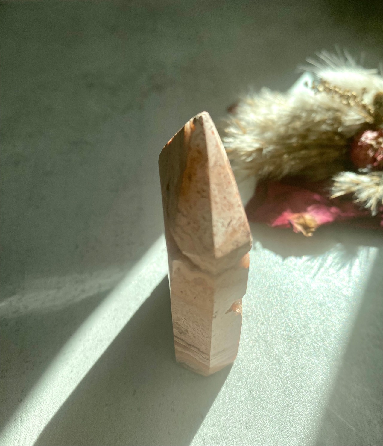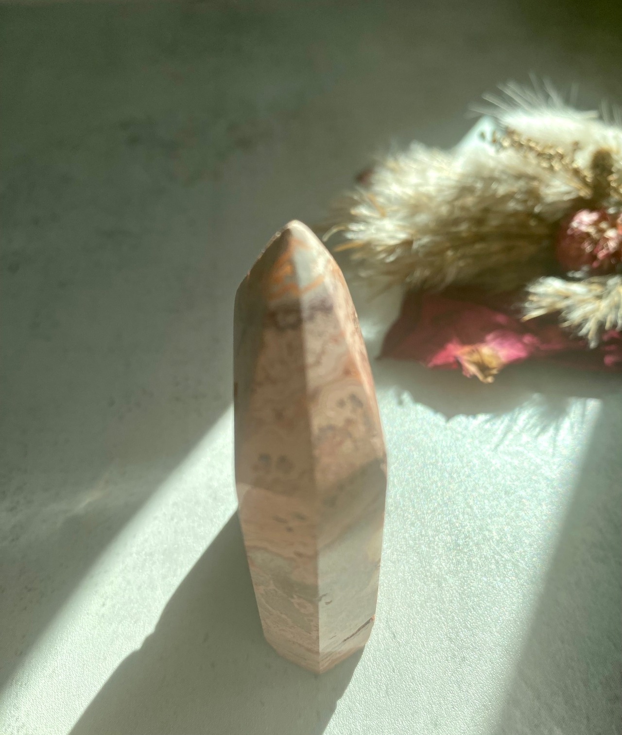 メキシカンクレイジーレースアゲートのミニタワーです。幾重にも重なる縞模様が美しいアート作品のようです。それぞれが唯一無二なレース模様です。