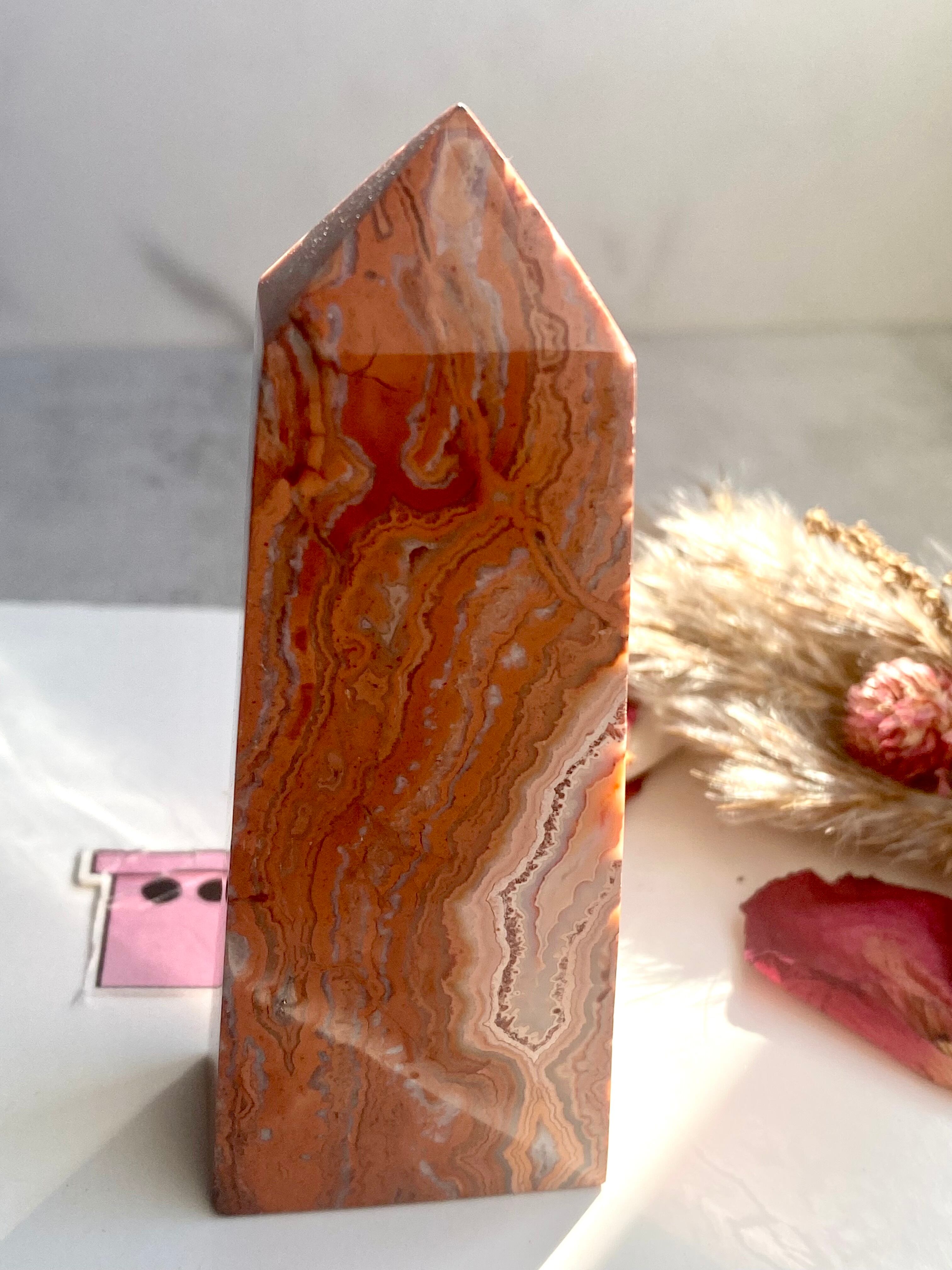 メキシカンクレイジーレースアゲートのタワーです。幾重にも重なる縞模様が美しいアート作品のようです。それぞれが唯一無二なレース模様です。