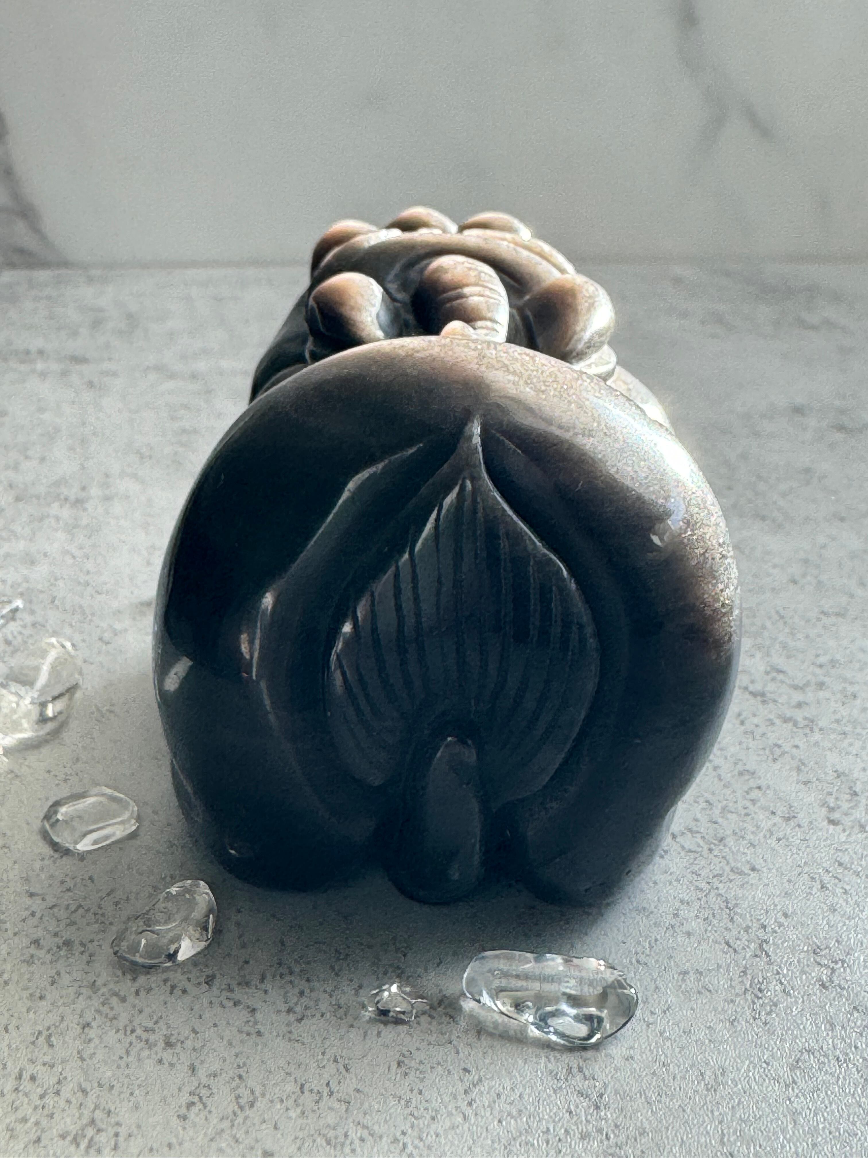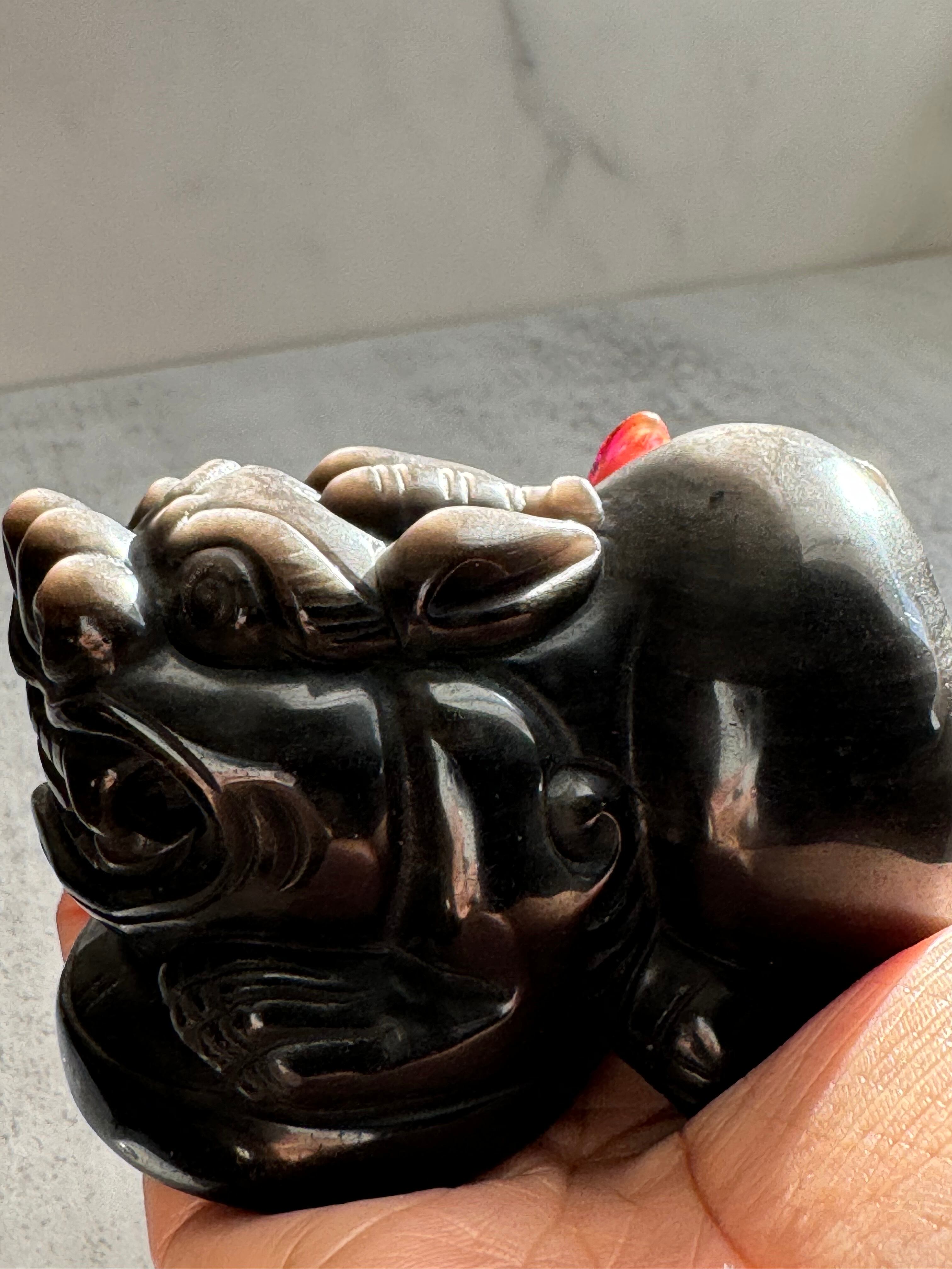 その場に溶け込むような落ち着いたシックな色合いで、モノトーンのグラデーションがオシャレなシルバーオブシディアンのヒキュウです。ユニセックスにお使いいただけるデザインです。