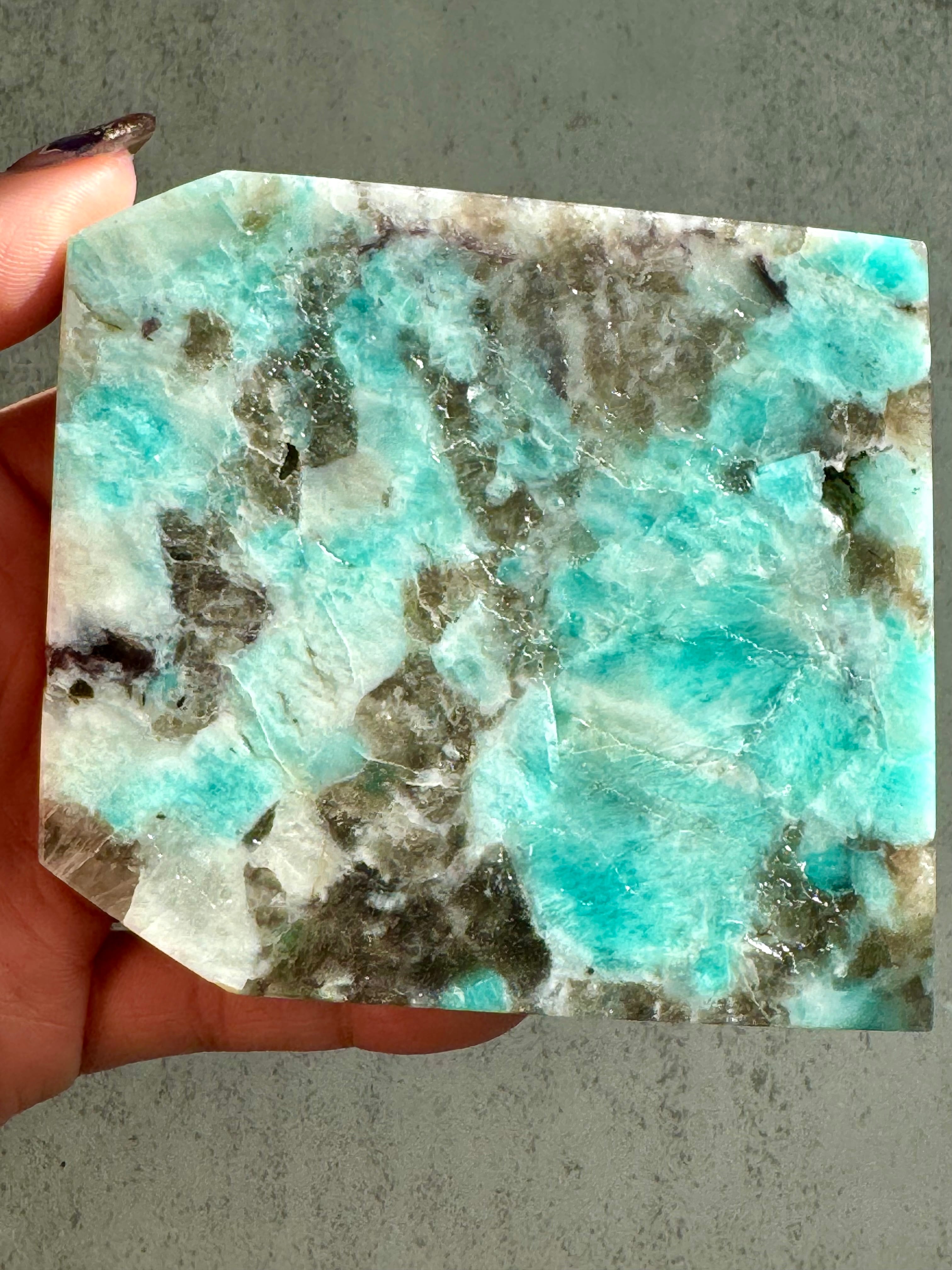 スモーキークォーツと共生しており、グリーンに癒されながらもパワーを感じられるスラブです。