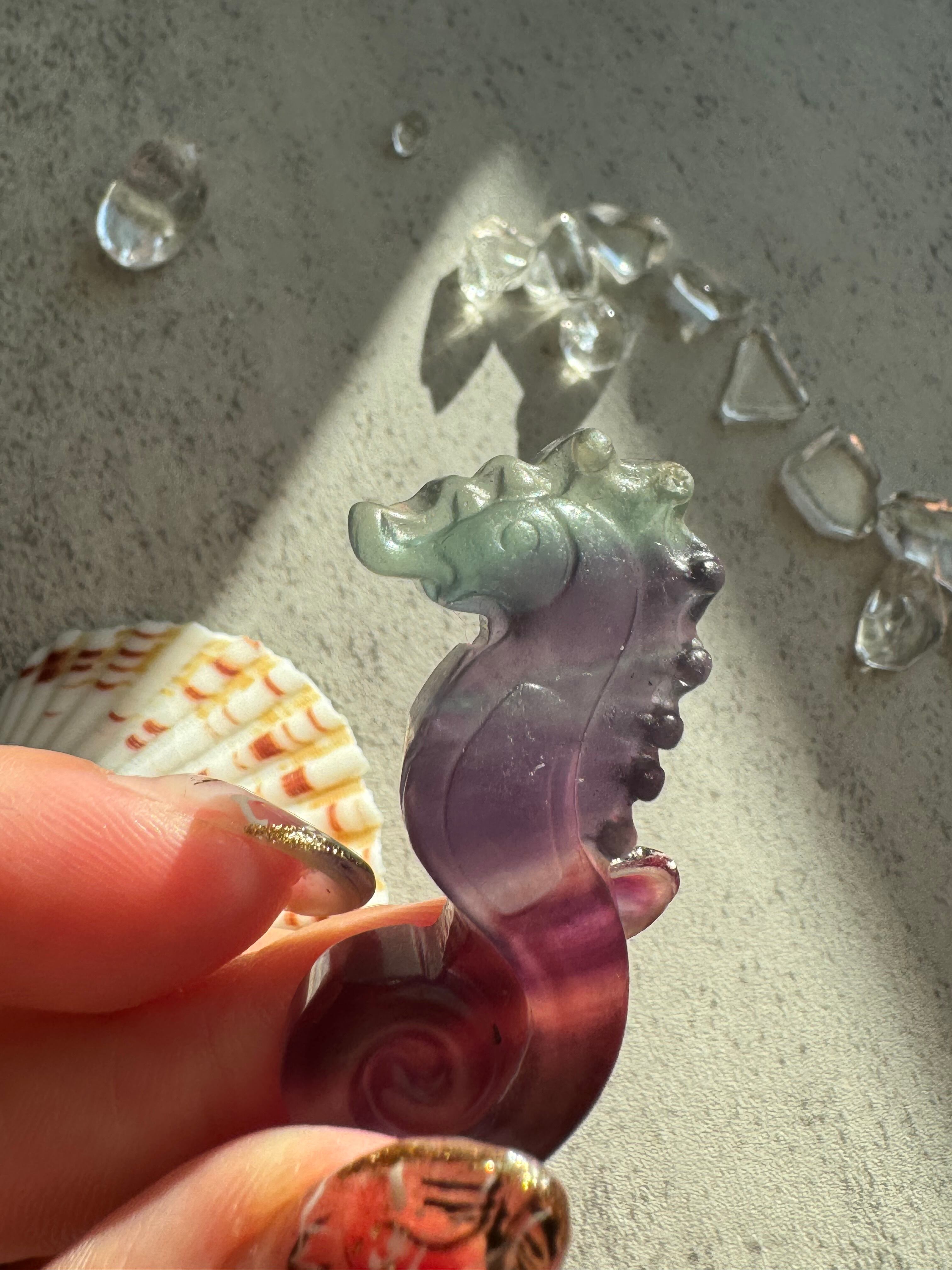淡いグリーンや深いパープルが美しいフローライトのタツノオトシゴです。透明感が素敵です。並べても可愛いと思います。