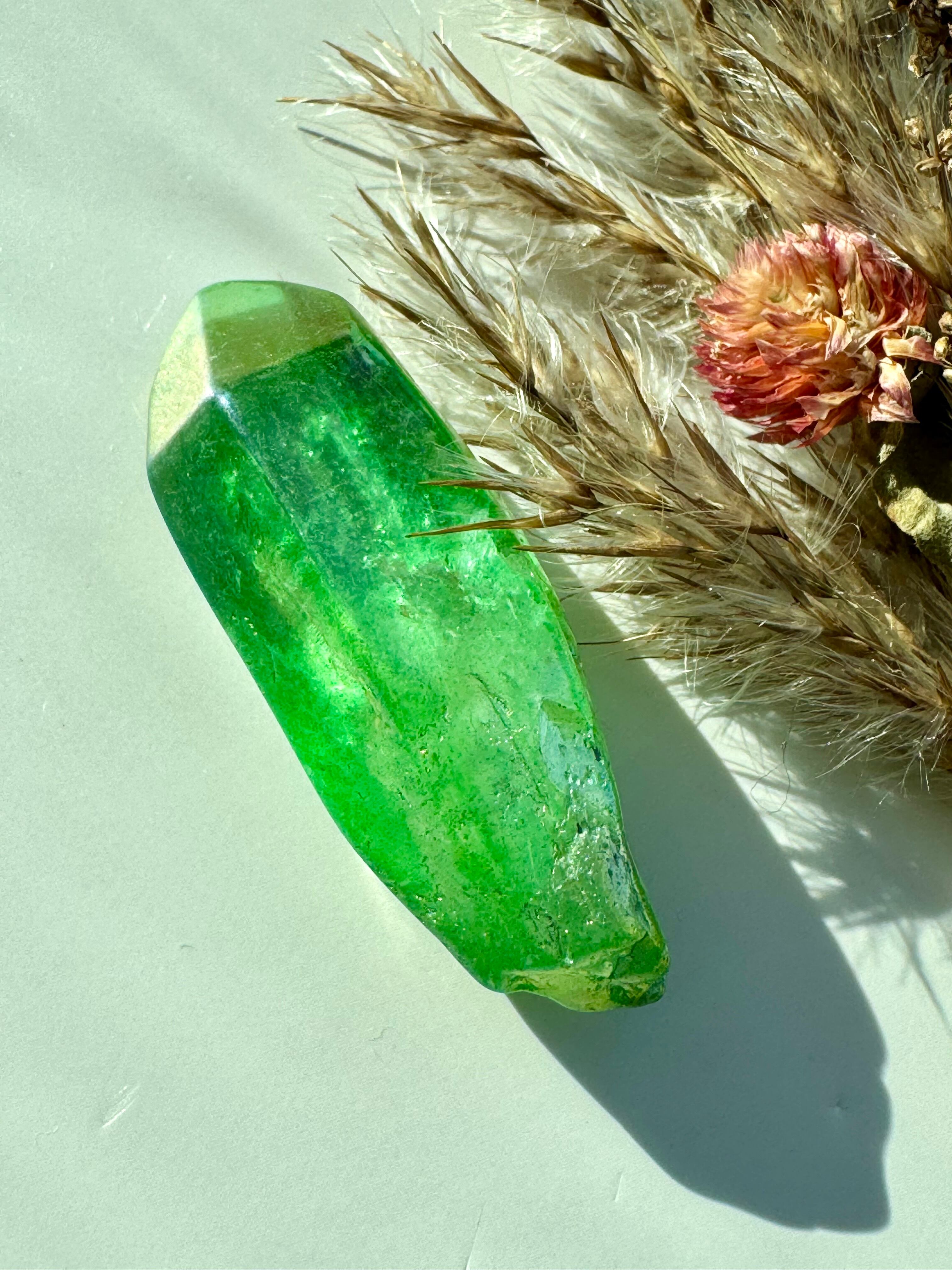 透明感のある水晶にグリーンのエンジェルオーラ加工を施したタワーです。