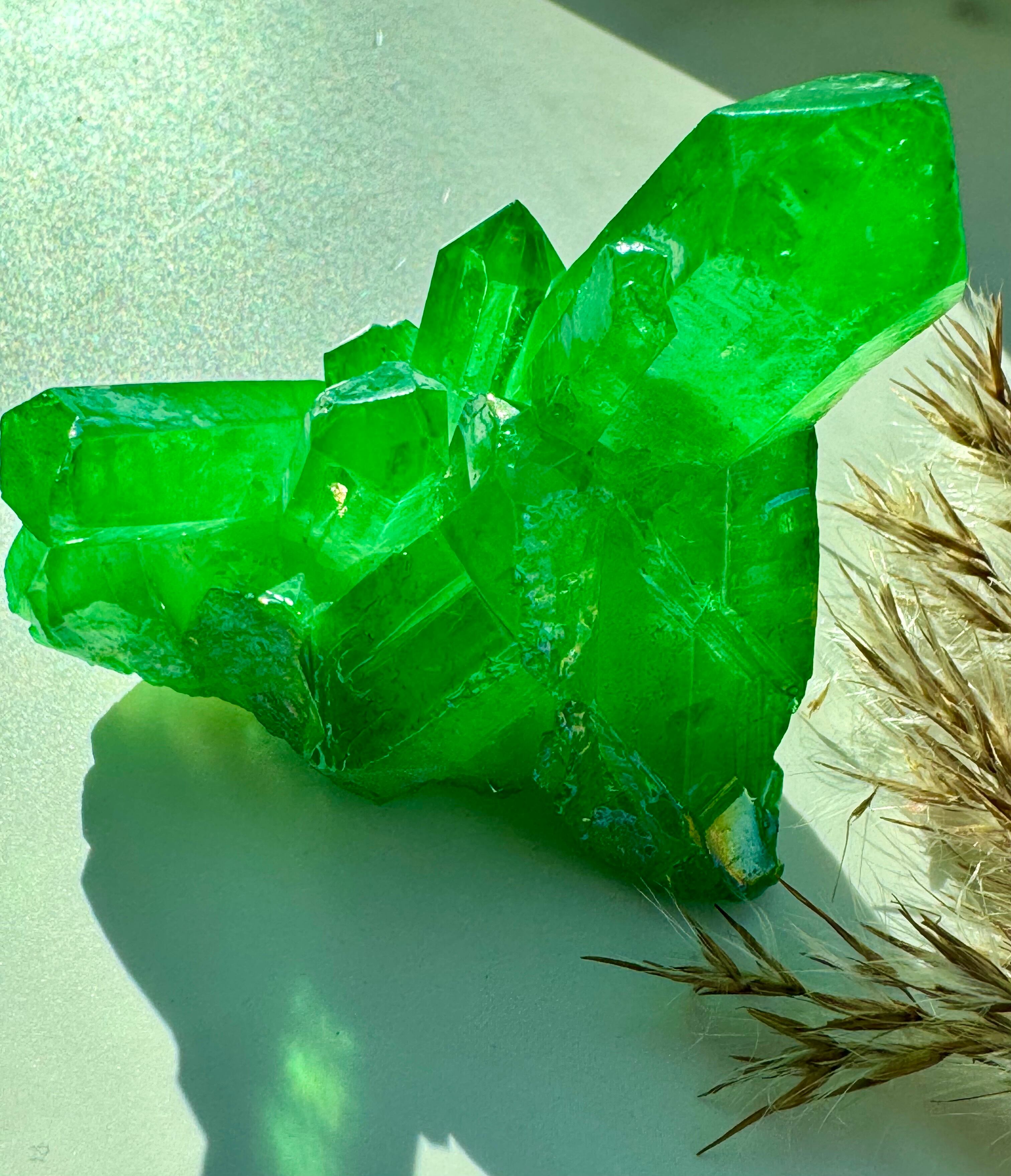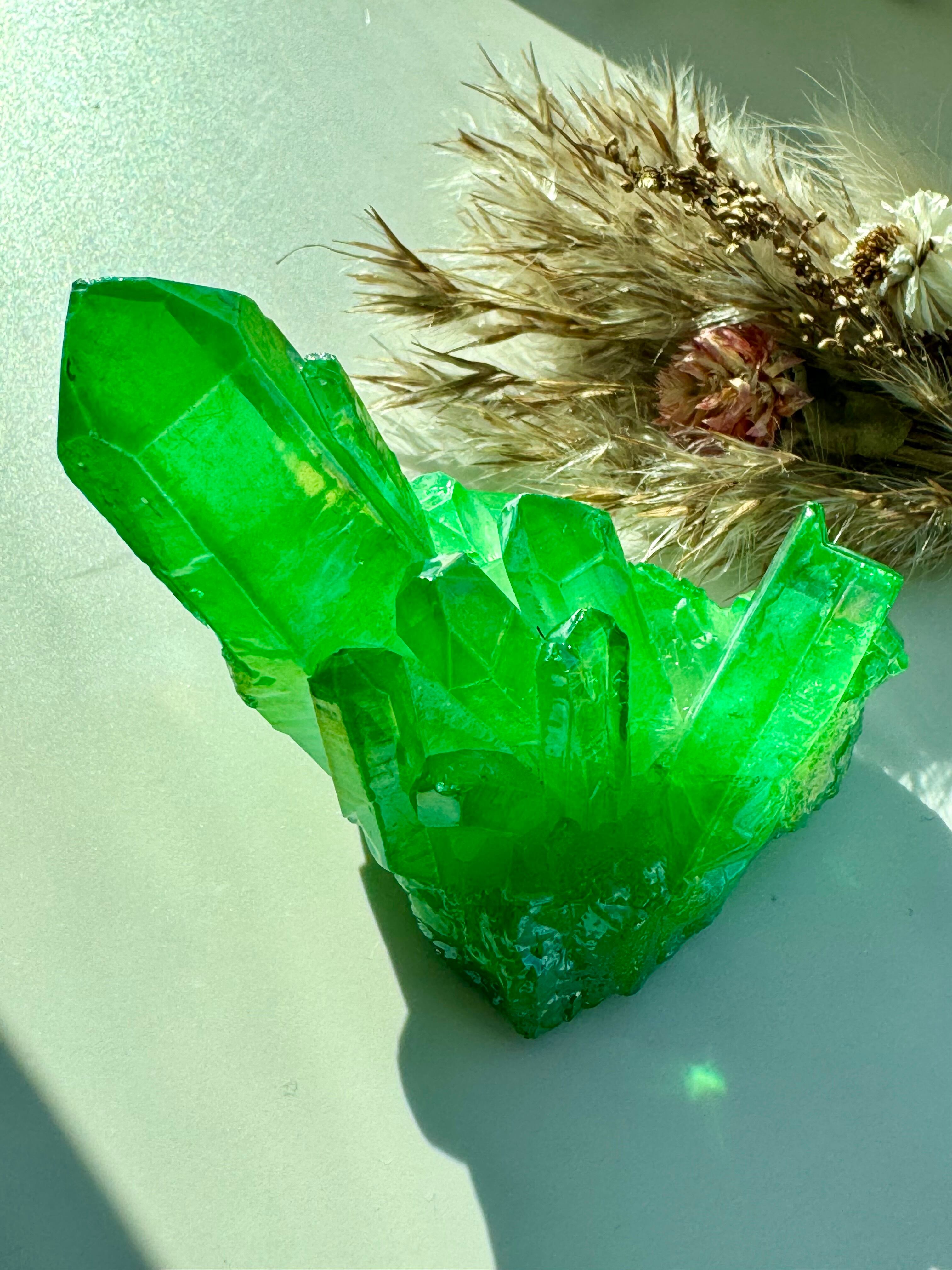透明感のある水晶にグリーンのエンジェルオーラ加工を施したクラスターです。