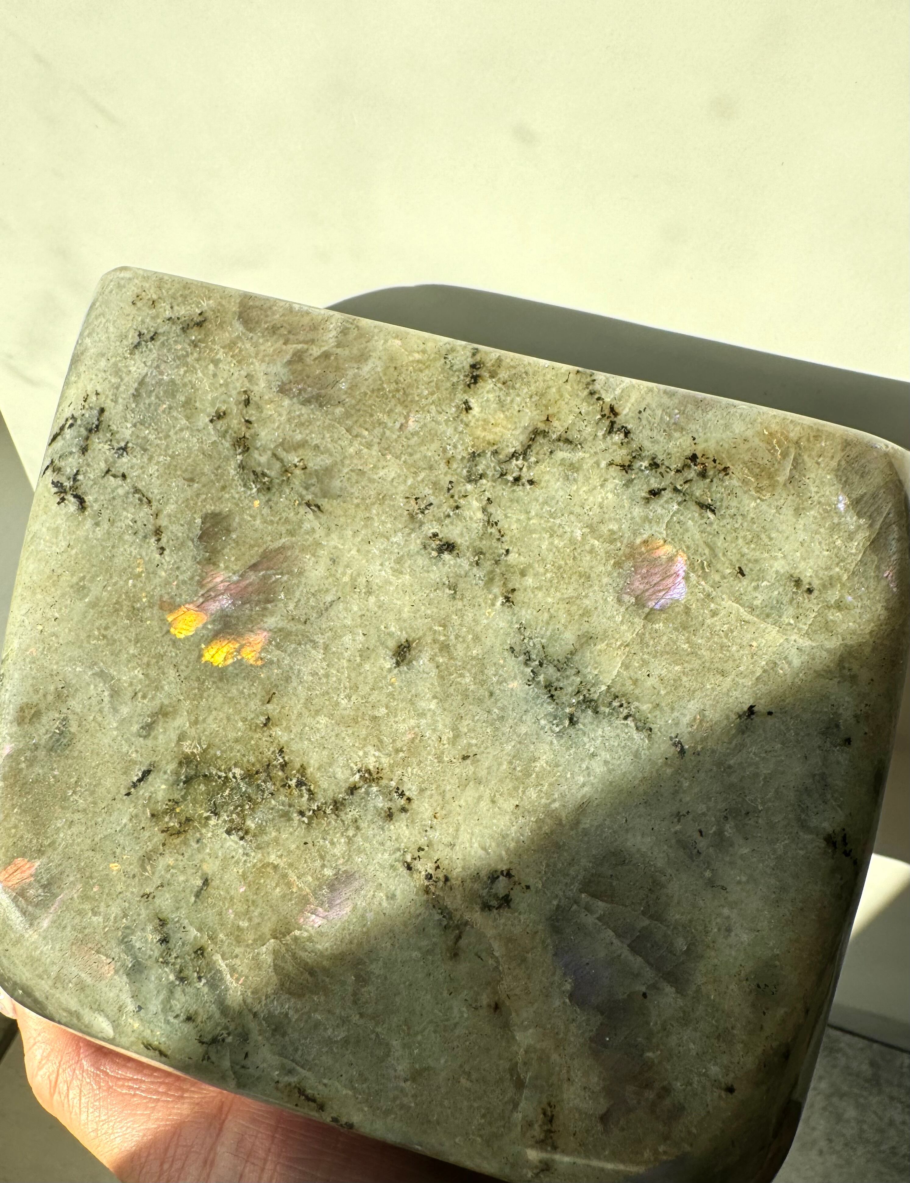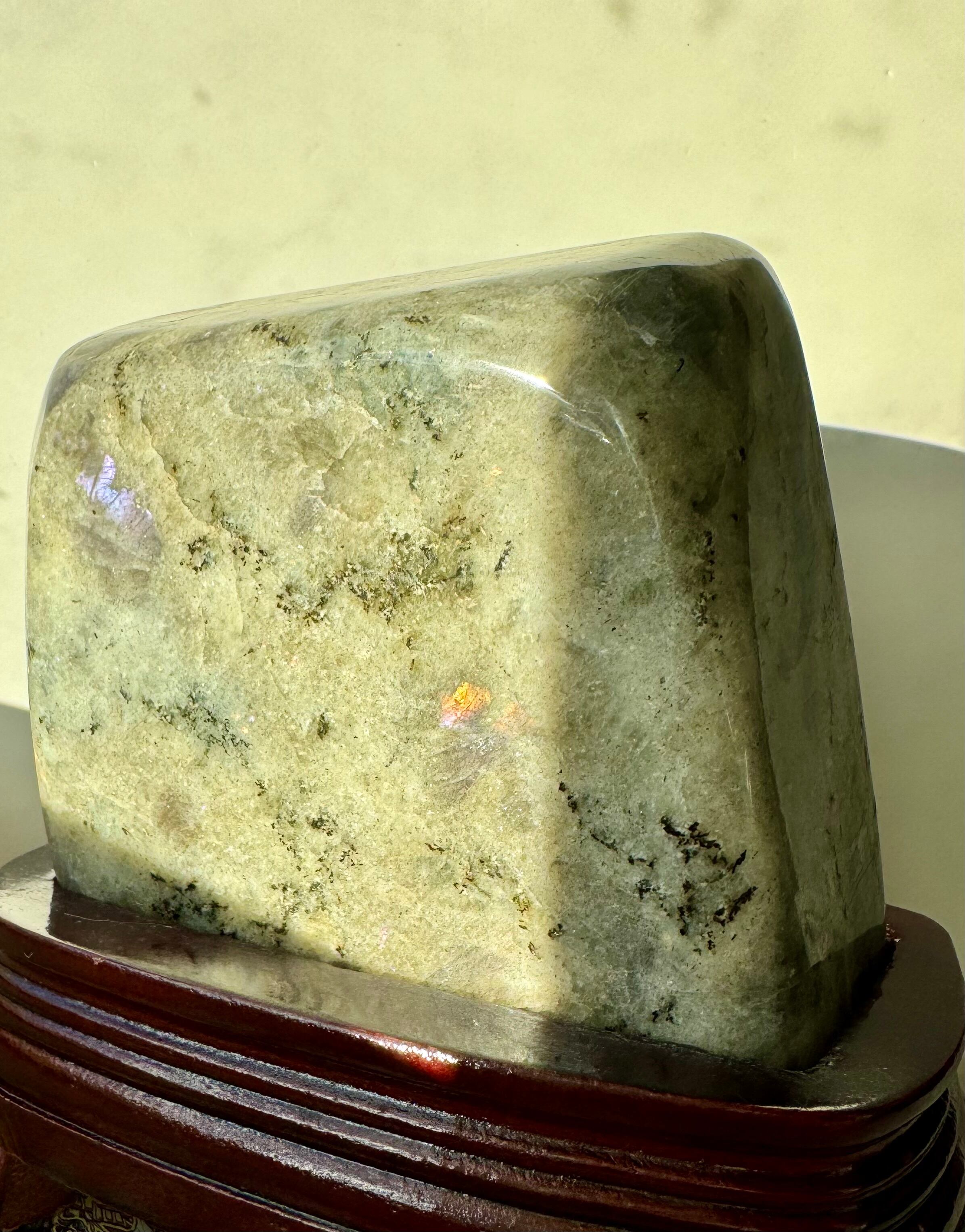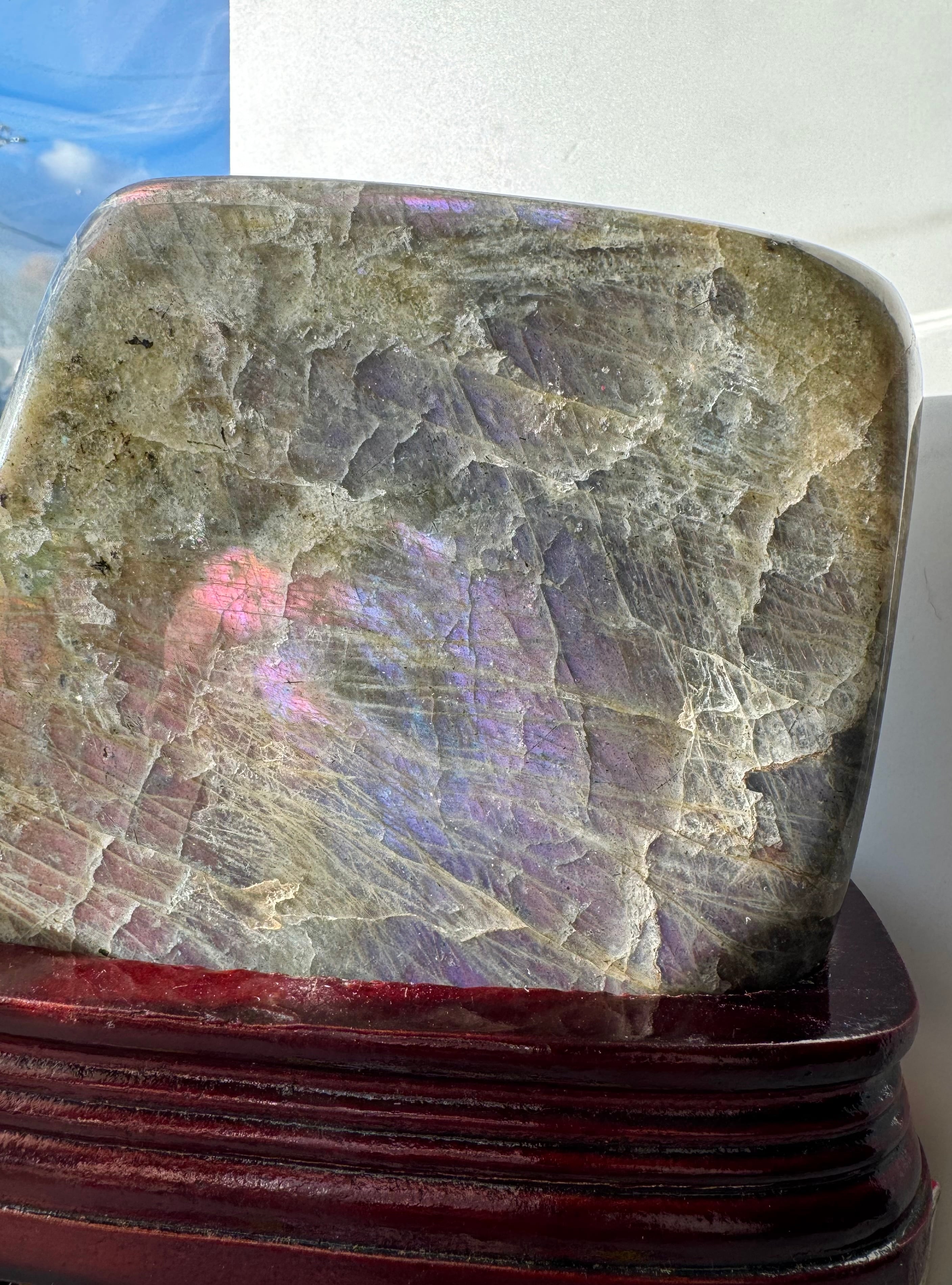 大きめのラブラドライトフリーフォームです。レインボーやパープル、シルバーのシラーがとてもキレイです。見る場所によっていろいろな表情を見せてくれるとても魅力的なフリーフォームです。台座もプレゼントします(^^♪