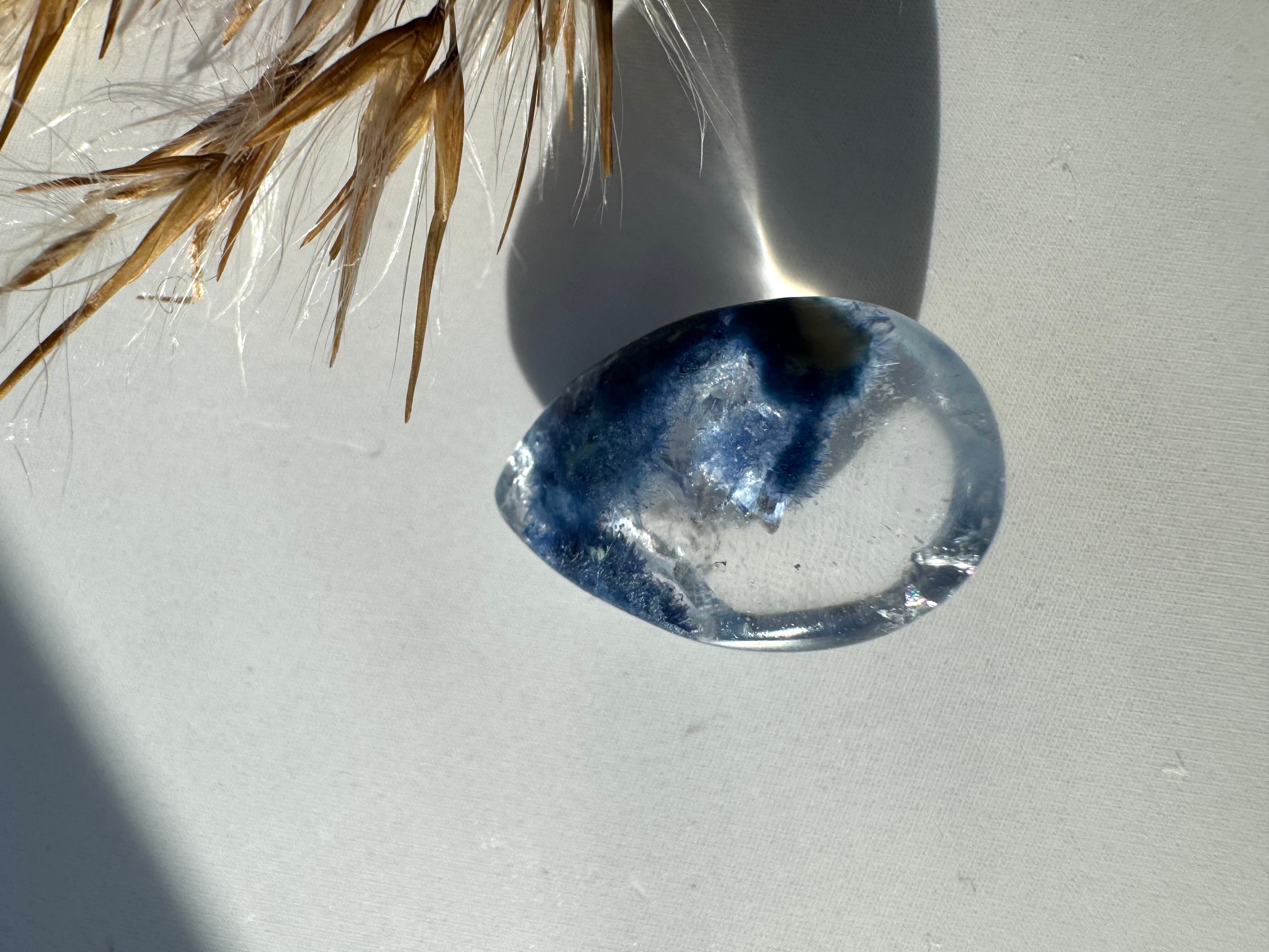透明感あふれるクォーツの中に浮かぶように入った、鮮やかな青色のデュモルチェライトが神秘的です。小さいながらも中央にギラッと輝く虹も見えます。