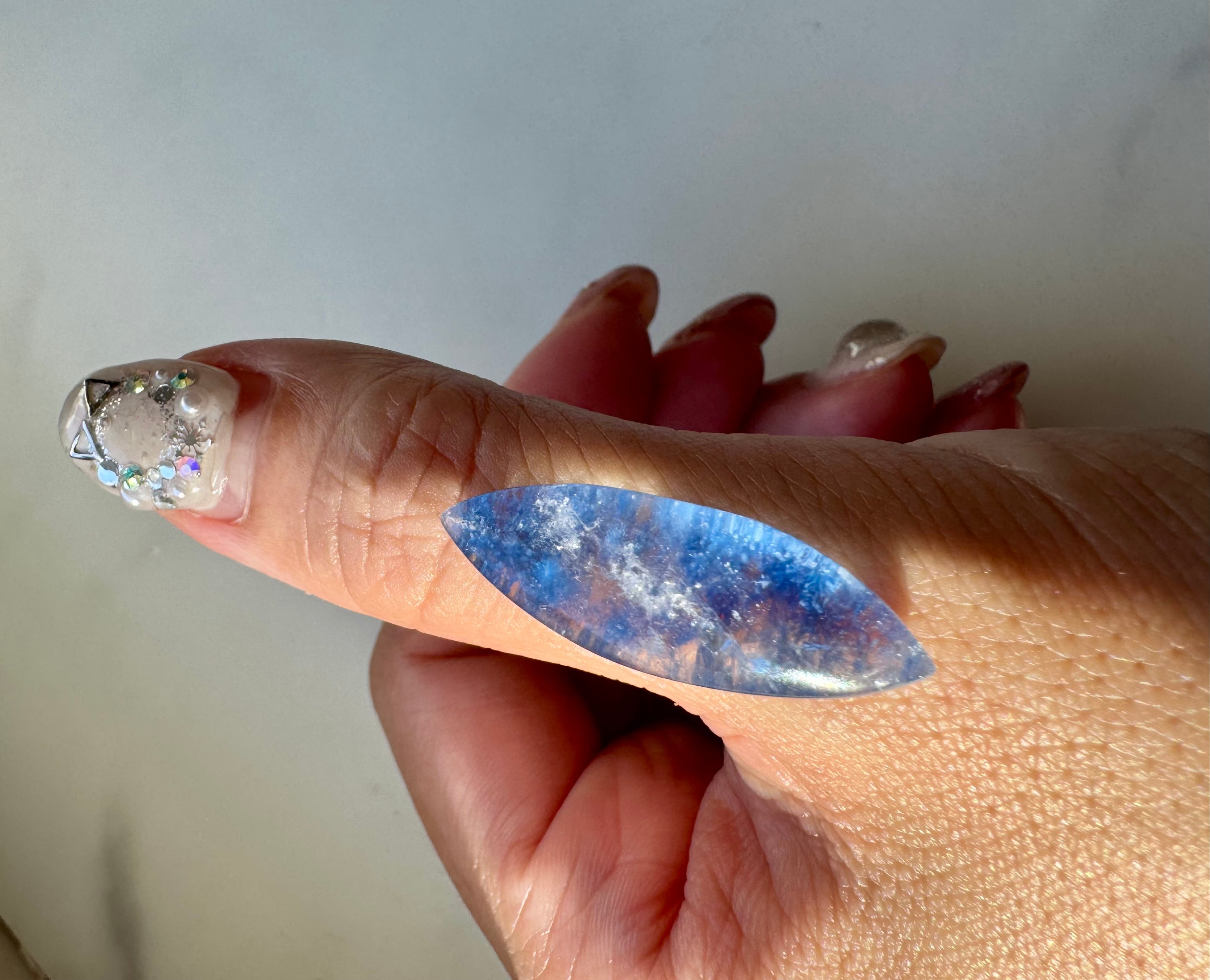 デュモルチェライトは、その独特な深い青みが特徴ですが、この色は鉱石の中に含まれる鉄と不純物として微量に含まれるチタンの割合によるもの。チタンの割合が多いほど青みが深くなるといわれています。