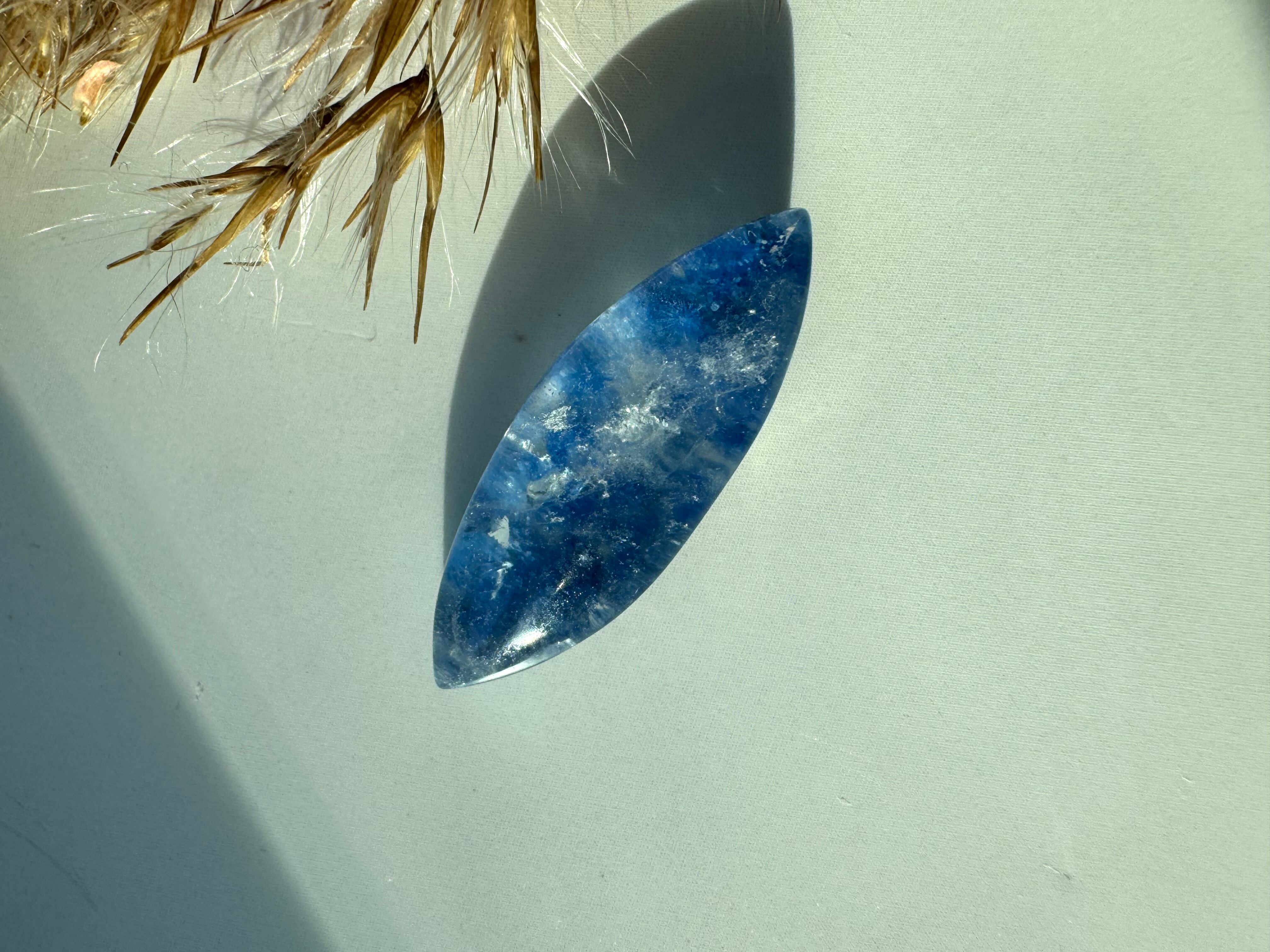 透明感あふれるクォーツの中に浮かぶように入った、鮮やかな青色のデュモルチェライトが神秘的です。おまもりやアクセサリーにも使えるサイズです。