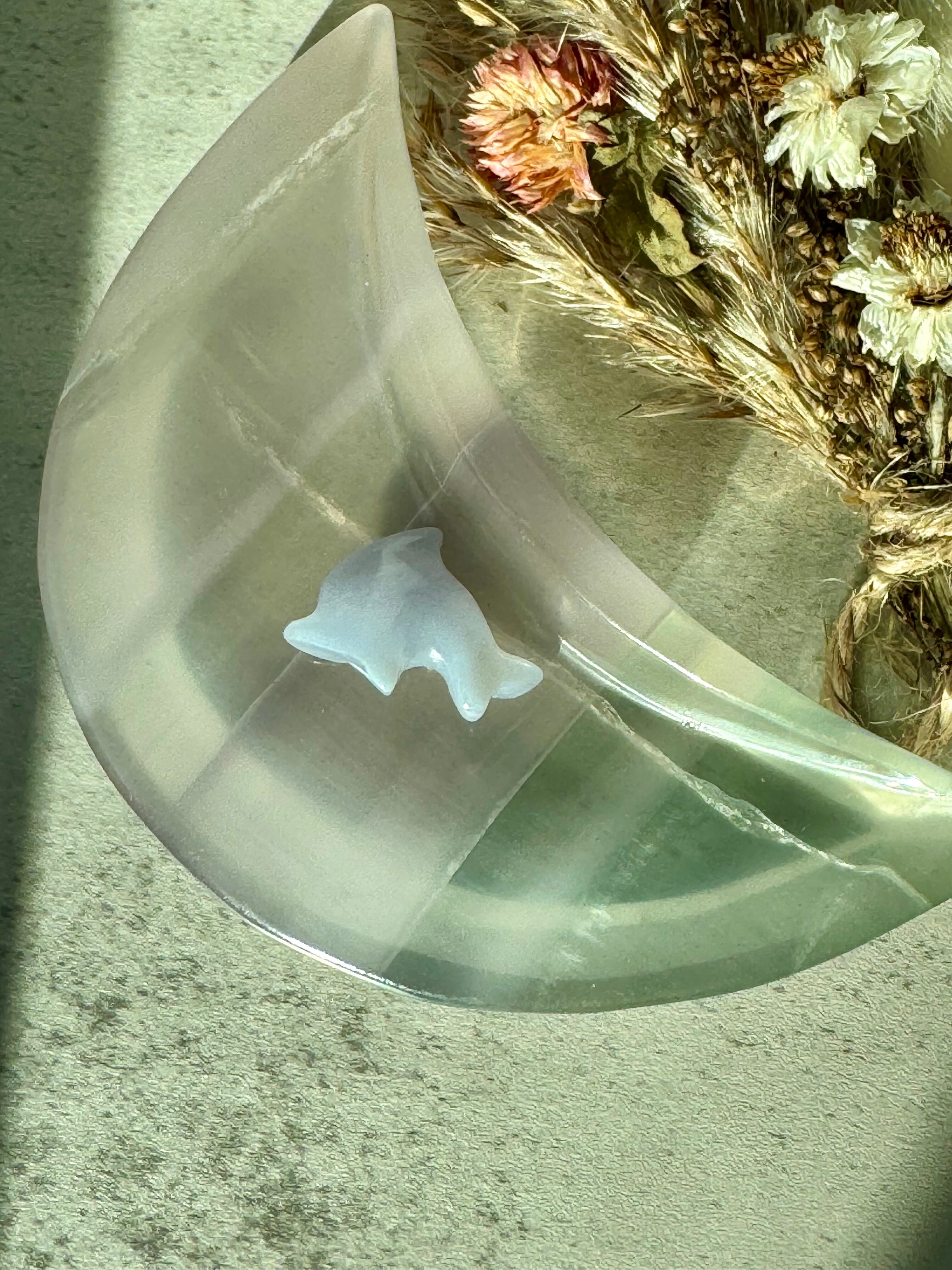 淡いグリーンとパープルのボーダーカラーが綺麗な三日月のフローライトボウルと、レースアゲートのイルカ、ラブラドライトハート、ルチルスフィアのセットです。