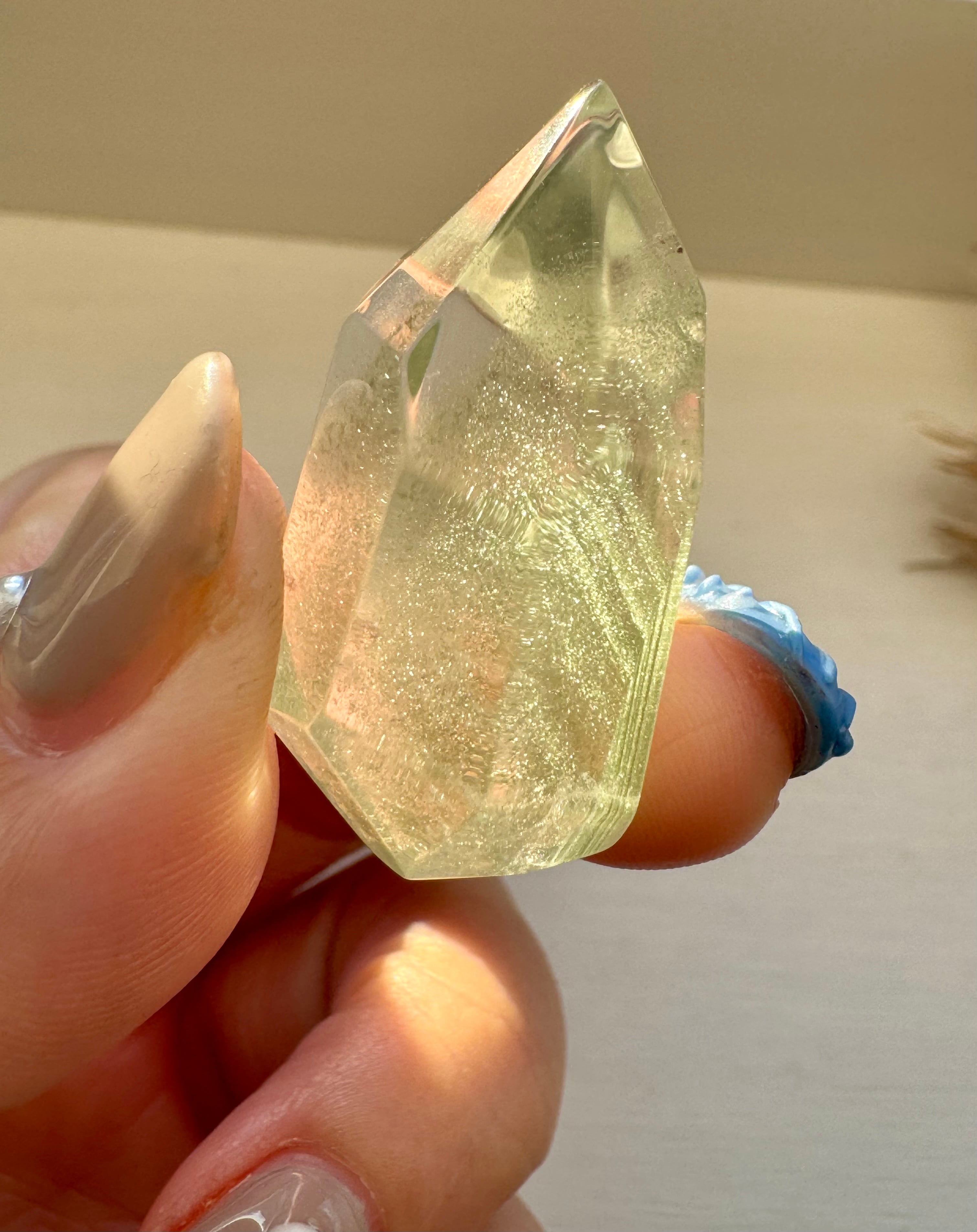 グリーンファントムクォーツのフリーフォームです。中のグリーンがキラキラ綺麗で繊細な景色が見られます。独立して立たせる事も可能です。