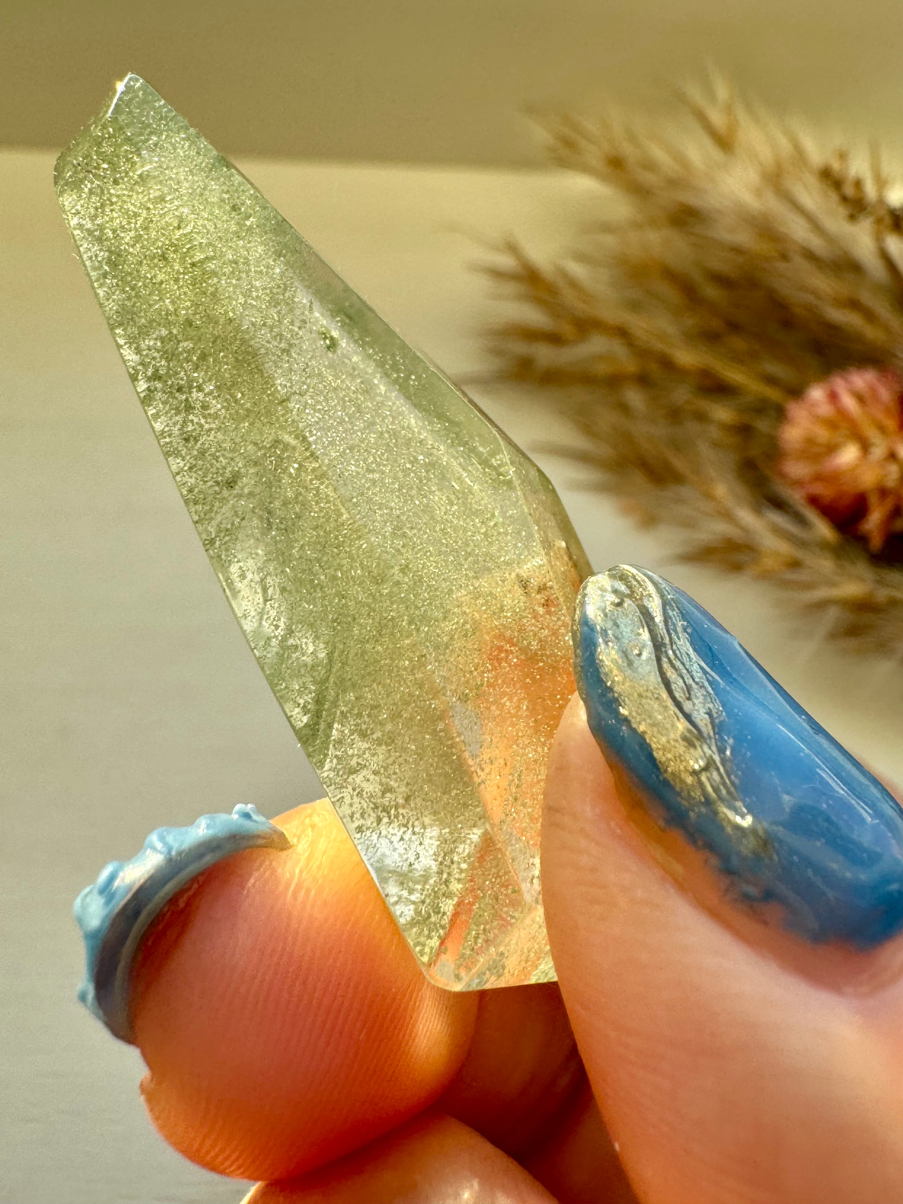 グリーンファントムクォーツのフリーフォームです。中のグリーンがキラキラ綺麗で繊細な景色が見られます。