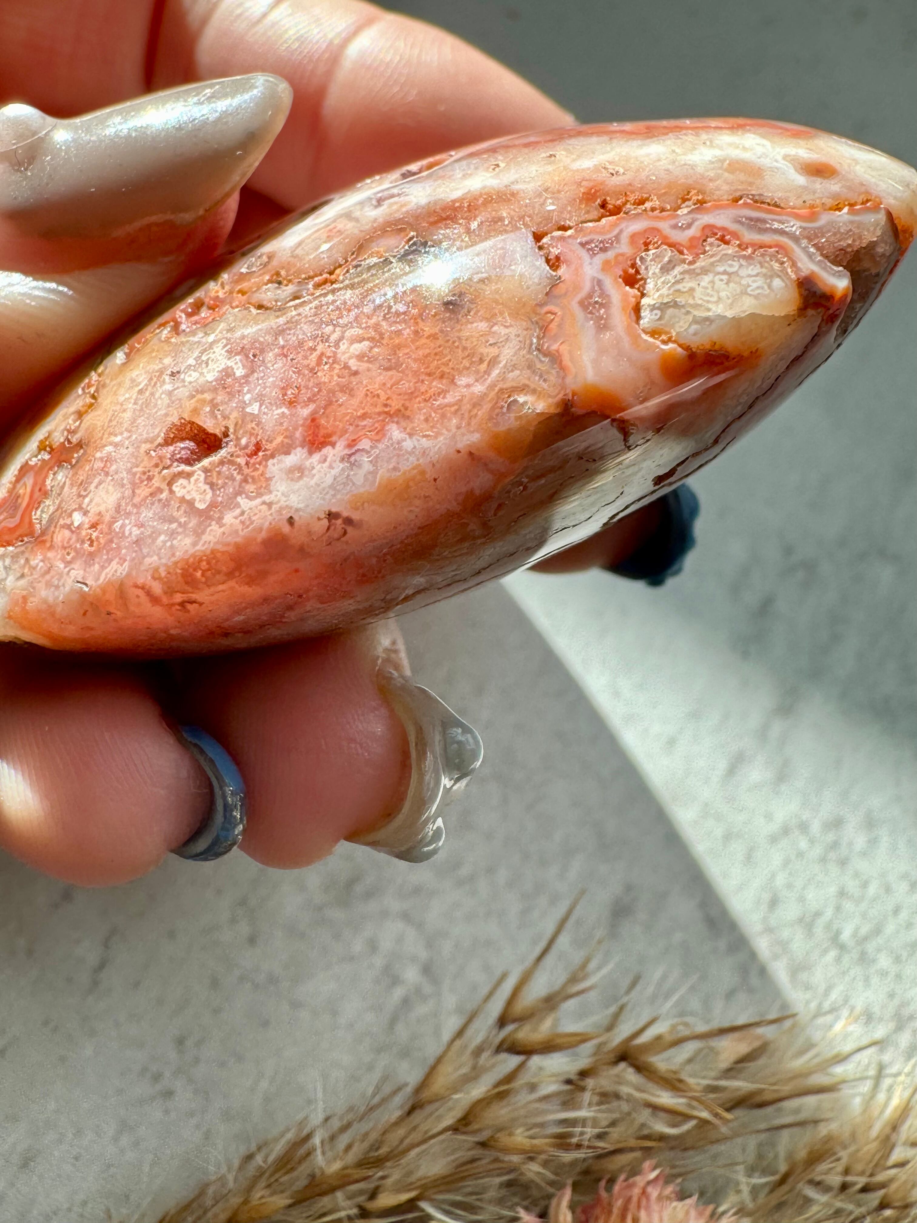 メキシカンクレイジーレースアゲートのパームです。キラキラ光るドゥルージーもあります。幾重にも重なる縞模様が美しいアート作品のようです。それぞれが唯一無二なレース模様です。