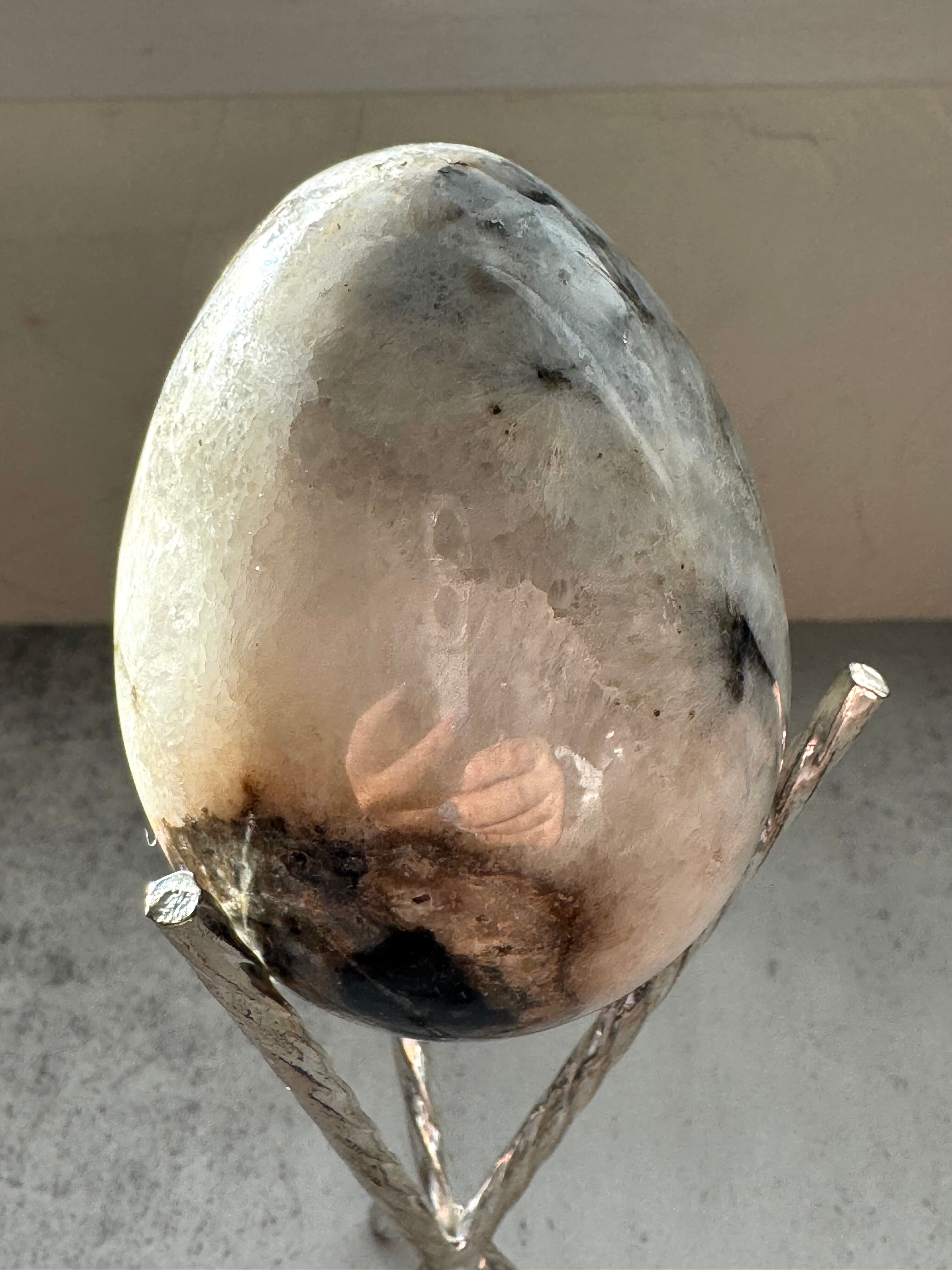 グレーやホワイト、ブラックのニュアンスカラーが素敵なドゥルージーアゲートの卵です。水晶のシャリシャリ感が繊細で可愛いアゲートです。光に透かすとキレイなアゲートの質感が楽しめます。独立して立てる子です。