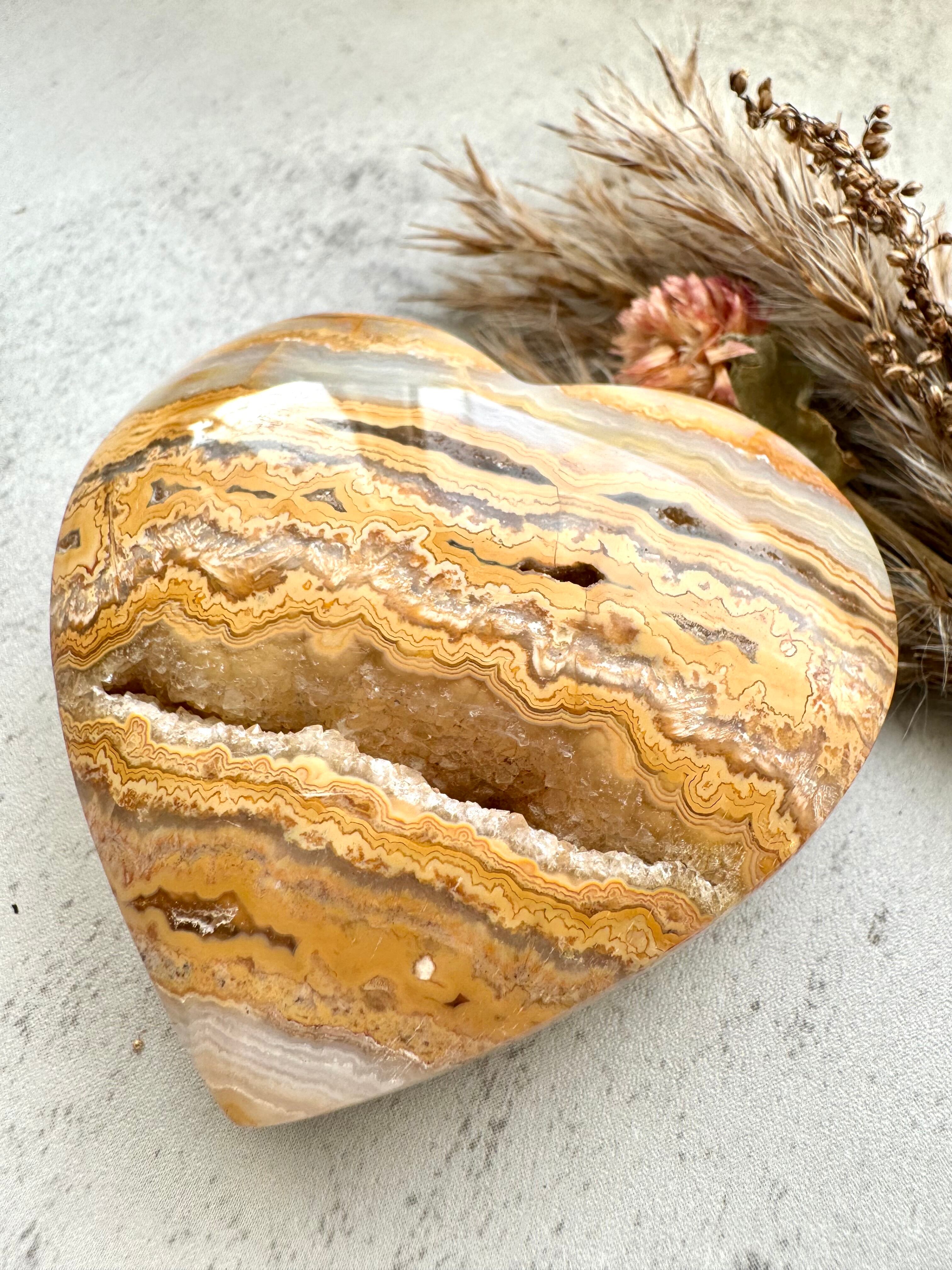 ドゥルージーが綺麗なメキシカンクレイジーレースアゲートのハートです。幾重にも重なる縞模様が美しいアート作品のようです。それぞれが唯一無二なレース模様。
