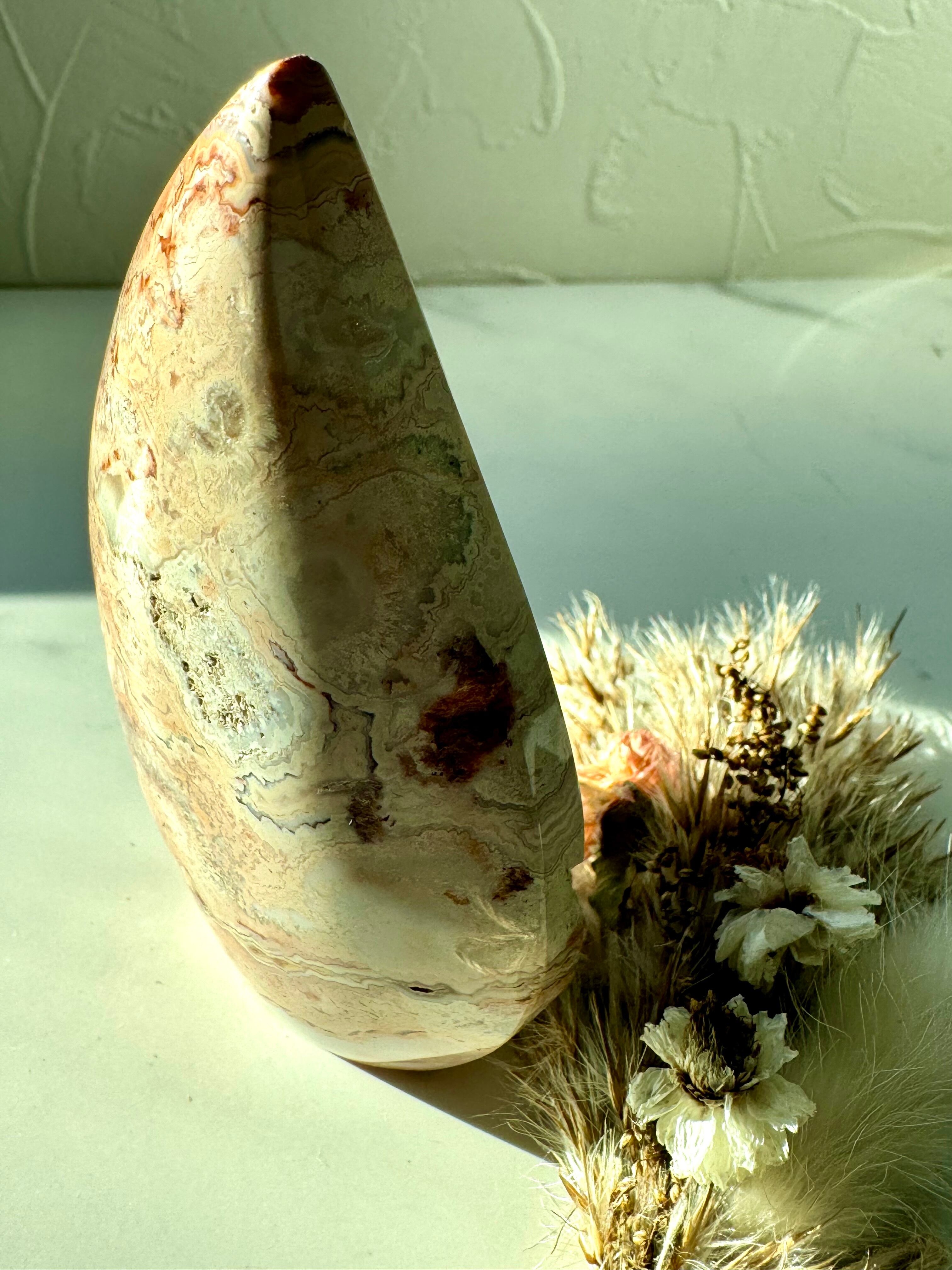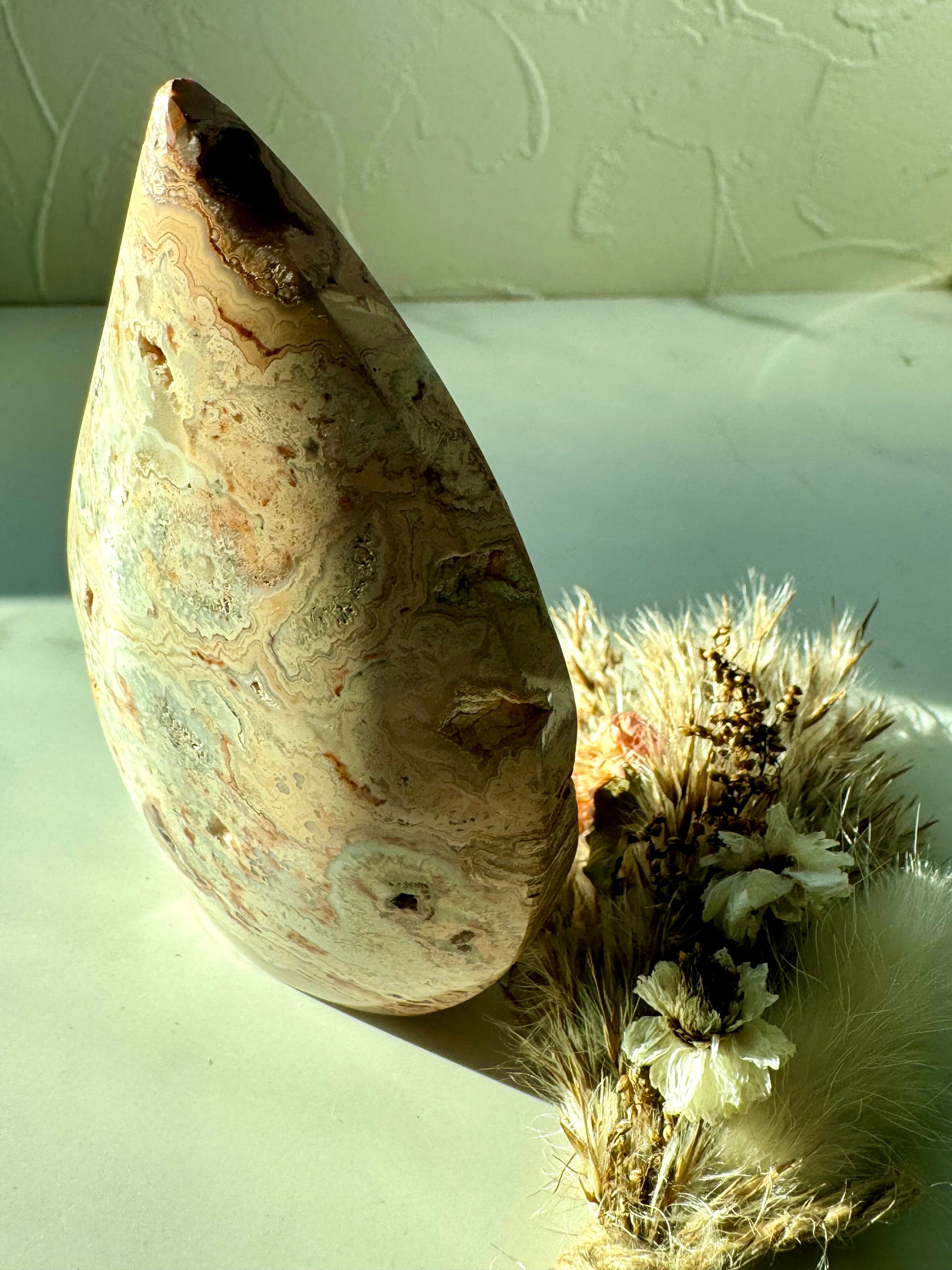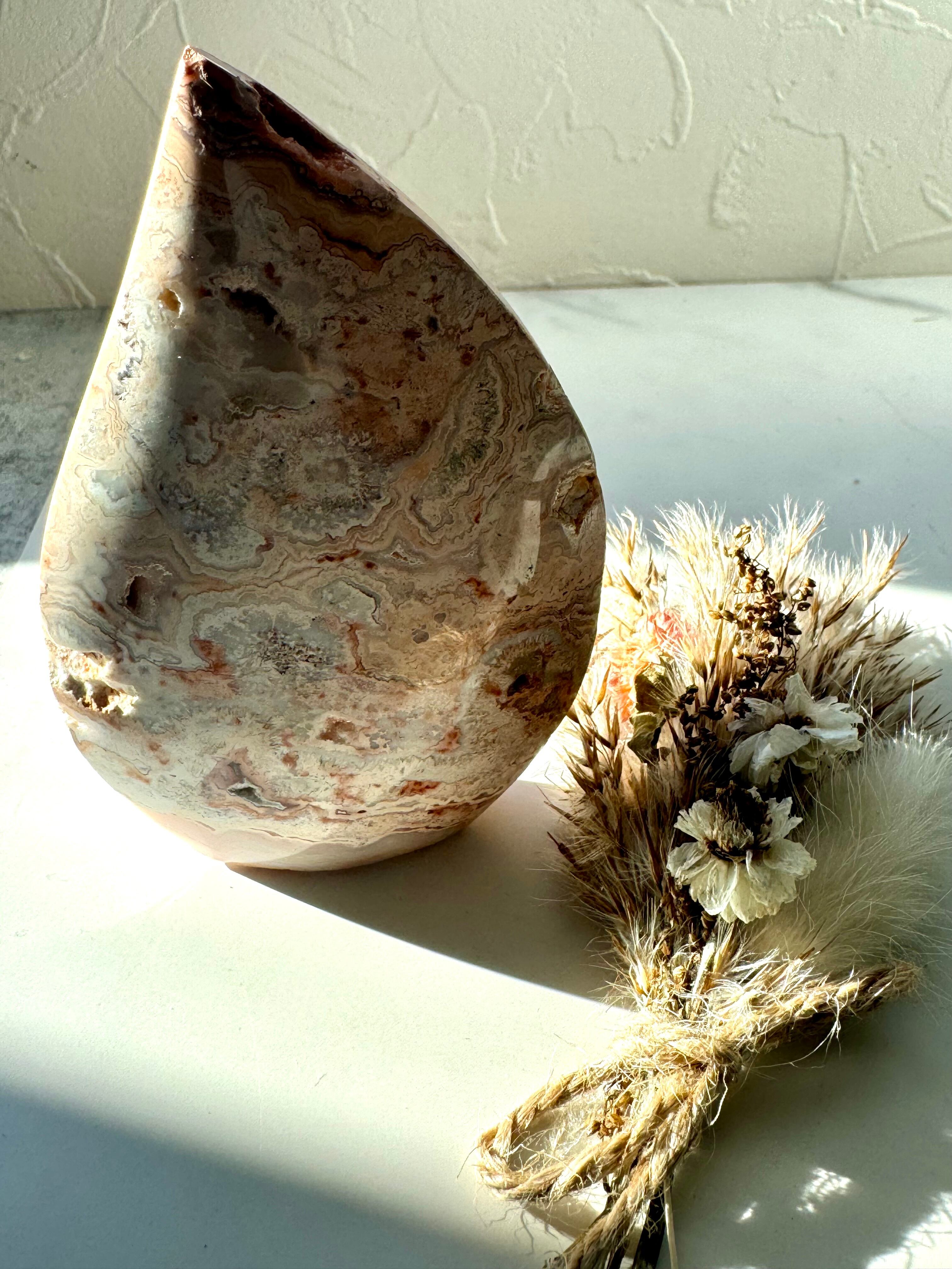 メキシカンクレイジーレースアゲートのフリーフォームです。幾重にも重なる縞模様が美しいアート作品のようです。それぞれが唯一無二なレース模様、形も雫型みたいで愛らしいです。キラキラ光るドゥルージーも素敵。