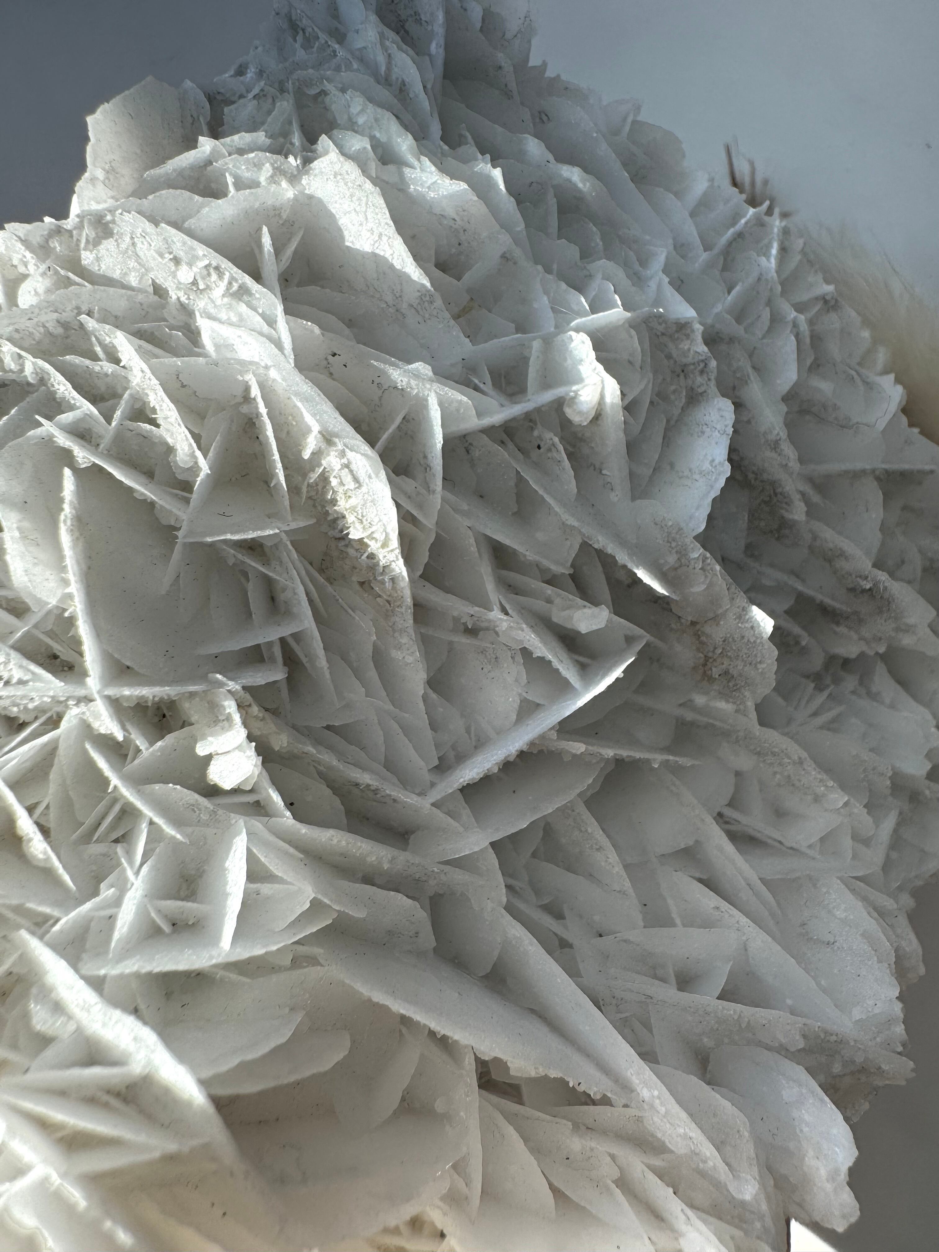 特徴のある茶色い鉄の衣をまとった水晶の上に雪が積もったように覆っています。