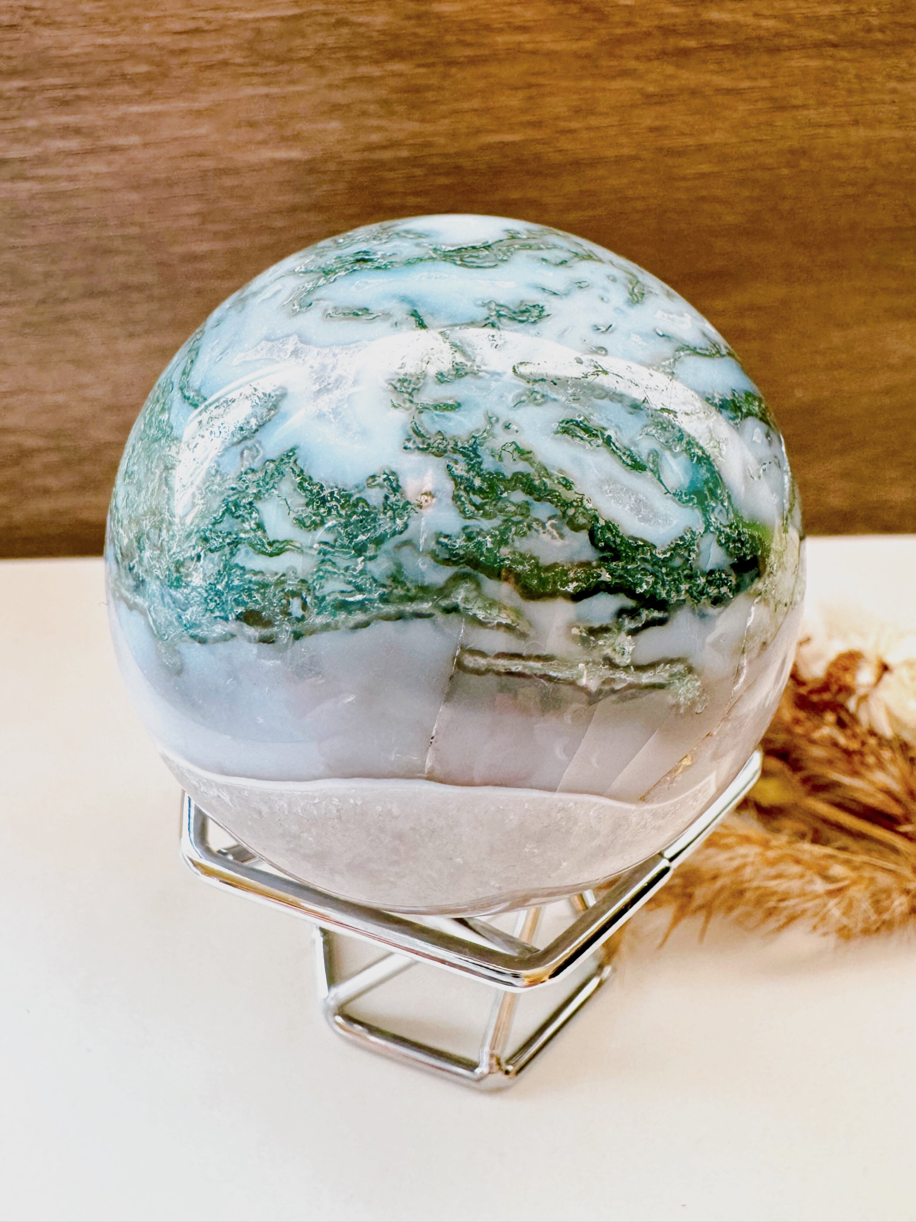 アゲートの模様が可愛い、モスアゲートのスフィアです。水晶がたくさん見えるドゥルージーもあります。インテリアやアクセサリーや天然石の浄化など、自由な発想でお使いください。