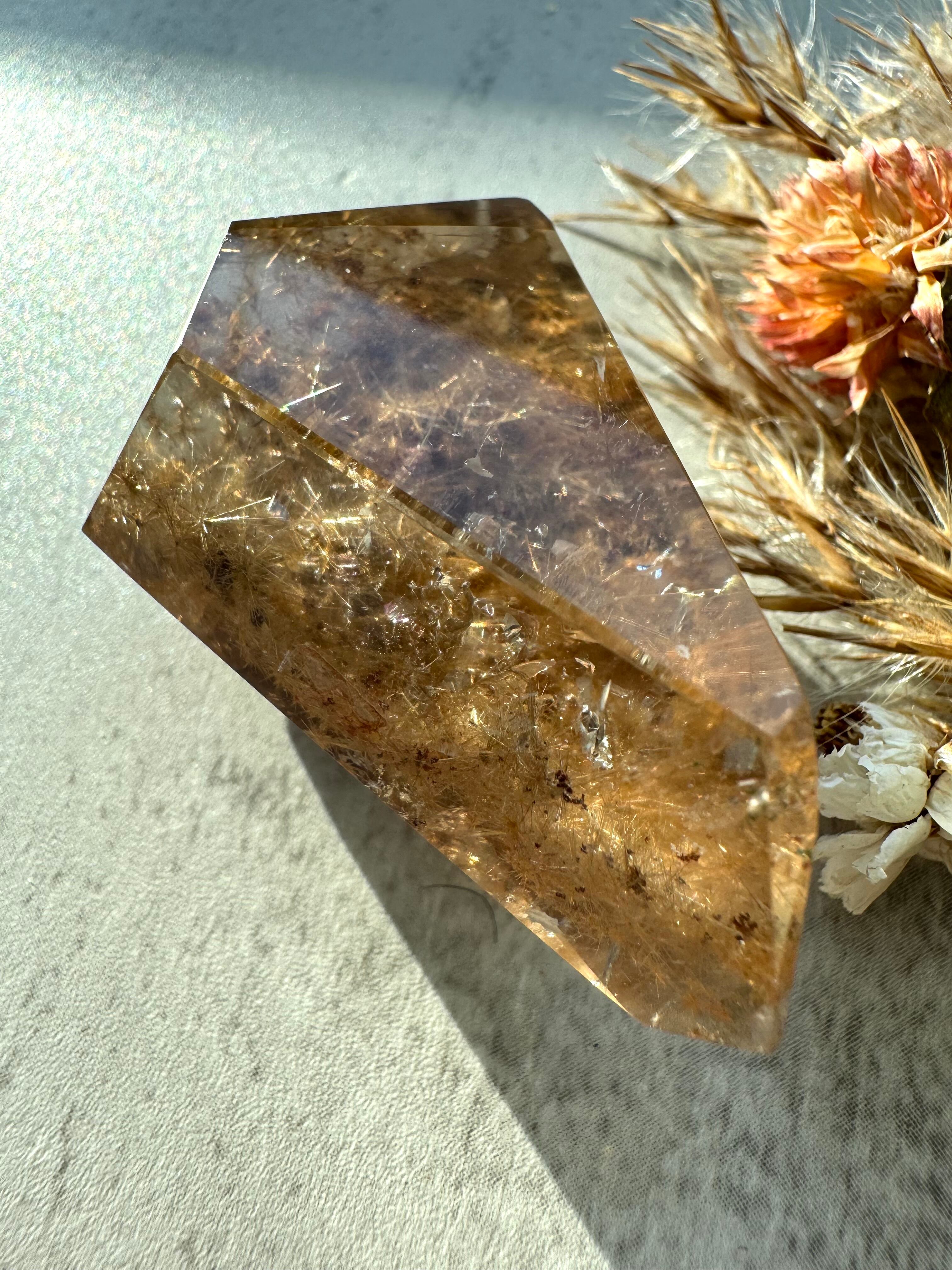 レアなフラワールチルクォーツです。透明度の高い水晶に花咲くルチルはまるで妖精が住む湖のようでとても神秘的です。虹も見られます。