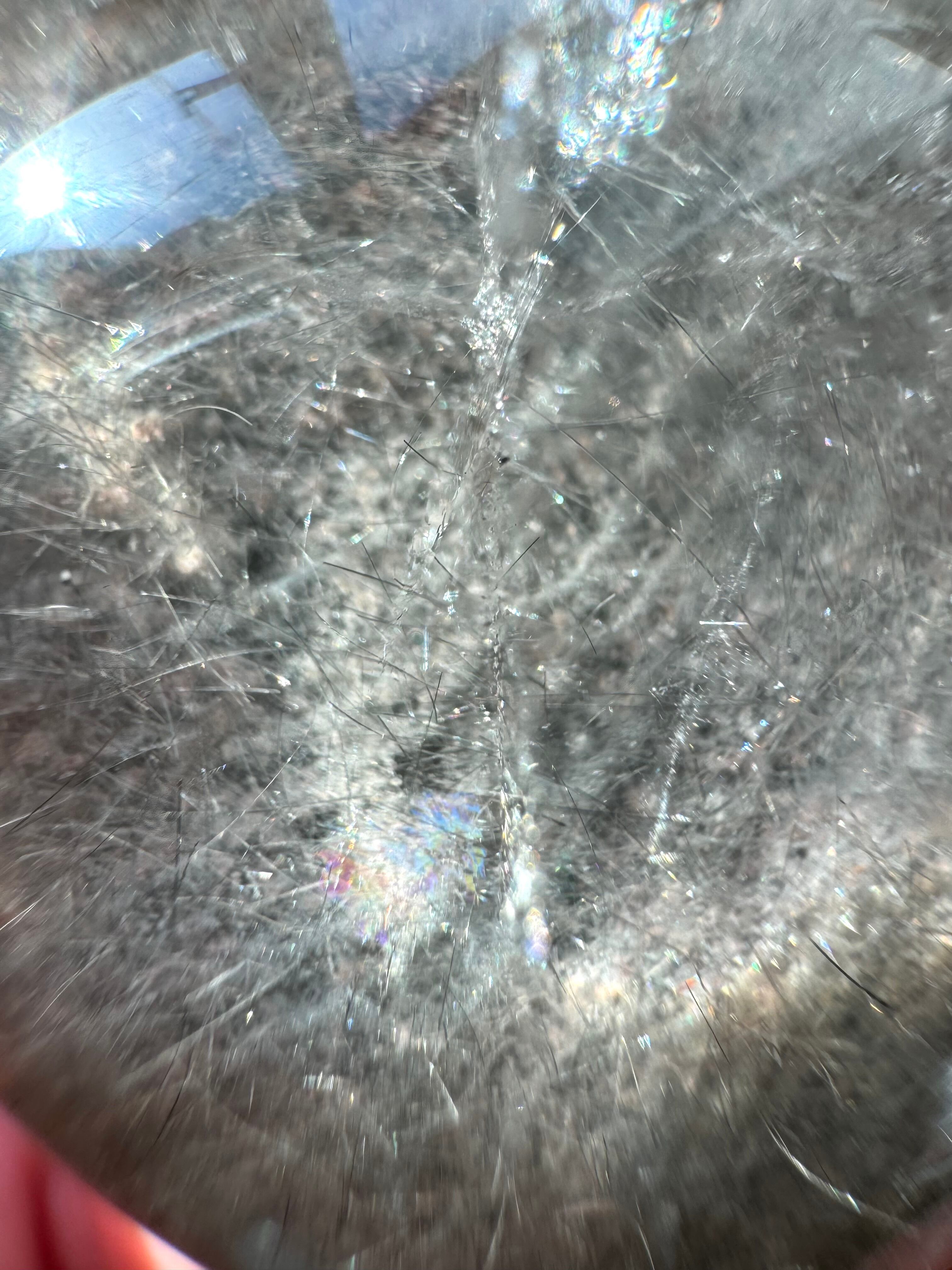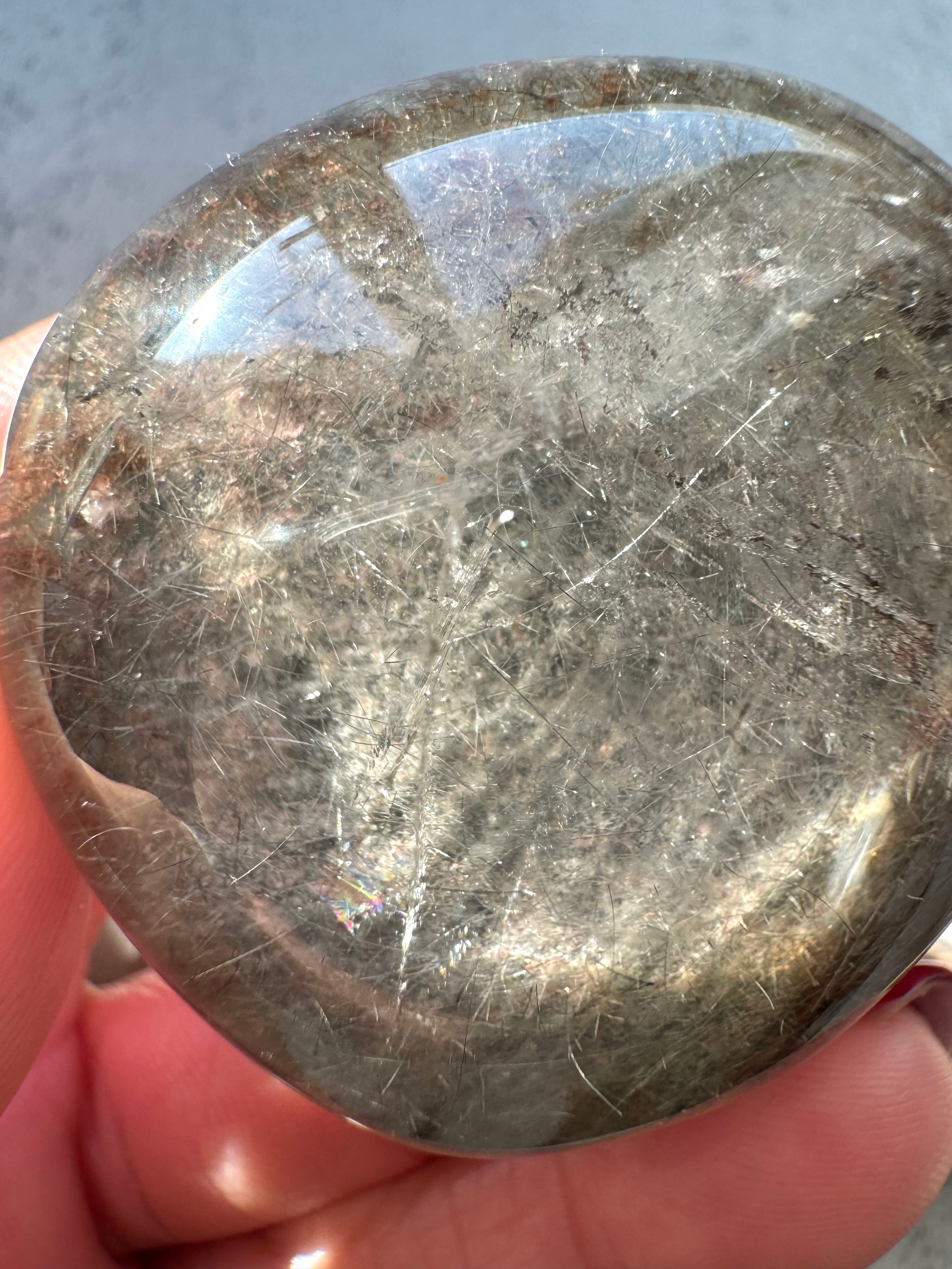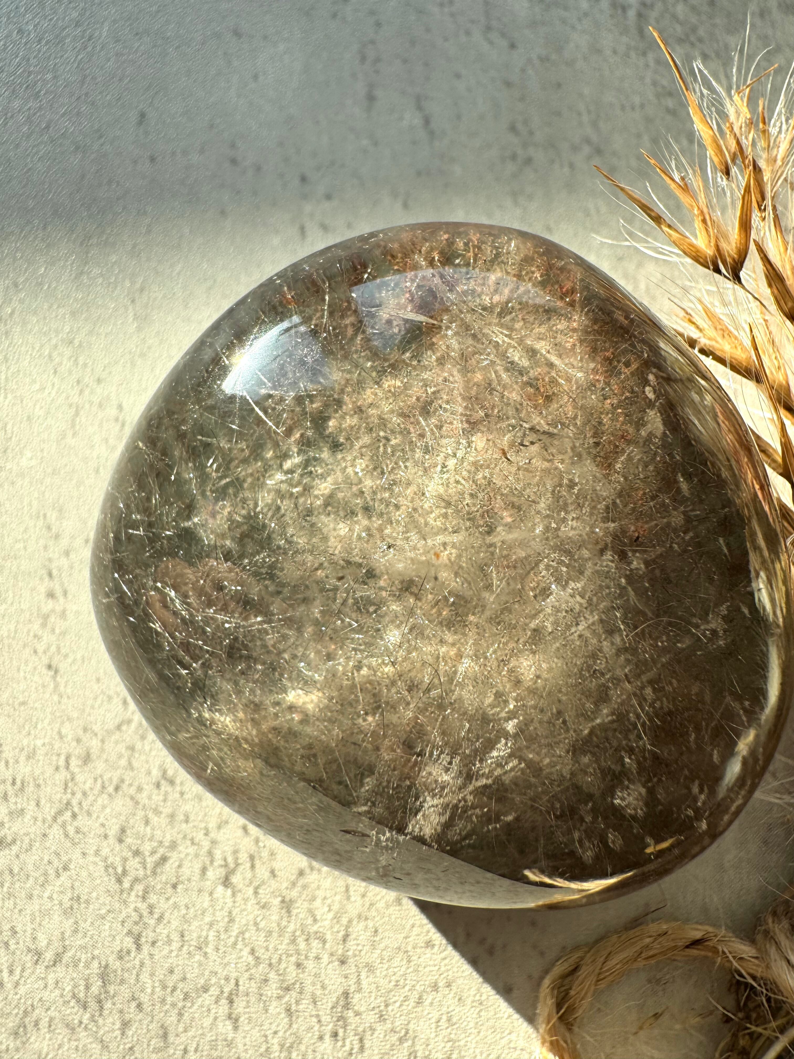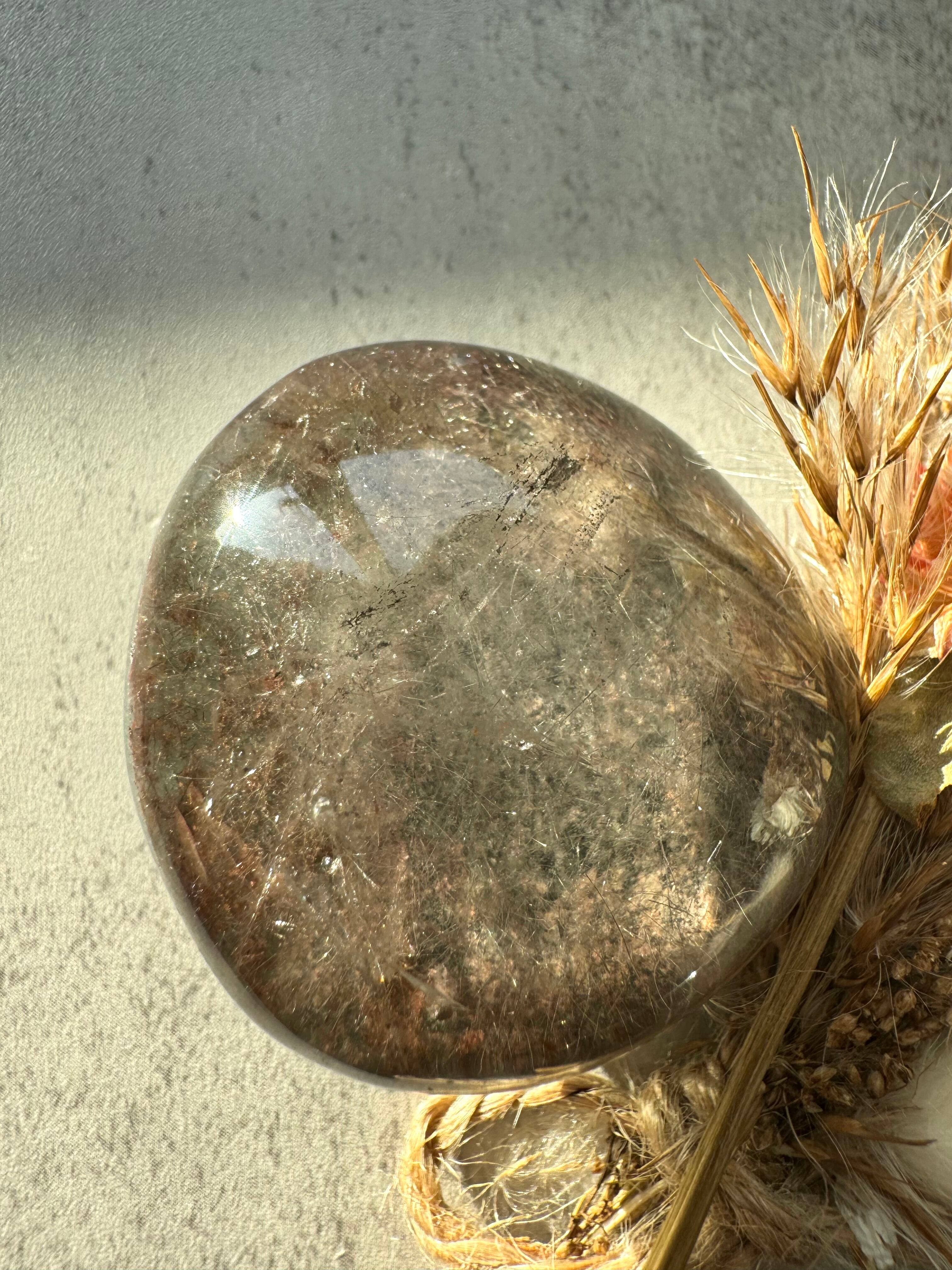 透明な水晶の中にガーデンとルチルが共生しているレンズです。