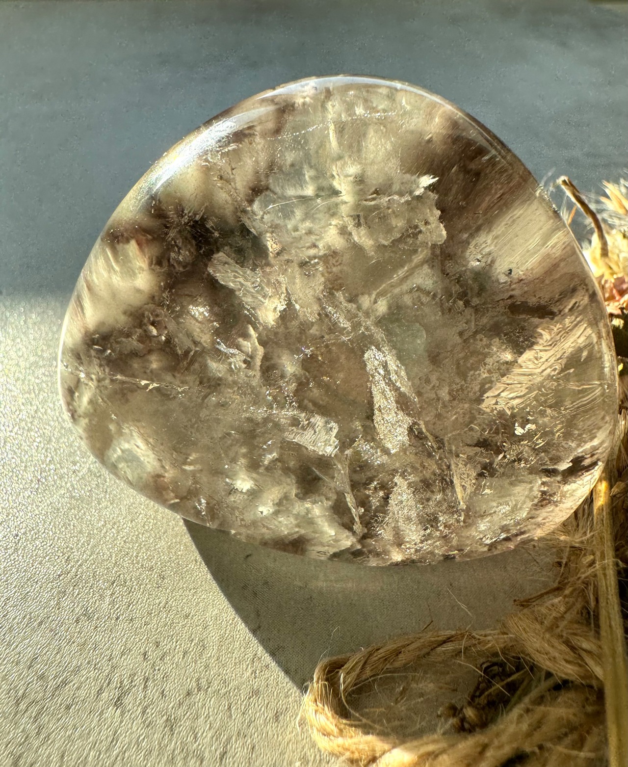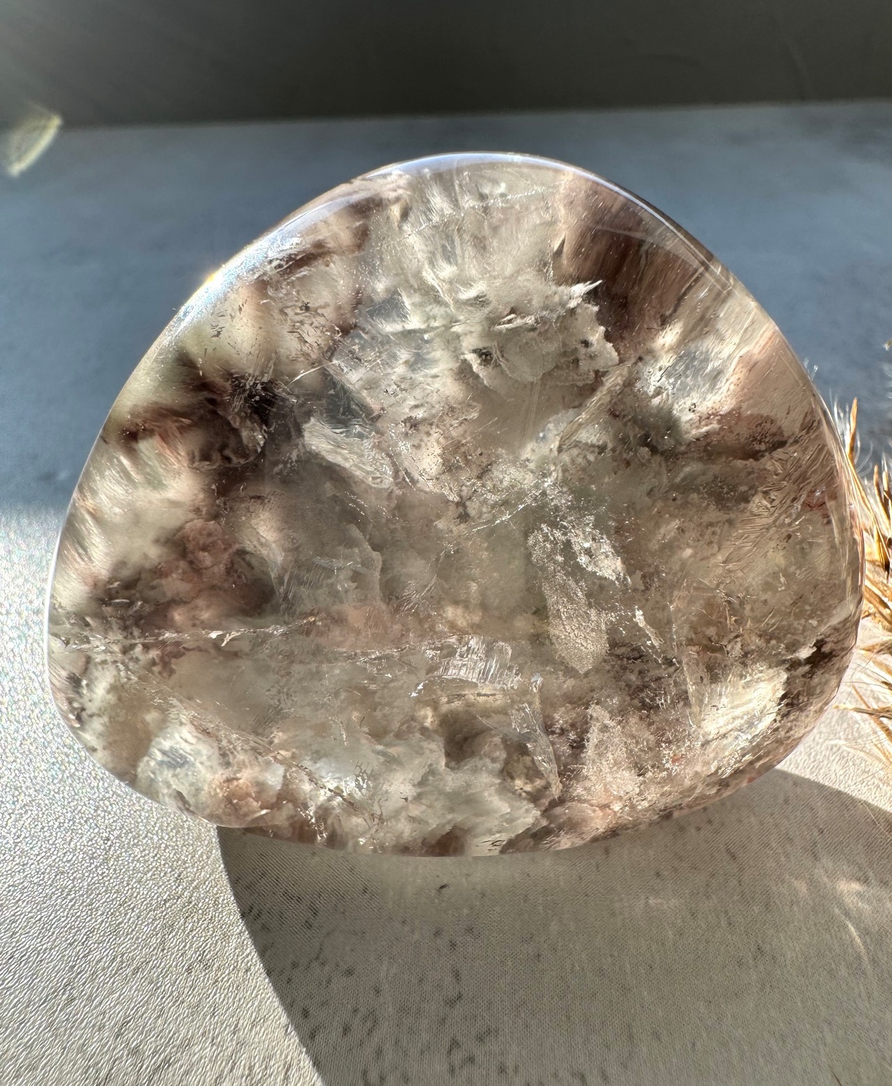 透明な水晶の中に千層ガーデンが綺麗なレンズタイプです。