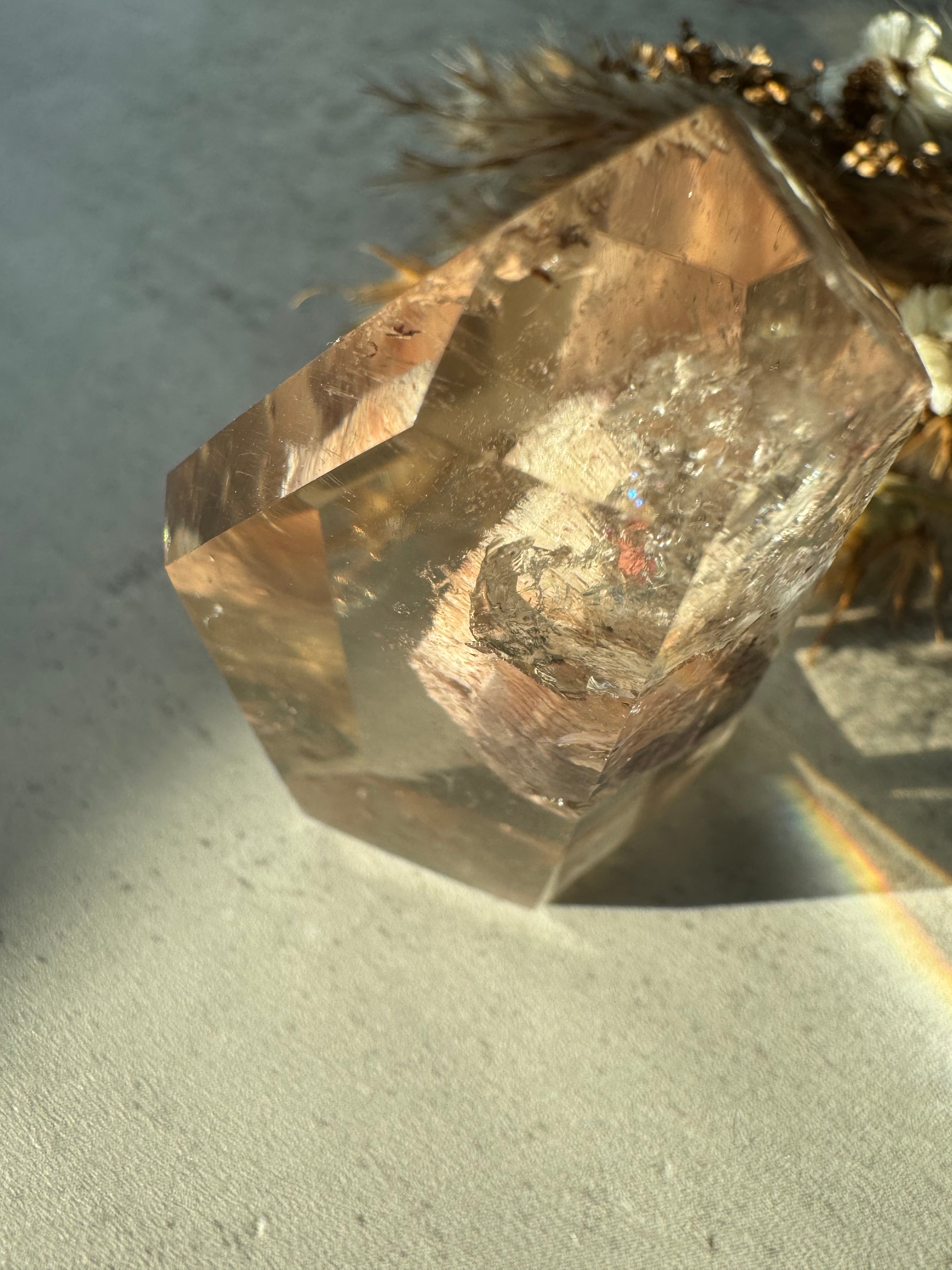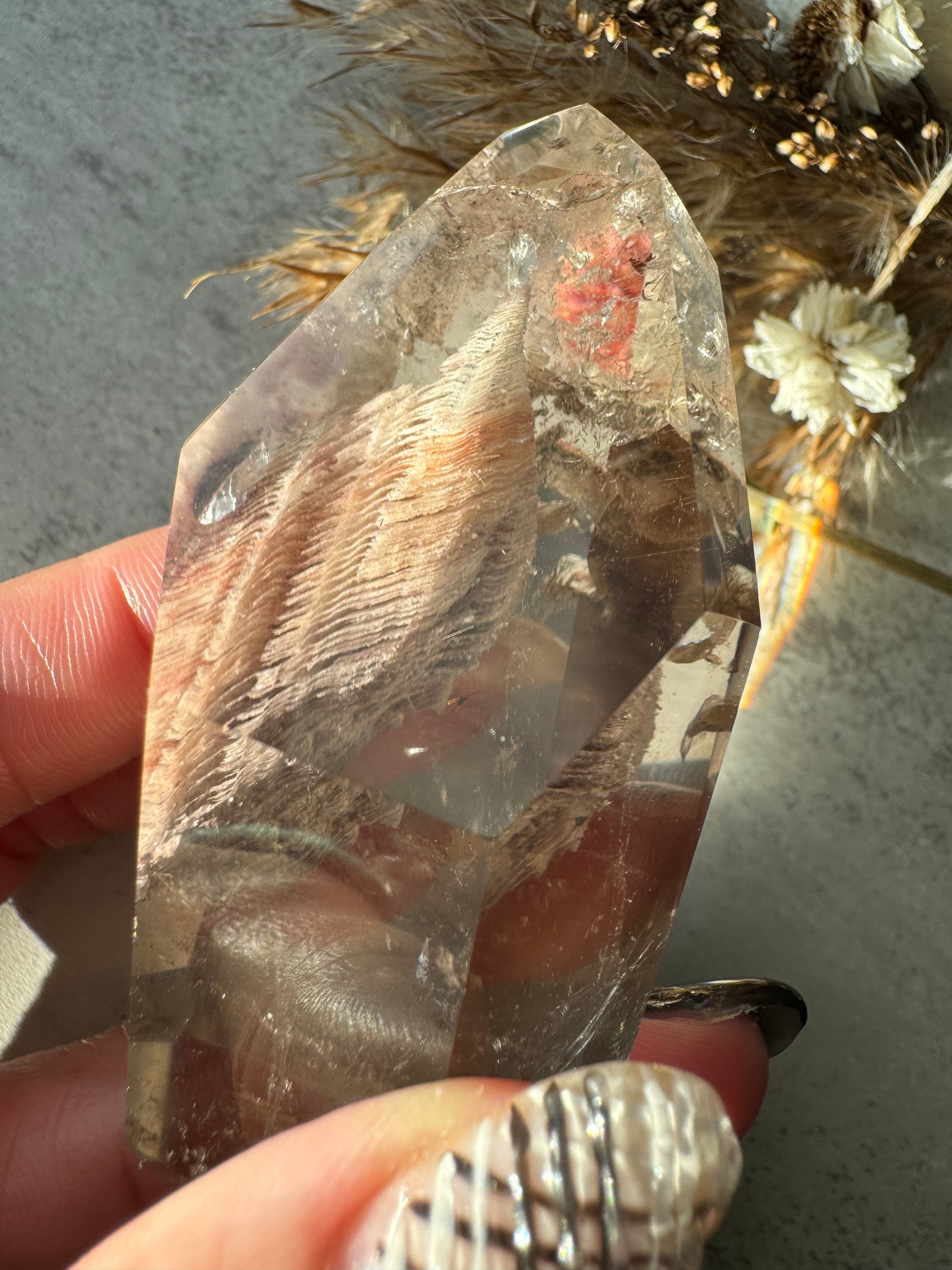 ピンクの稲妻を閉じ込めたような躍動感ある内包物にパワーを感じます。虹やルチルも見られます。