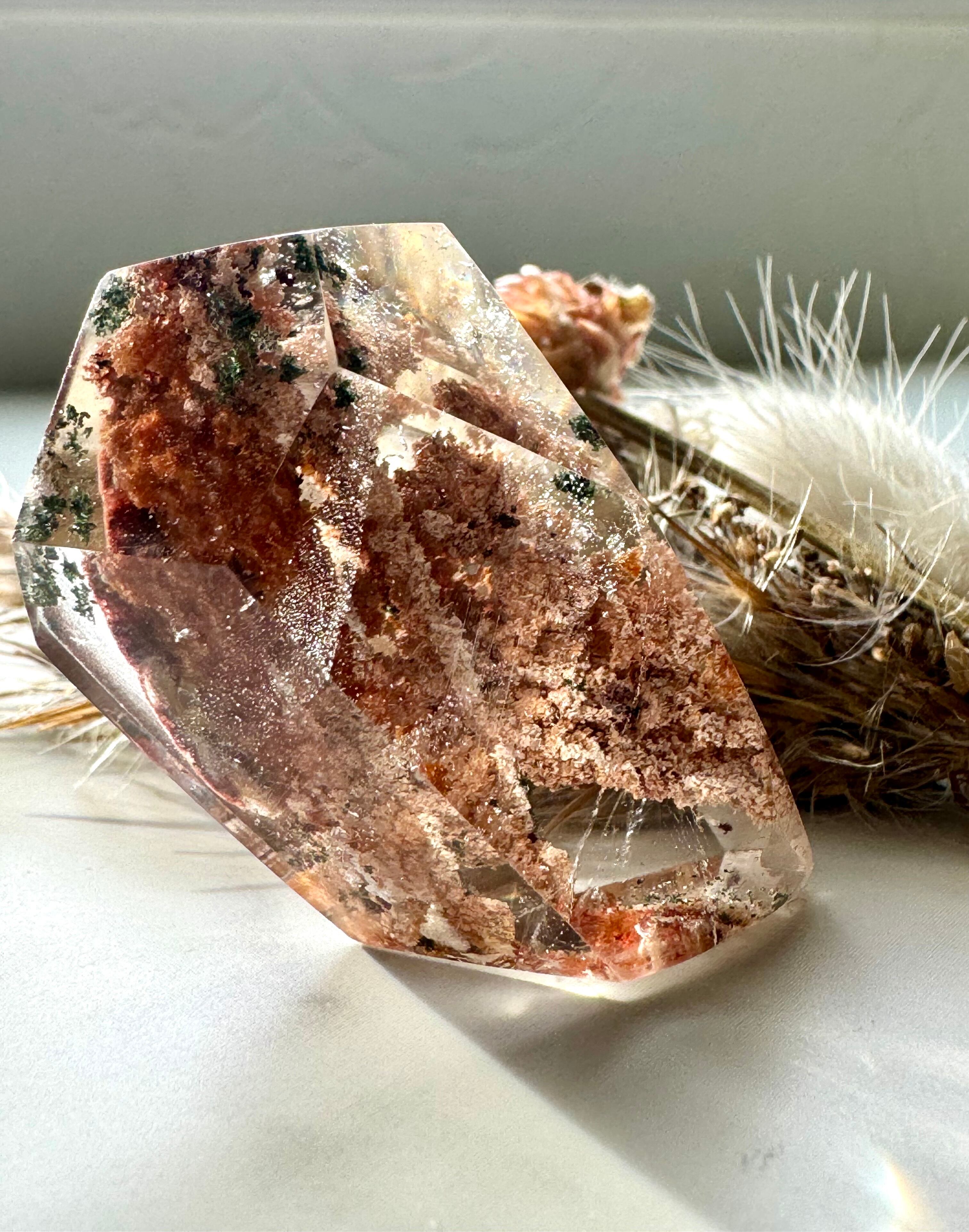 ガーデンクォーツは水晶が形成される過程で、緑や茶色の鉱物を巻き込みながら結晶した水晶です。水晶の中に自然の風景を閉じ込めらたように見えるため、「庭園水晶」や「苔入り水晶」とも呼ばれます。石の中に見える風景は実に様々で、内包物の状態や色によって、山や川、野原や森林などを連想させてくれます。