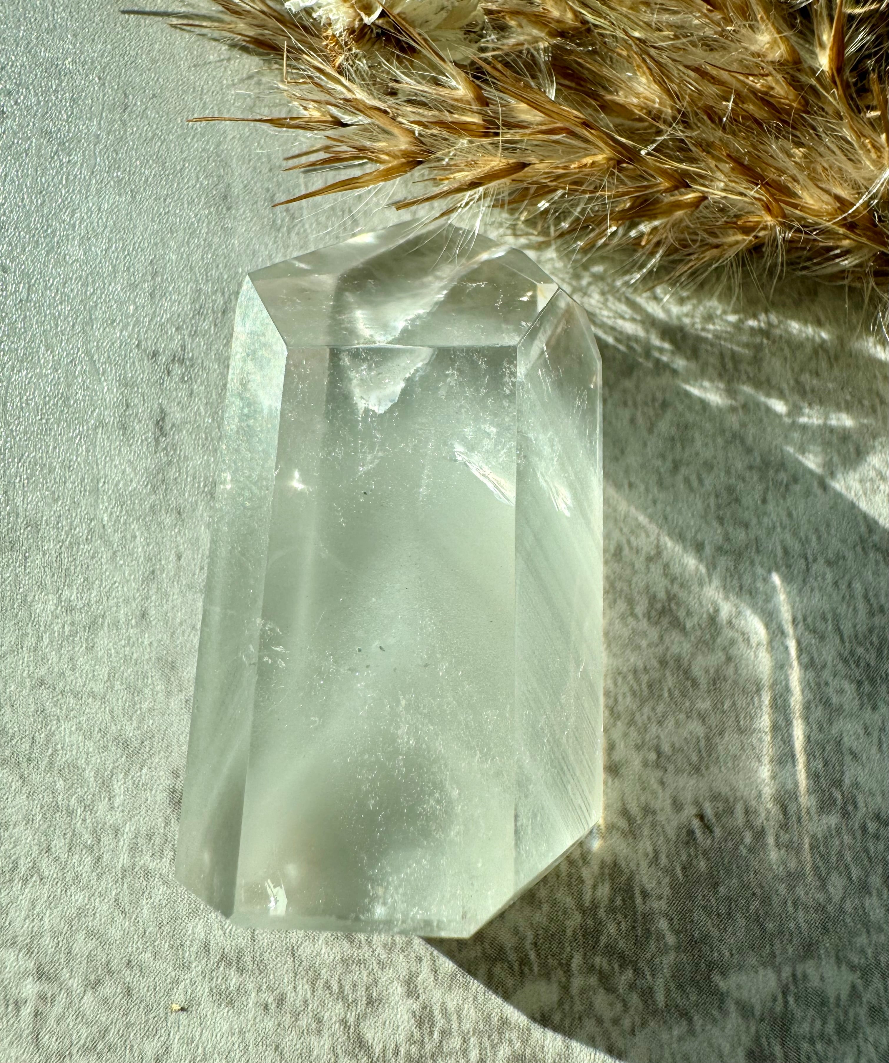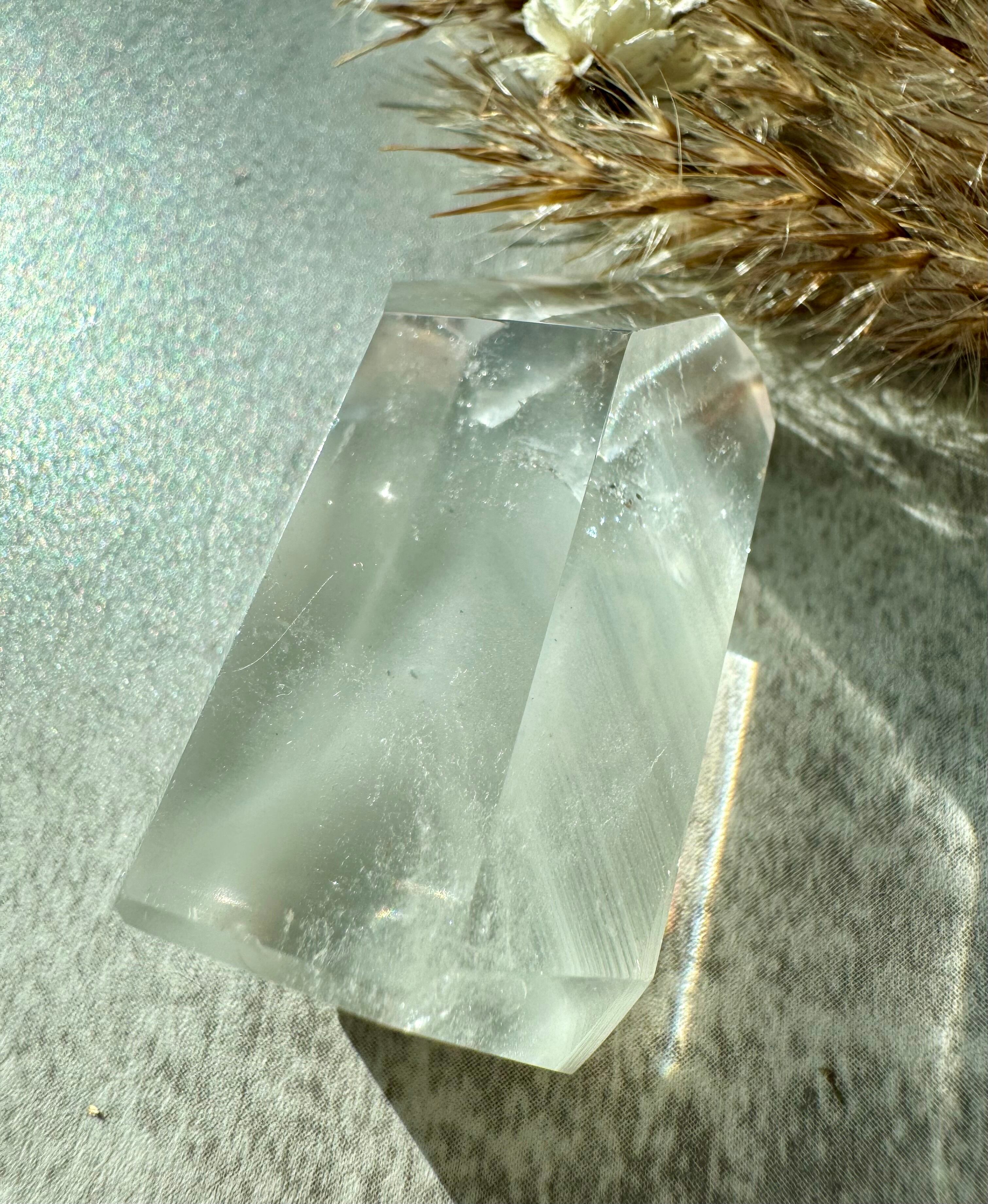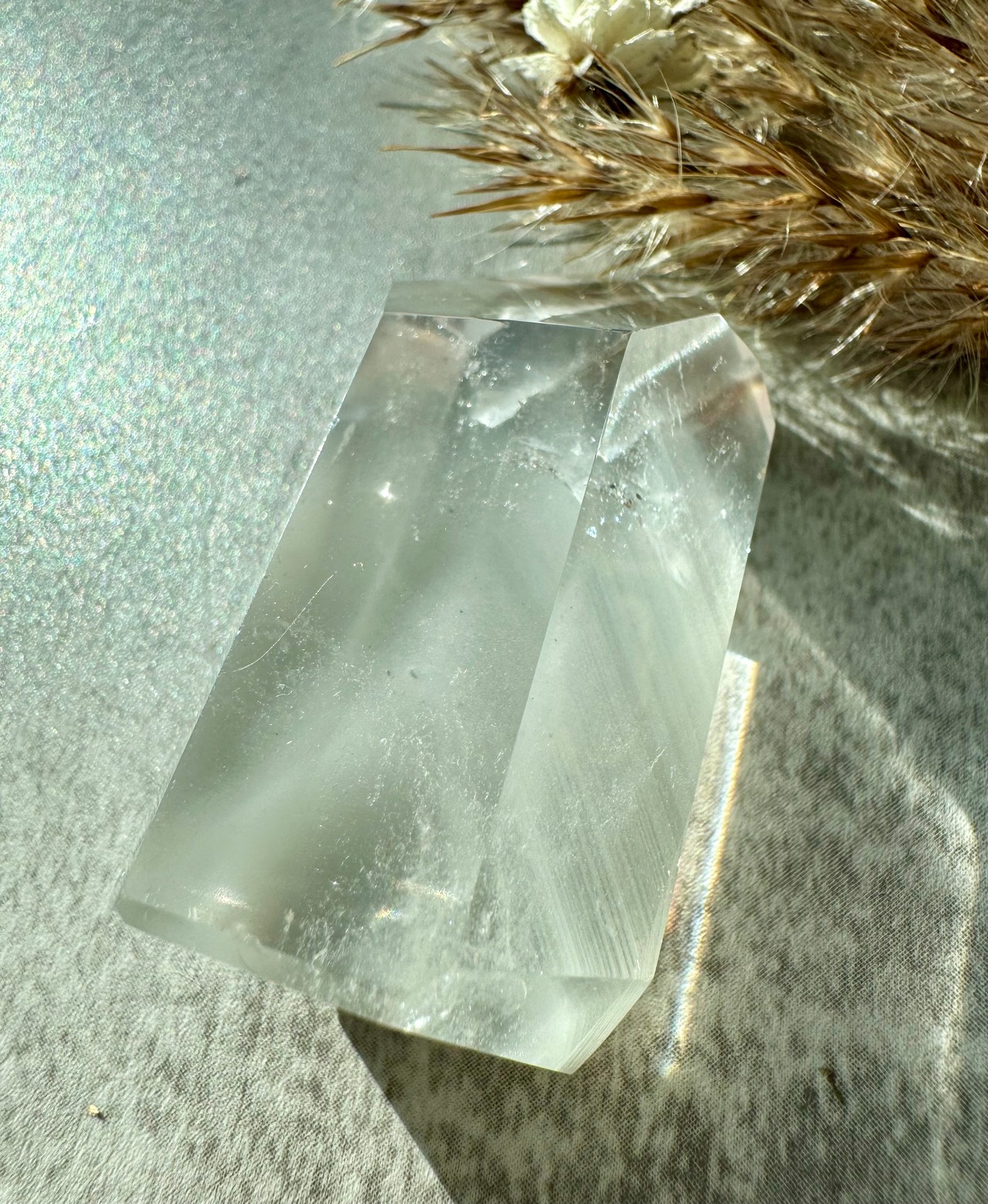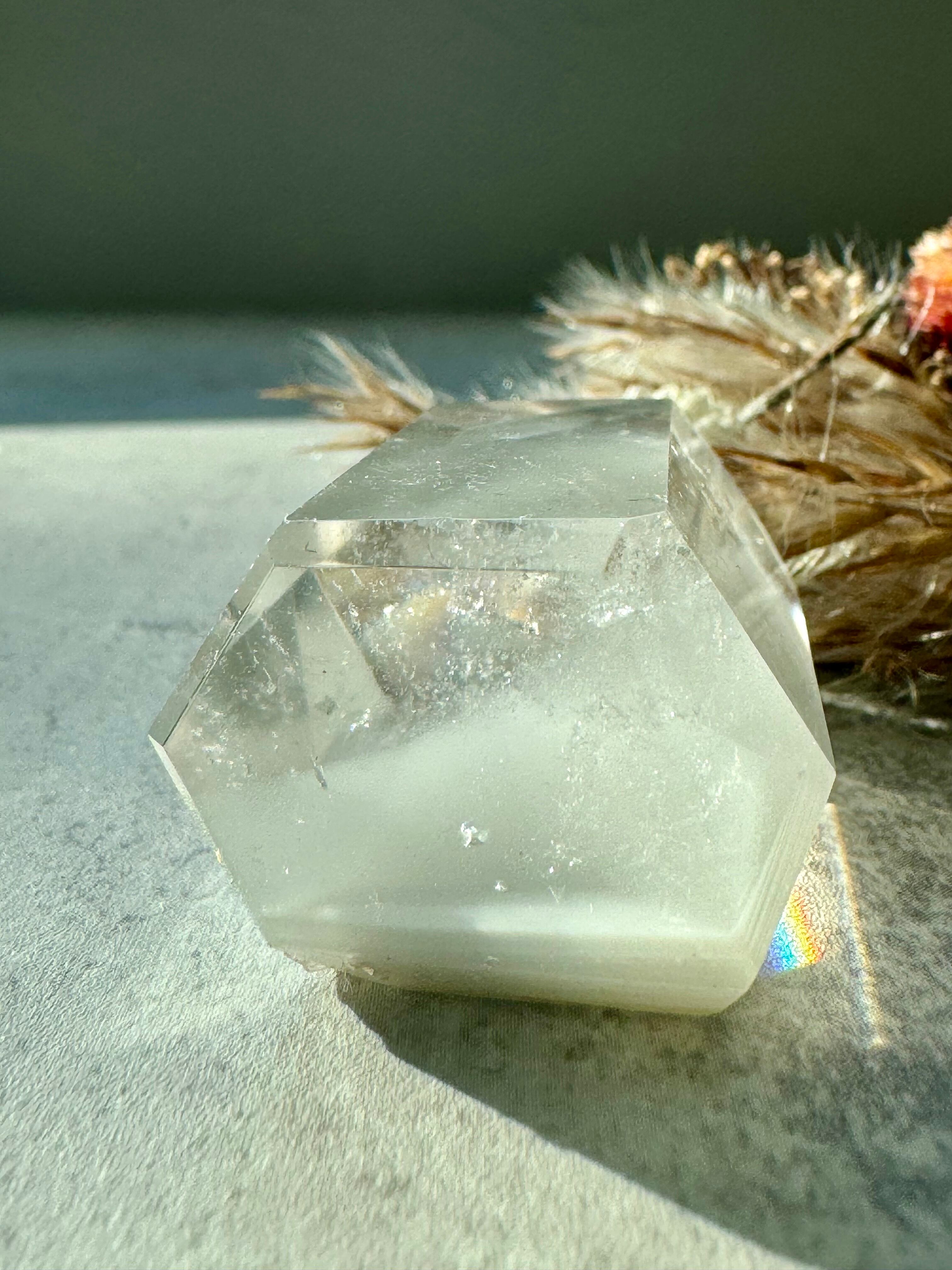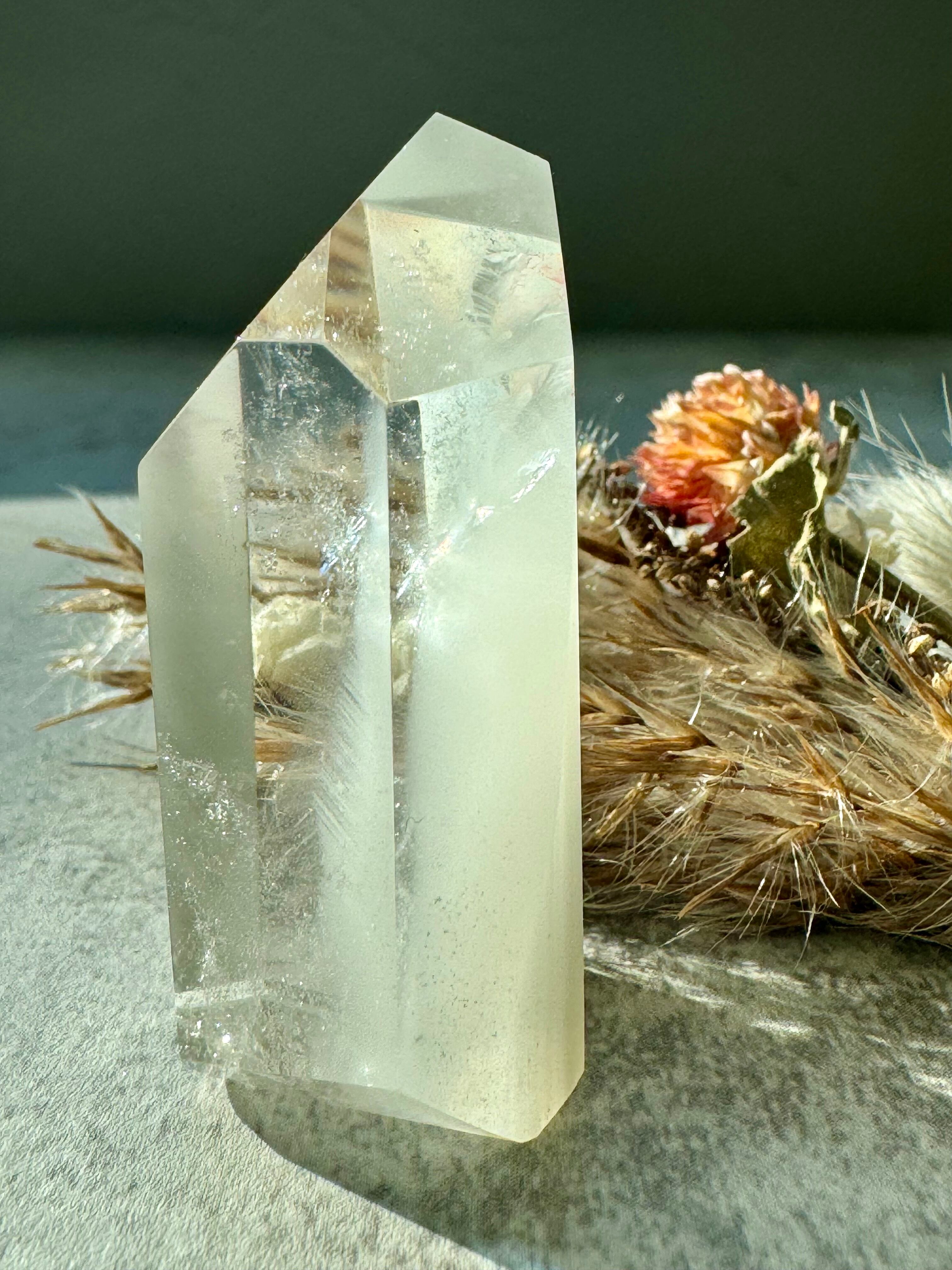 透明度の高いクォーツから見える優しい色合いが素敵なグレーファントムクォーツです。少しもブレずに優しく見守ってくれるファントムと虹がとても幻想的です。